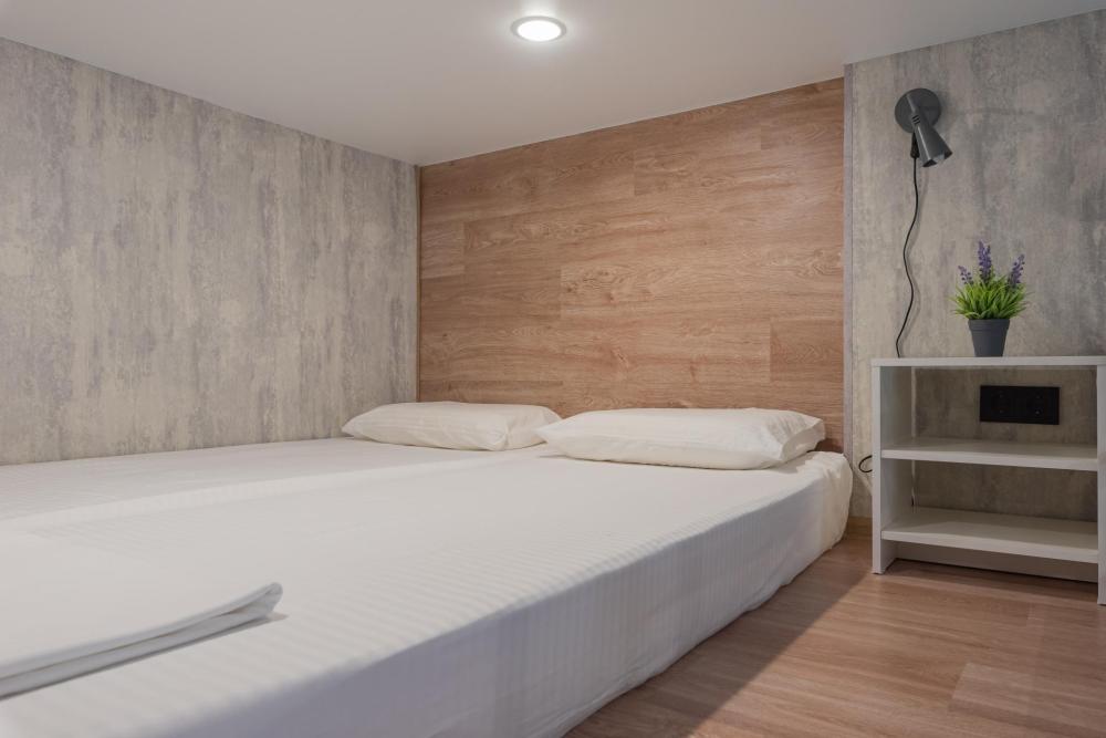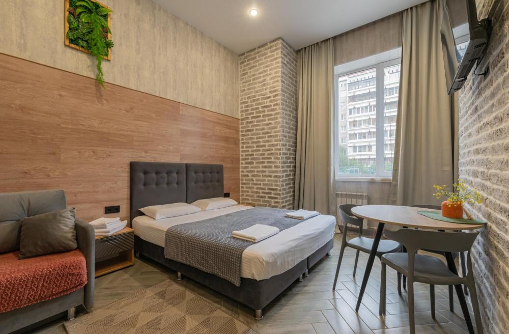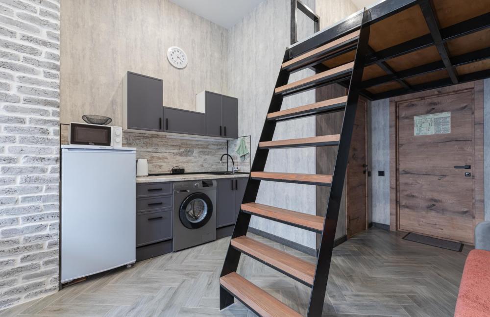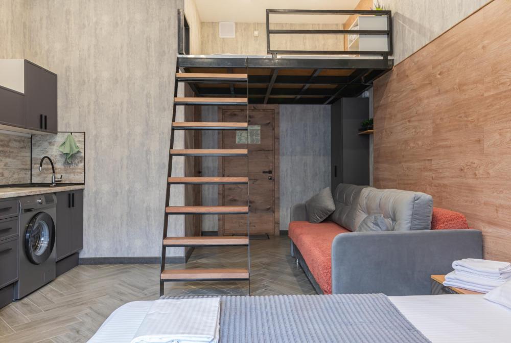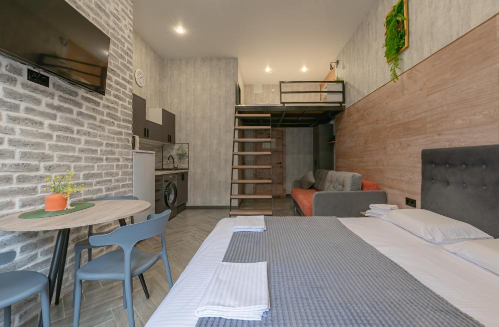 Двухуровневый Семейный номер для 4 гостей с мини кухней. В номере есть холодильник, микроволновая печь, чайник, чай, сахар и удобствами в номере. Спальные места: диван и 2 односпальные кровати на втором ярусе.