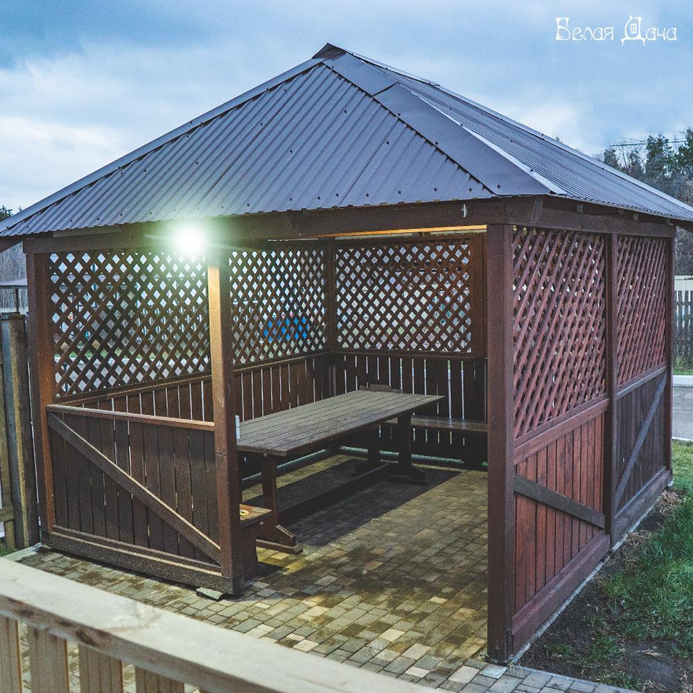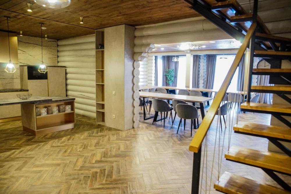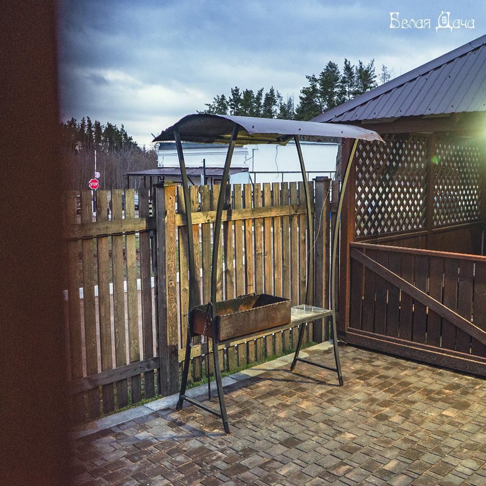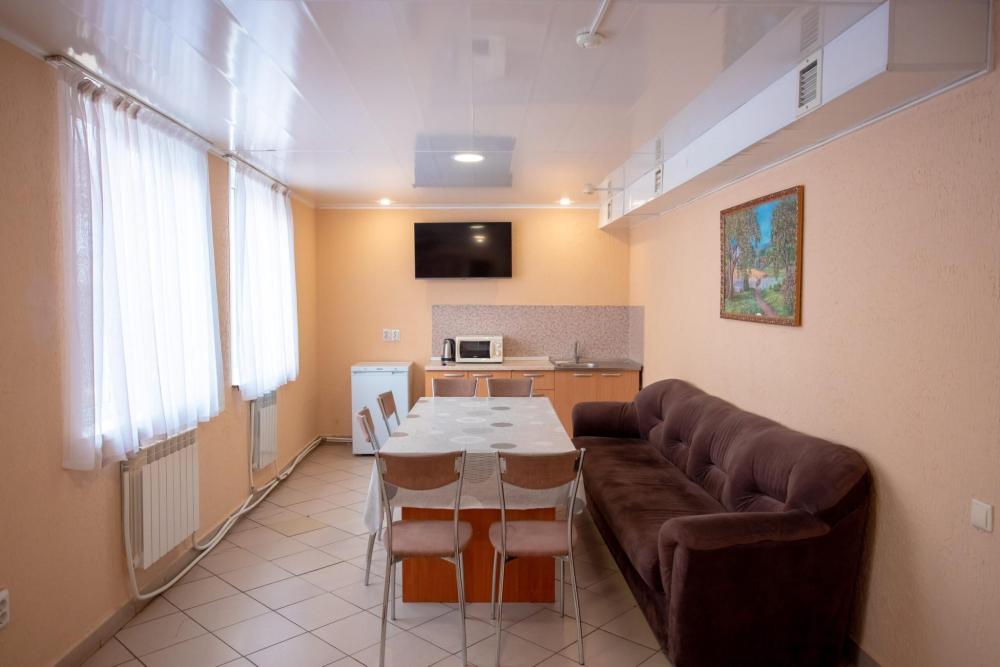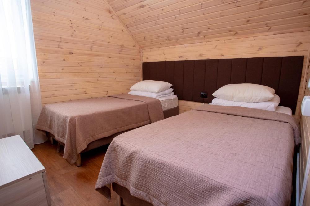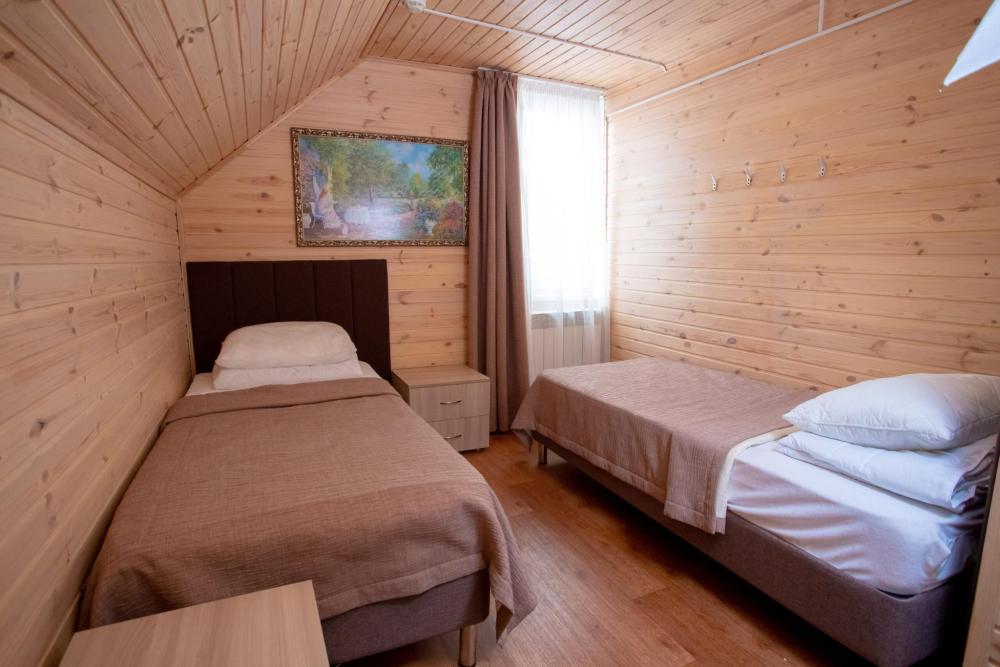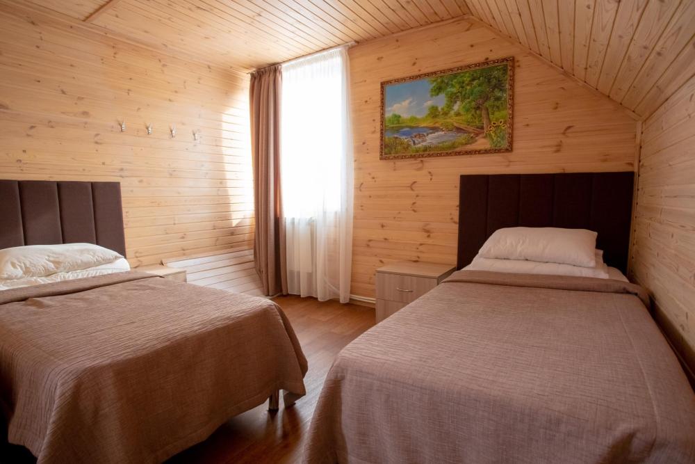 Трехэтажный дом класса Люкс № 2 и вместимостью до 30 посадочных мест. На первом этаже бассейн размером 3*3 м. «Финская» сауна, просторный банкетный зал, фарфоровая посуда на 30 персон, электрическая плита, микроволновая печь, чайник, холодильник, телевизор. На втором этаже четыре комнаты в каждой по одной двуспальной кровати, на третьем этаже есть 4 мягких пуфа, бильярд «Американка». Во дворе – беседка с мангалом.
