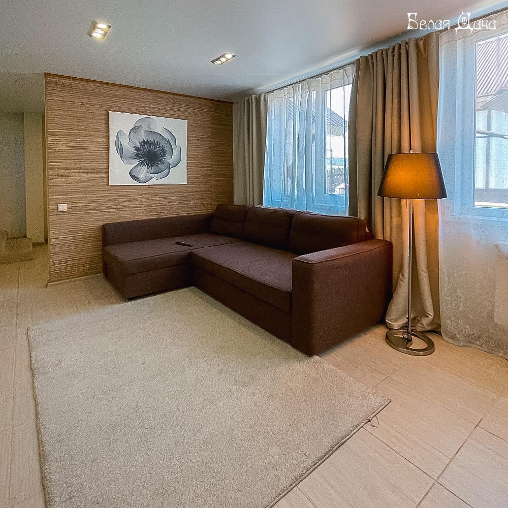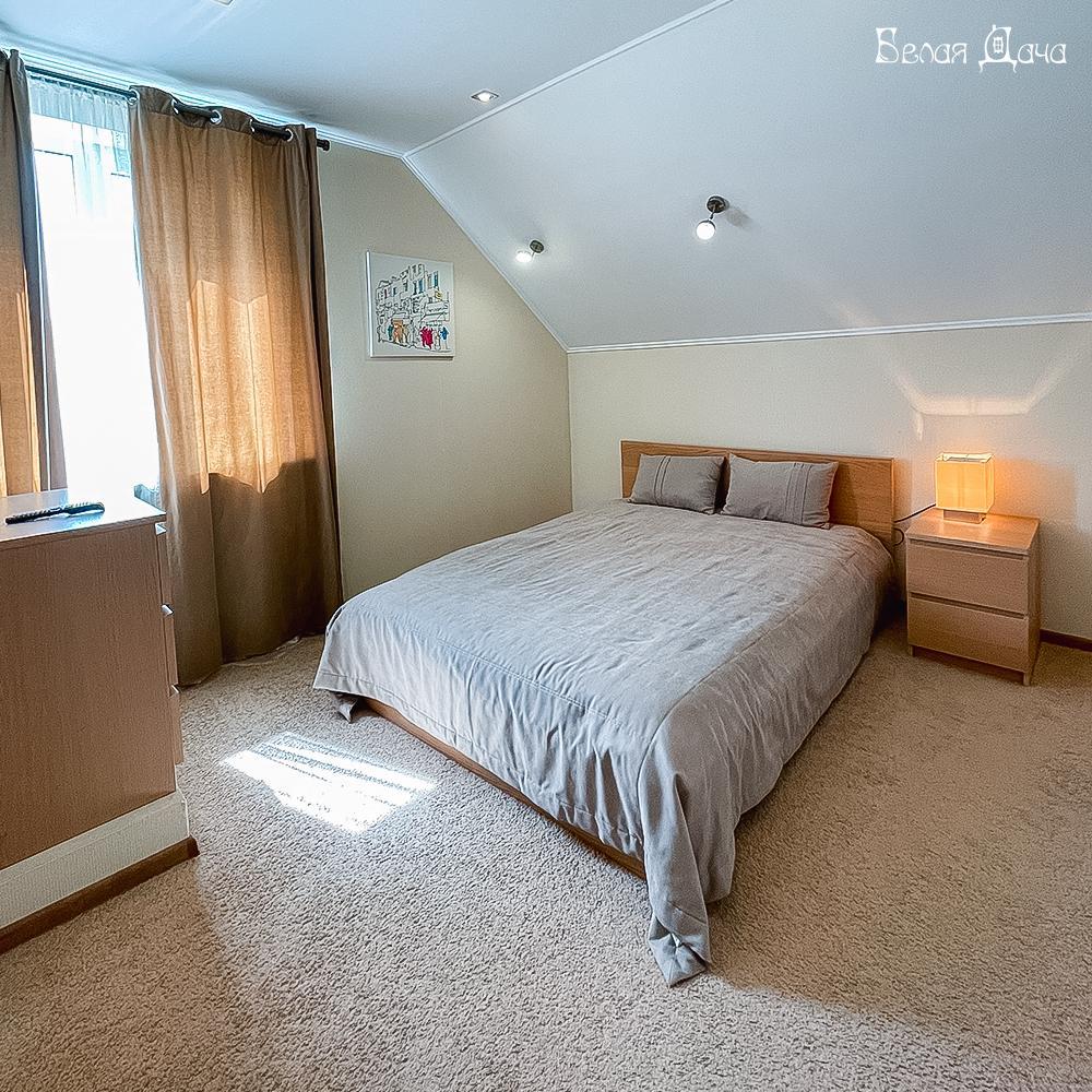 В доме есть уютная гостиная, керамическая посуда на 6 персон, микроволновая печь, чайник, холодильник, телевизор, сауна. На втором этаже – три спальни, шесть спальных мест. На территории расположены мангал и беседка. В случае необходимости дополнительных спальных мест, предоставляются раскладушки.