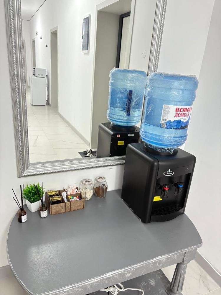 Две двуспальные и две односпальные кровати. Вешалка для одежды, кондиционер. Микроволновая печь, холодильник. Ванная комната с душем. Предоставляется постельное белье и полотенца. Питьевая вода в кулере на этаже.