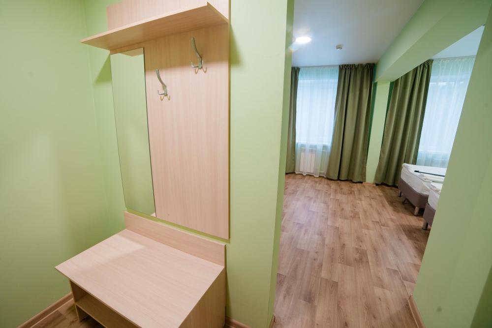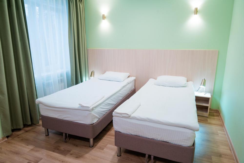 Двухкомнатный номер, оборудованный двумя кроватями размером 160*200 и 120*200. В номере есть телевизор, электрочайник, большой холодильник. Куллер с горячей/холодной водой располагается на этаже. В номере неполный санузел: раковина, унитаз. Просим обратить ВНИМАНИЕ, общий душ находится на 1 этаже. Фен предоставляется по запросу. Детская кроватка доступна по запросу бесплатно (при наличии свободной). Без дополнительной платы, по запросу предоставляются косметически принадлежности: шампунь, гель, зубной набор.