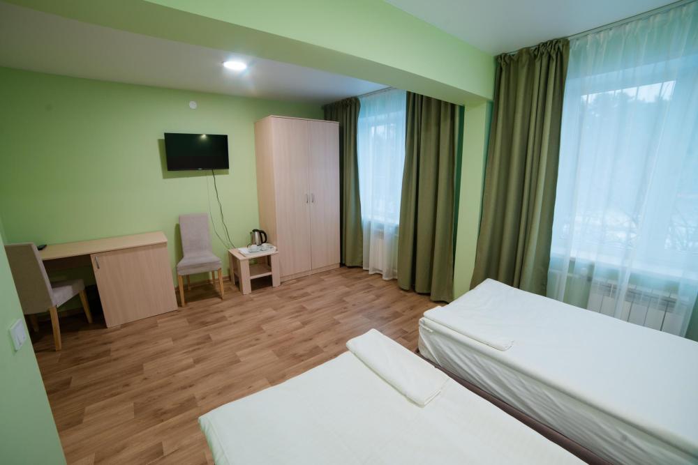 Уютные однокомнатные номера в спокойной цветовой гамме, оборудованы двумя раздельными кроватями размером 90*200 каждая, при необходимости кровати можно сдвинуть. Полный санузел в номере. В каждом номере имеется альпийская форточка, индивидуальный кондиционер и телевизор. Для каждого гостя предусмотрен халат и тапочки. Куллер с горячей/холодной водой находится на этаже. Номера расположены на 2 и 3 этажах гостиницы. Прекрасный вариант для отдыха с семьей или индивидуально. Детская кроватка предоставляется по запросу бесплатно. Без дополнительной платы, по запросу предоставляются косметические средства: гель, шампунь, зубной набор.