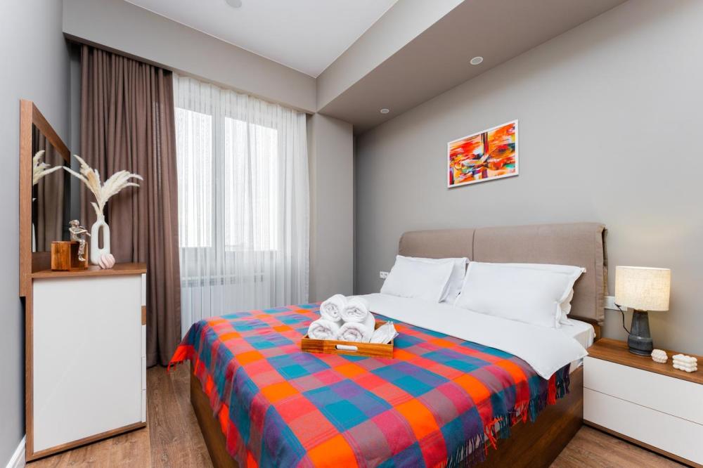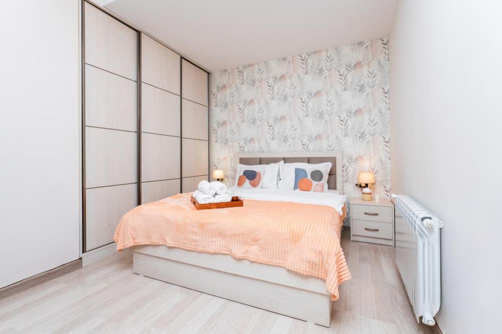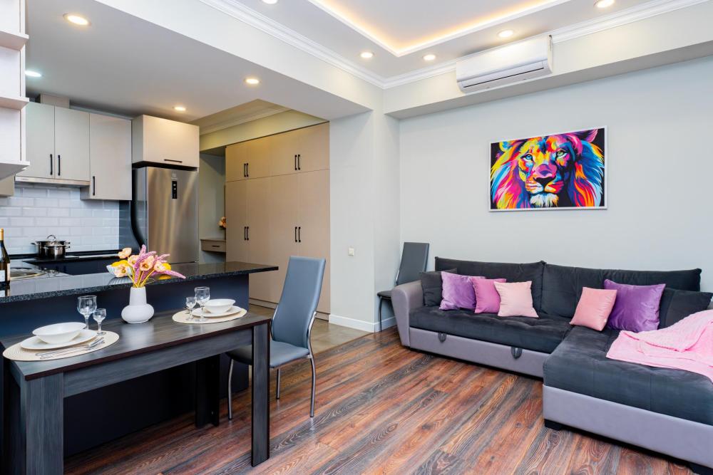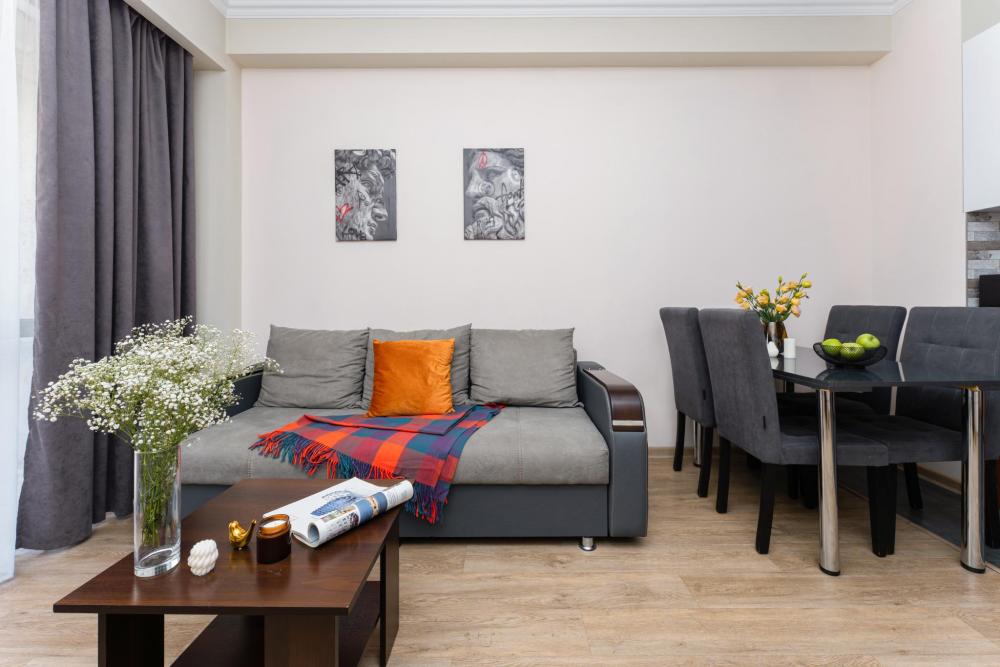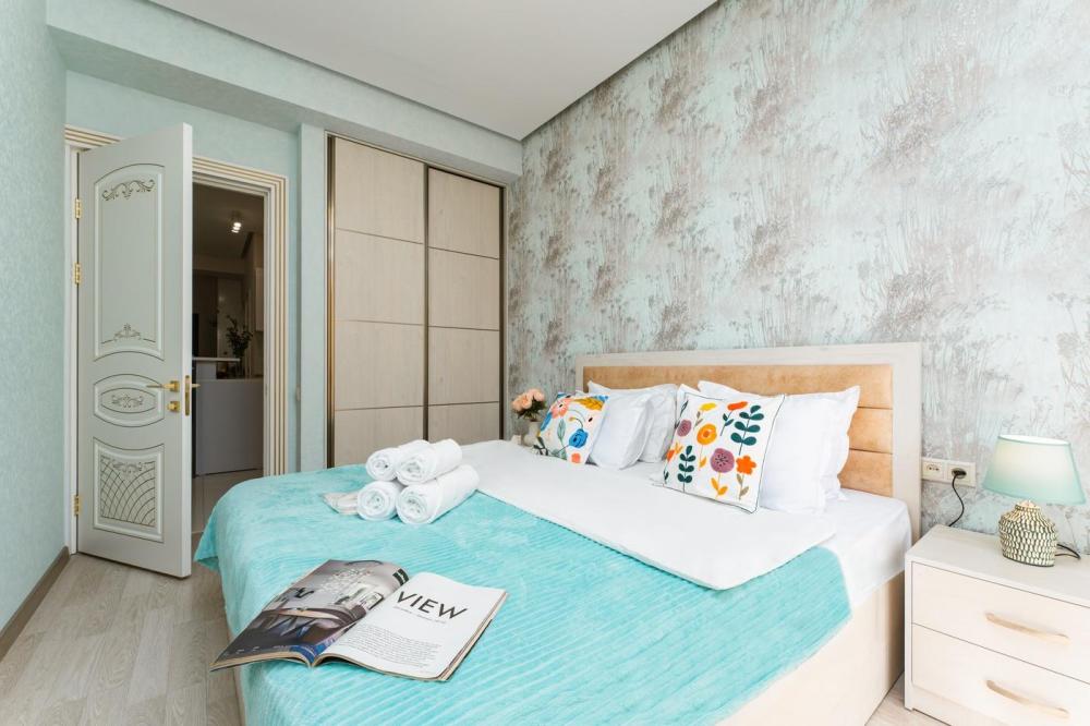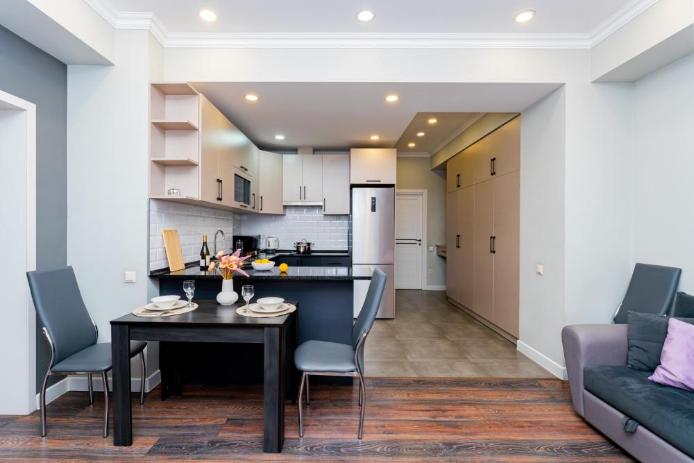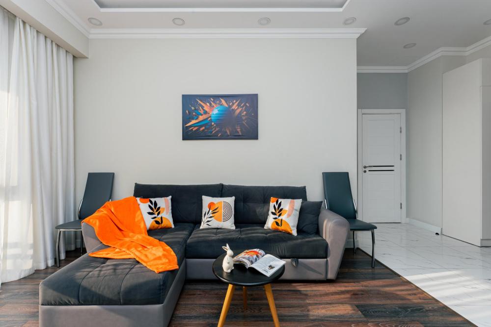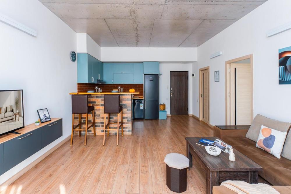 Стильная квартира c отдельной спальней. В здании есть 3 лифта, в квартире есть все необходимые удобства , диван раскладной, могут разместиться 3 взрослых и 1 ребенок . Кровать большая двуспальная 150х180.