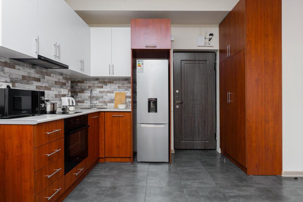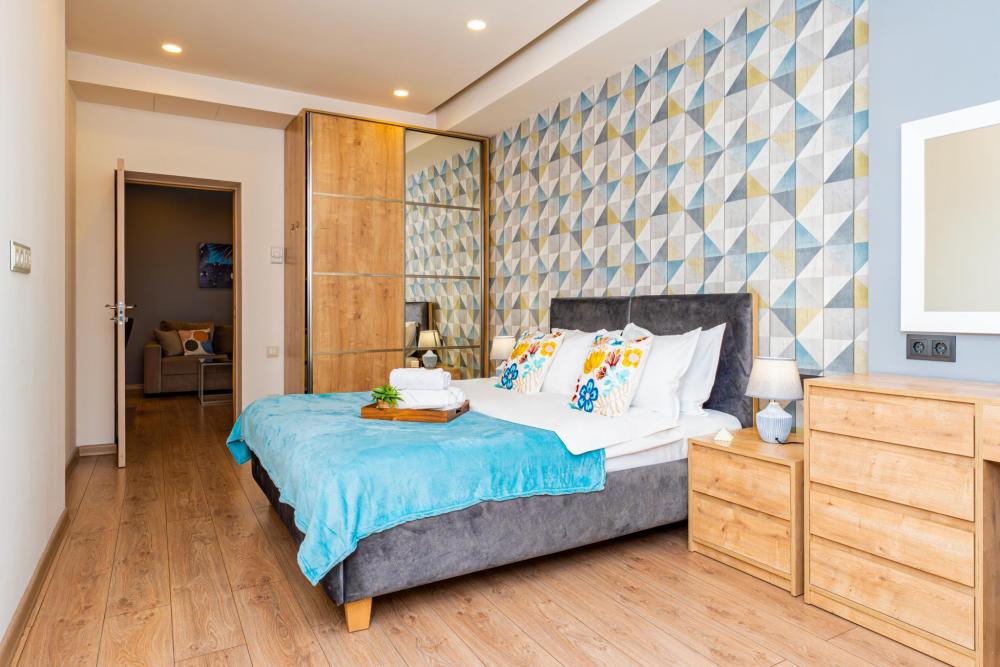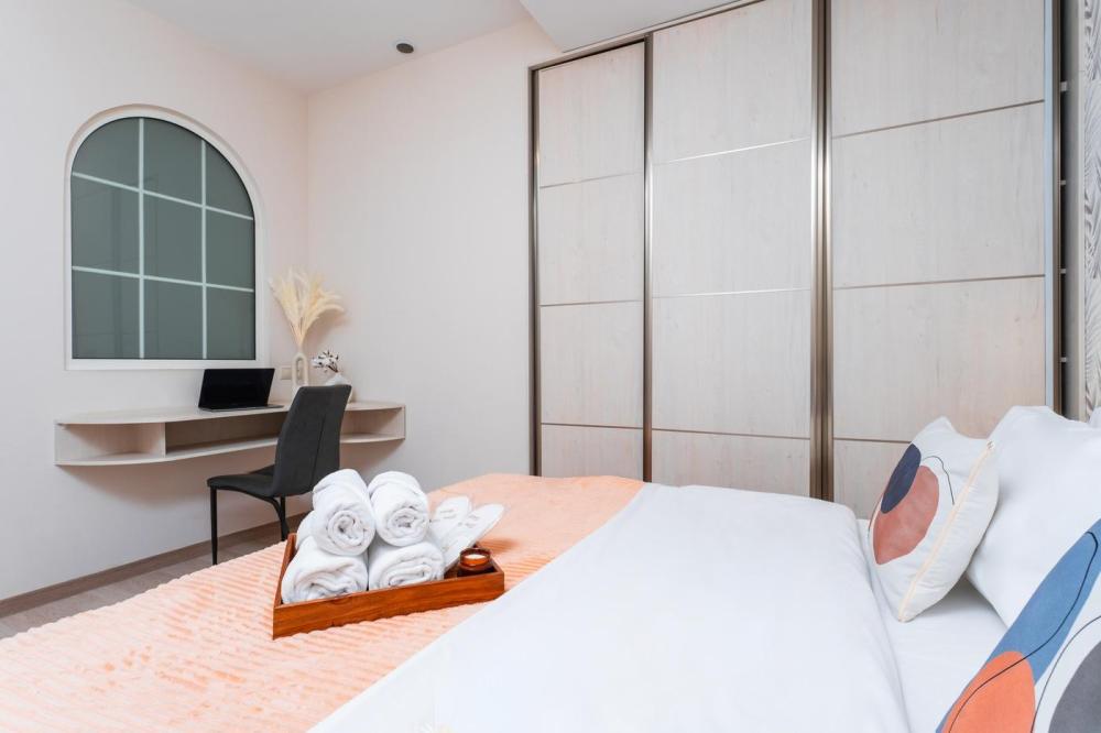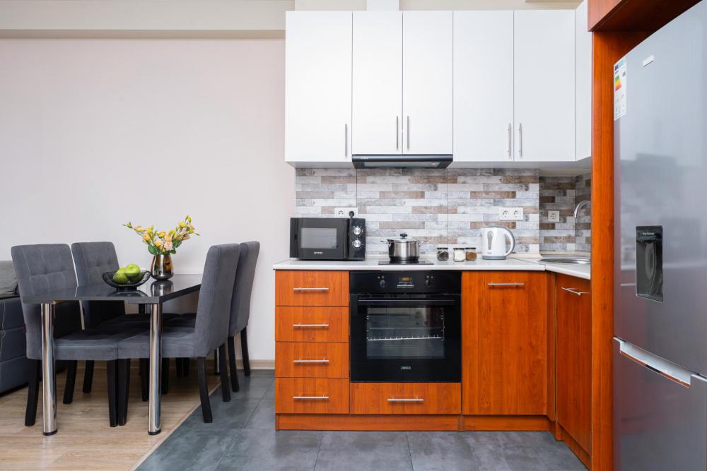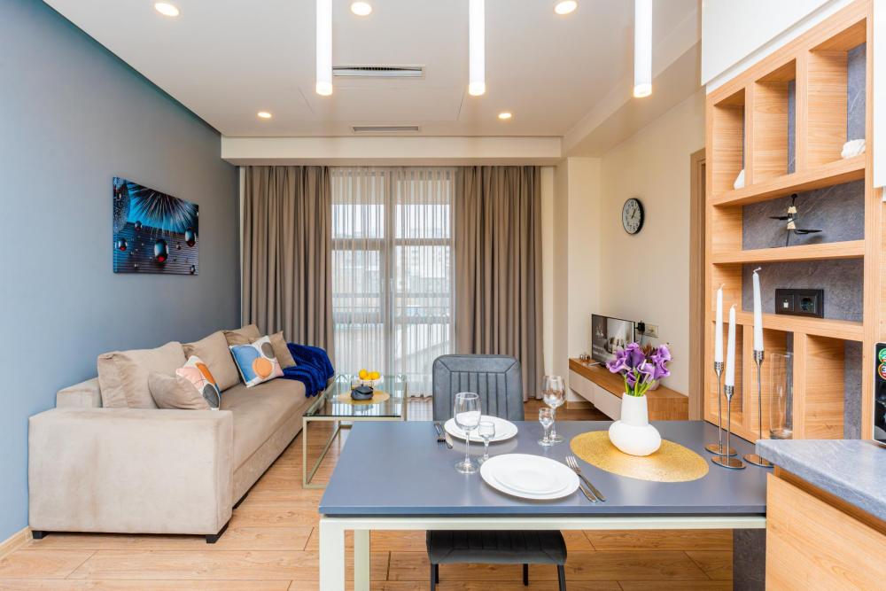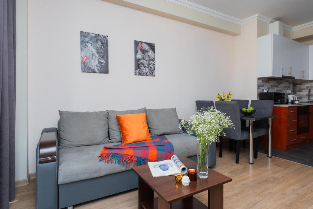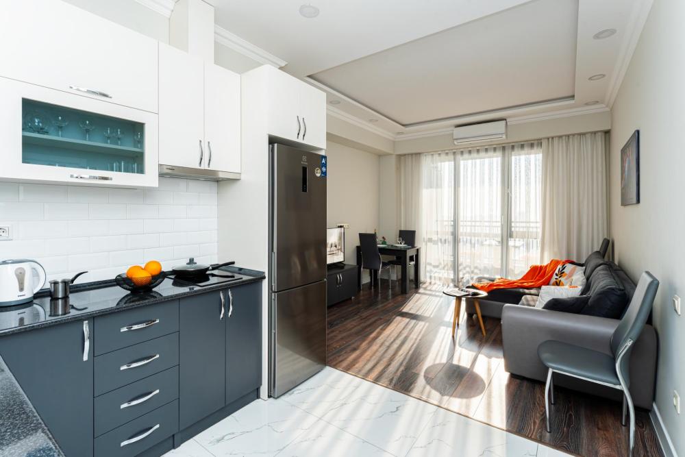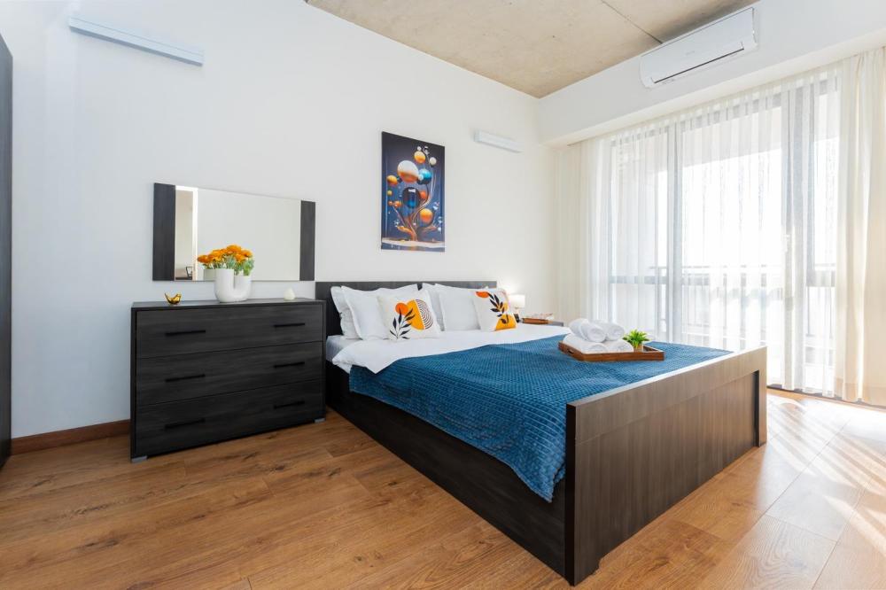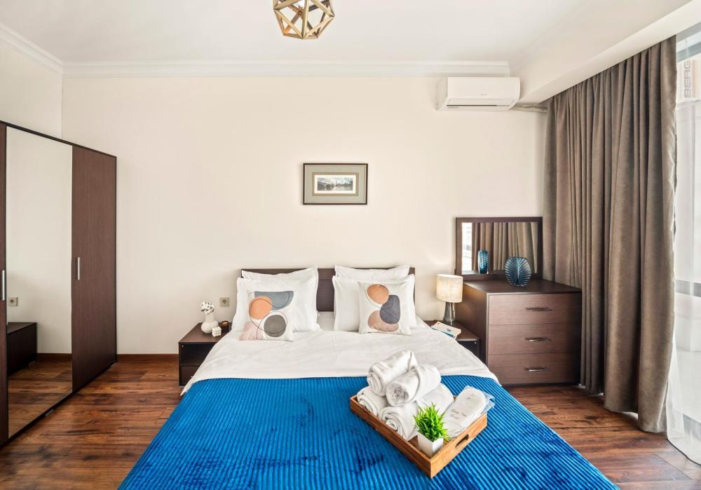 Стильная квартира c отдельной спальней. В здании есть 3 лифта, в квартире есть все необходимые удобства , диван раскладной, могут разместиться 3 взрослых и 1 ребенок . Кровать большая двуспальная 150х180.