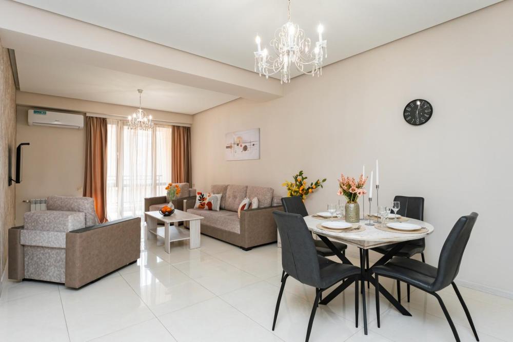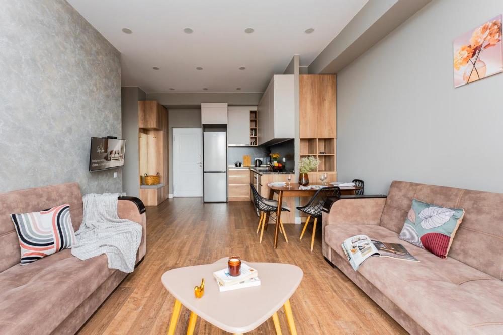 Уютная однокомнатная квартира находится на 10 этаже новостройки на улице Кохбаци 16. Площадь квартиры около 62 кв м, в квартире есть все необходимое для комфортного проживания - гостиная с диваном и ТВ, кухня со всеми принадлежностями для готовки еды, ванная комната с душем, спальня с двухместной кроватью, стиральная машина, балкон, фен, утюг, WiFi. Постельное белье и полотенца в квартире также предоставляются.