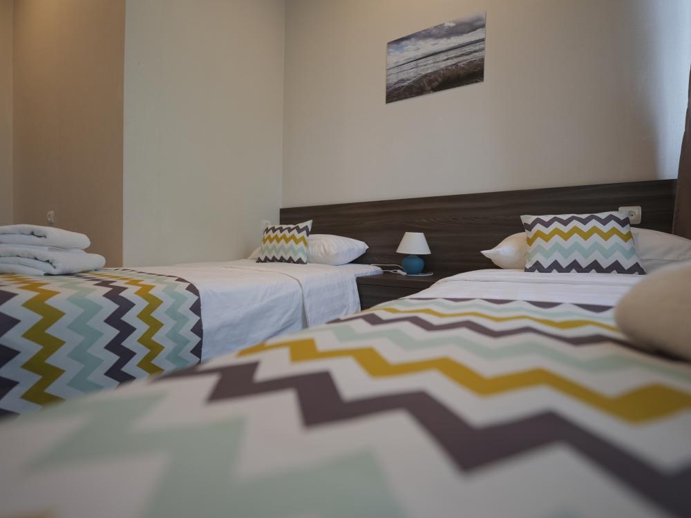 Хорошо продуманная комната размером 12 кв.м. вмещает все необходимое для комфортного проживания. В комнате есть смарт телевизор, холодильник, эл. чайник, утюг, гладильная доска. Ортопедический матрас и постельное белье наилучшего качества гарантируют гостям качественный отдых. Отель предоставляет все необходимые принадлежности- тапочки, зубную щетку, шампунь, гель для душа, мыло...