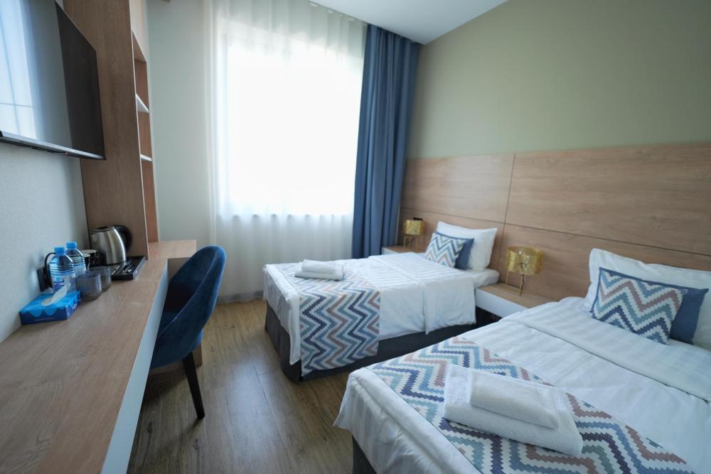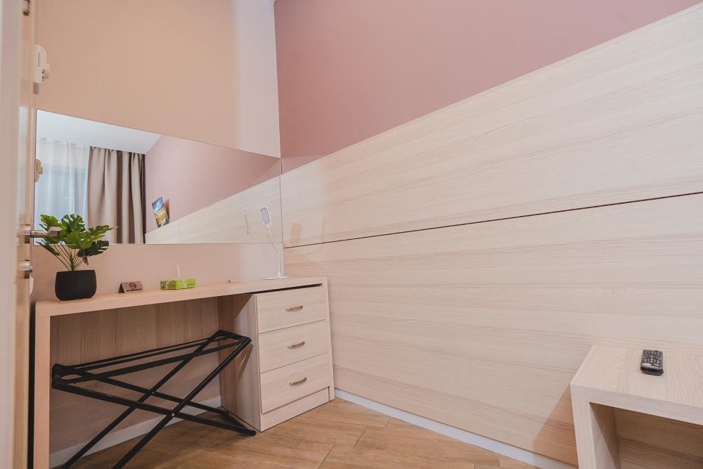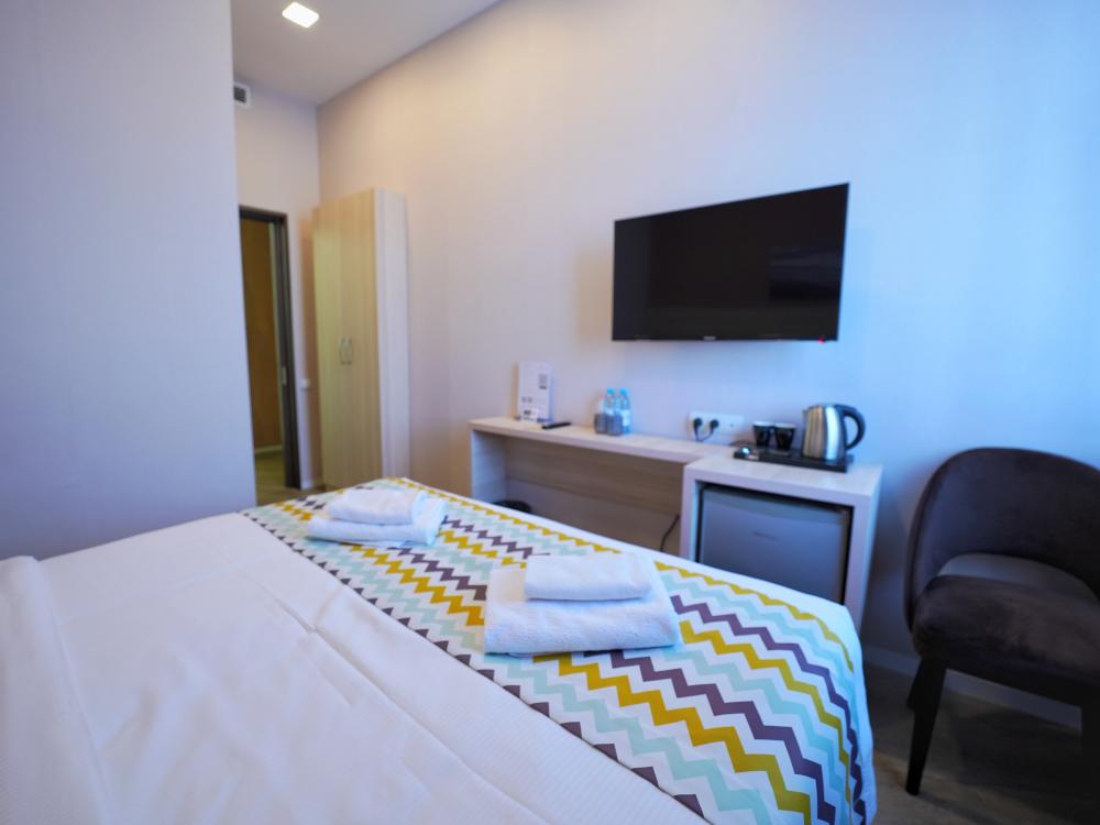 Хорошо продуманная комната размером 13 кв.м. вмещает все необходимое для комфортного проживания. В комнате есть смарт телевизор, эл. чайник, утюг, гладильная доска. Ортопедический матрас и постельное белье наилучшего качества гарантируют гостям качественный отдых. Отель предоставляет все необходимые принадлежности- зубная щетка, шампунь, гель для душа, мыло.