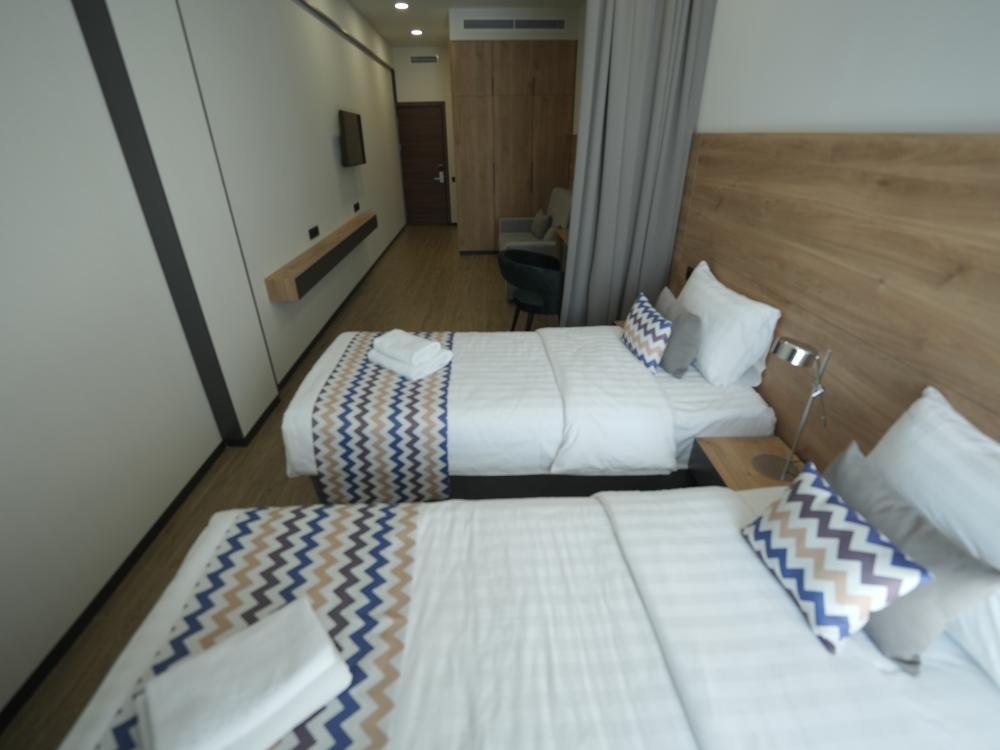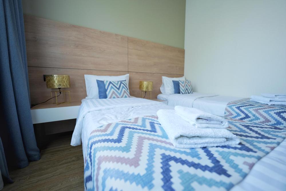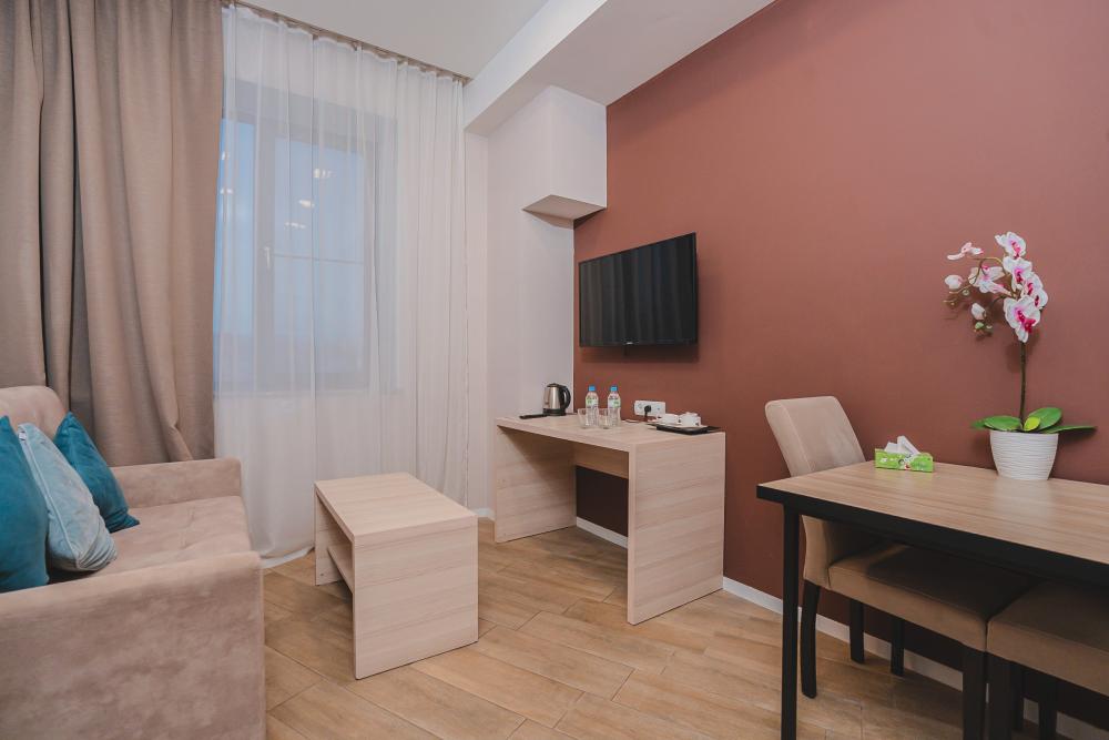 Номер очень удобен для семей с маленькими детьми а так же гостей ценящих свой комфорт у удобство. Номер состоит из двух комнат с общей площадью 27 кв.м.. В столовой есть диван, обеденный стол, смарт телевизор, холодильник, эл. чайник, утюг, гладильная доска. В спальной есть трюмо, шкаф, телевизор. Ортопедический матрас и постельное белье наилучшего качества гарантируют гостям качественный отдых. Отель предоставляет все необходимые принадлежности- тапочки, зубную щетку, шампунь, гель для душа, мыло...