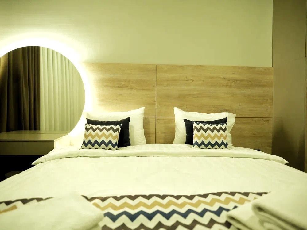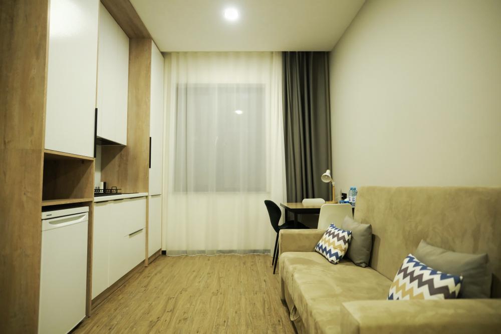 Эти апартаменты с одной спальней общей площадью 30 кв.м. прекрасно подходят для длительных поездок, а так же гостям, которые любят готовить сами. Столовая оборудована индукционной плитой, вытяжкой, холодильником, микроволновой печью, эл. чайником и столовыми приборами. Есть обеденный стол, диван, письменный стол и шкаф. В спальне есть удобное зеркало с подсветкой.