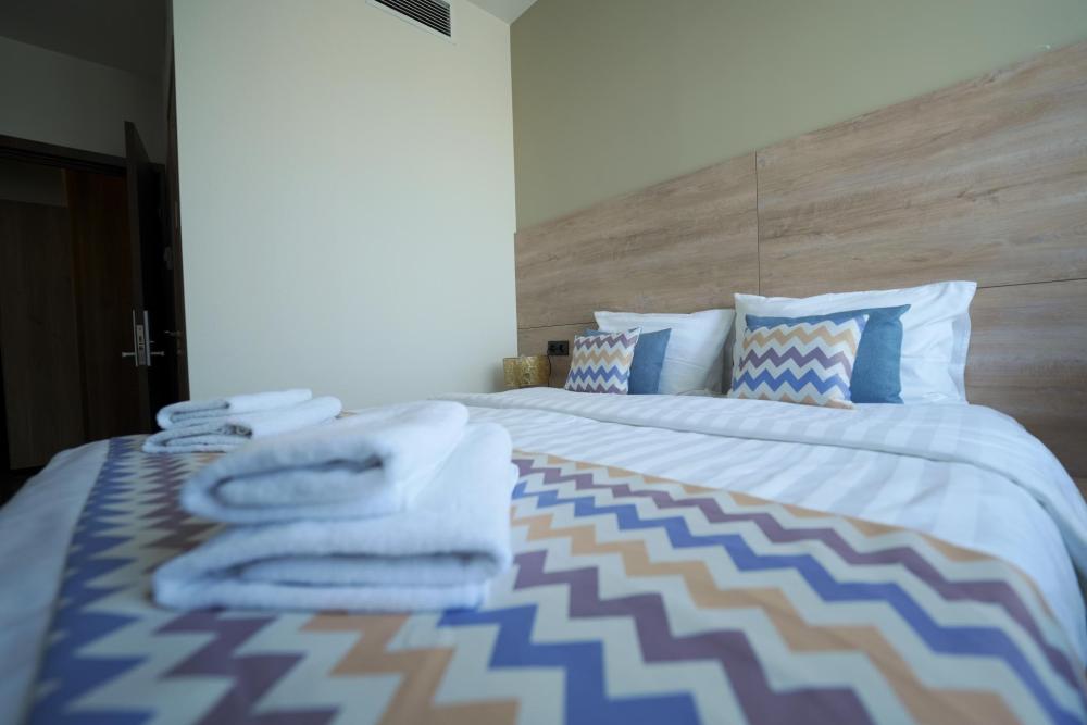 Эти апартаменты с двумя спальнями общей площадью 50 кв.м. прекрасно подходят для больших семей. Спальни имеют выход на балкон. В данном номере есть два сан.узла. Столовая оборудована индукционной плитой, вытяжкой, большим холодильником, микроволновой печью, эл. чайником и столовыми приборами. Есть обеденный большой стол, диван, кресло, журнальный стол, письменный стол и шкаф. В спальне есть удобное зеркало с подсветкой.
