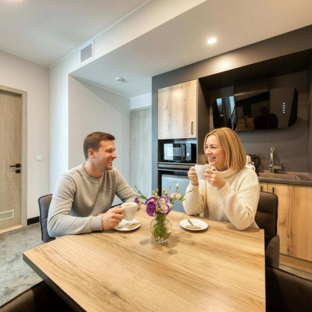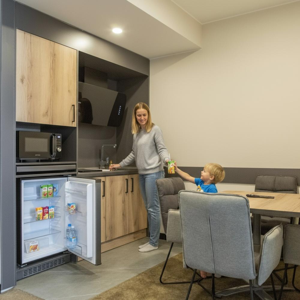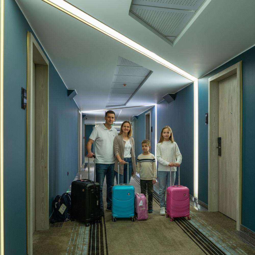 Трехкомнатный четырехместный номер люкс с одной двуспальной и двумя односпальными кроватями, оснащен тремя телевизорами, рабочим местом, собственной кухней, гостиной, местом для хранения одежды и собственной ванной комнатой.