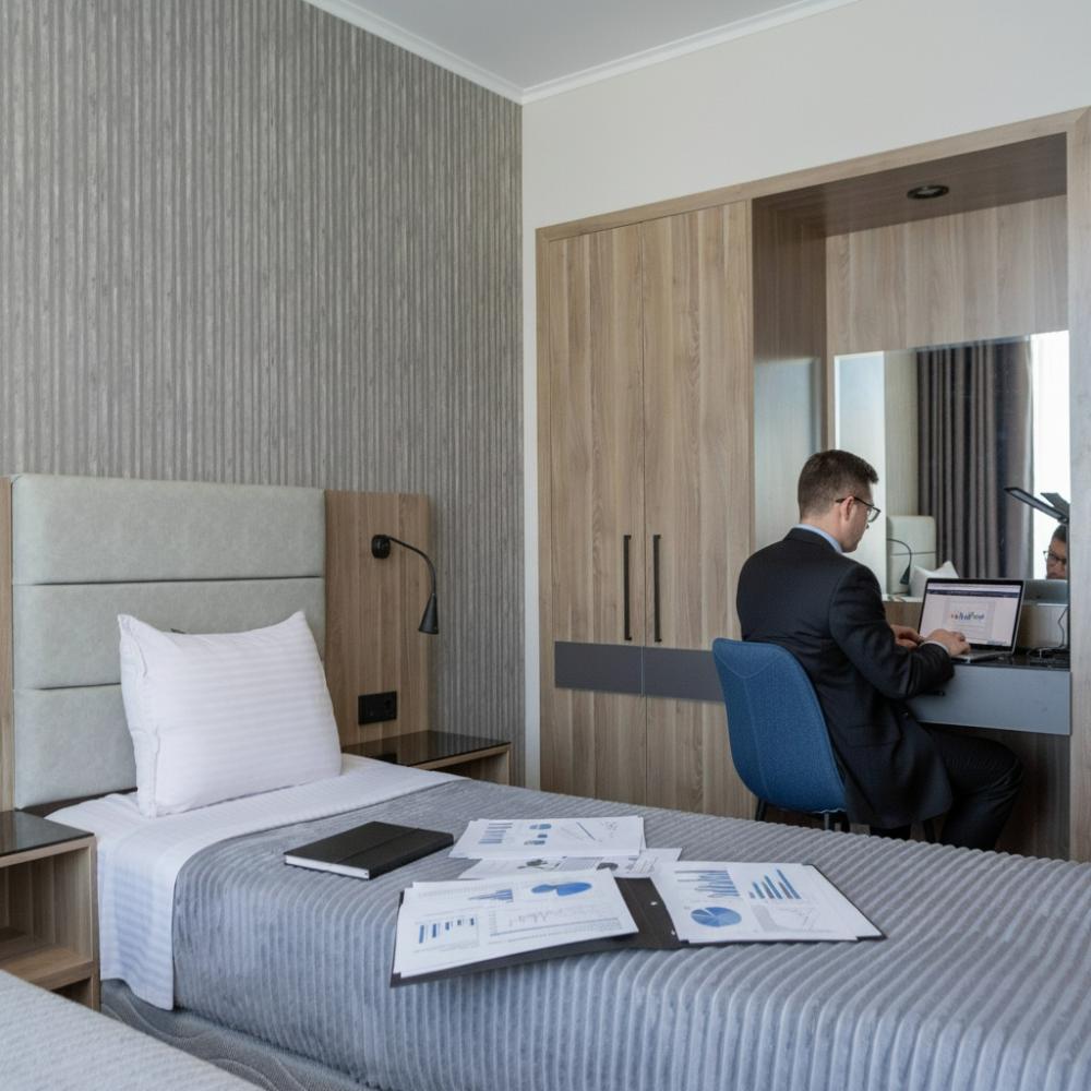 Стандартный двухместный номер с двумя односпальными кроватями, оснащен телевизором, рабочим местом, местом для хранения одежды и собственной ванной комнатой.