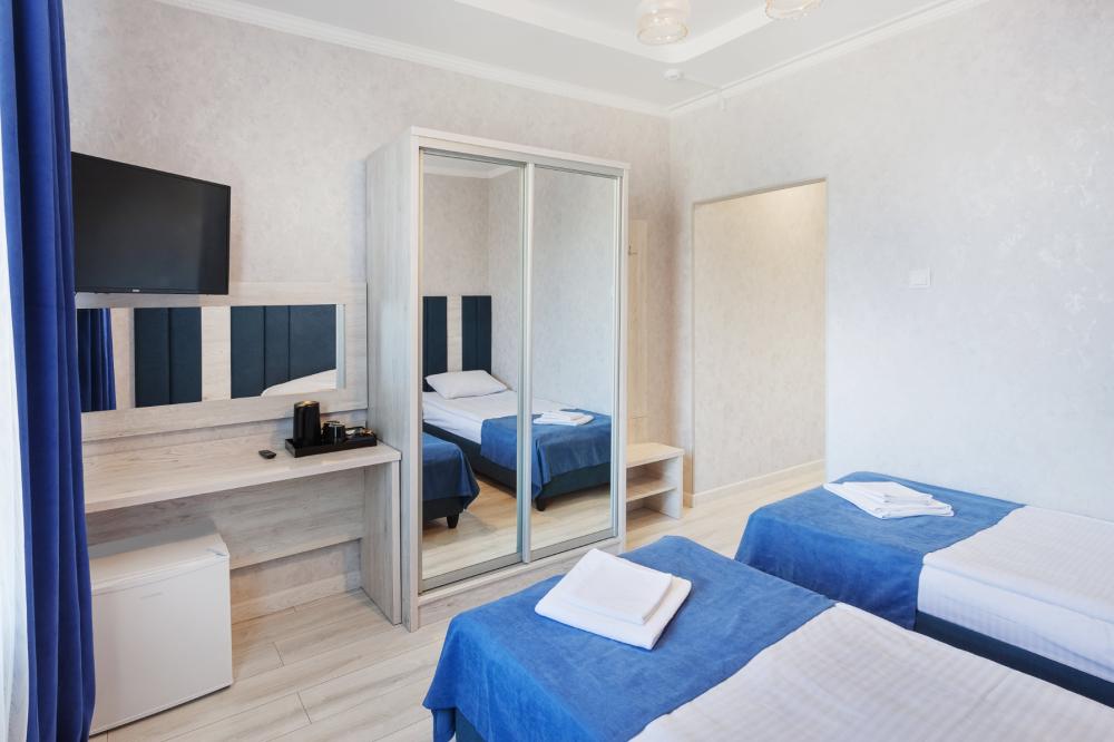 Стандартный двухместный номер с двумя односпальными кроватями. В номере есть всё необходимое для комфортного проживания: телевизор, кондиционер, мини-холодильник, электрический чайник, фен, зеркало, место для хранения одежды и набор посуды. Собственная ванная комната оборудована душем. Предоставляются туалетные принадлежности, халаты и тапочки. Для общего пользования гостей — WI-FI, кулер с горячей и холодной водой, микроволновка, утюг и гладильная доска. Бесплатная парковка во дворе отеля. Круглосуточное заселение. При наличии свободных номеров ранний заезд — бесплатно. Проживание детей: • до 3 лет — бесплатно (без отдельного спального места); • от 3 лет — доплата 700 ₽/сутки, включая завтрак. Страховой депозит не требуется. Завтрак включён в стоимость. При необходимости Вы можете заказать трансфер из аэропорта, заранее связавшись с менеджером по бронированию, стоимость- 1500 рублей за машину до 4-х человек.