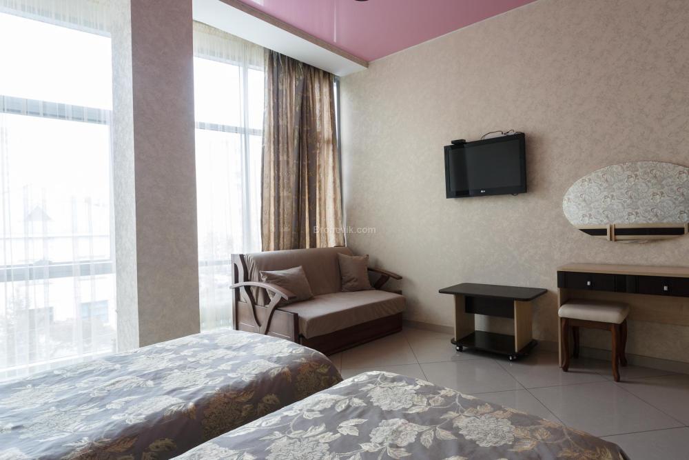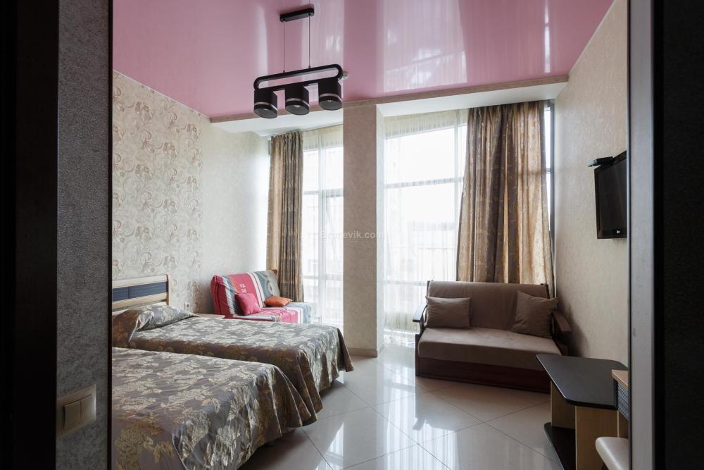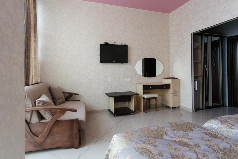 В спальне: двуспальная кровать, две тумбочки, два прикроватных светильника, туалетный столик с пуфиком, ЖК телевизор с USB-накопителем, кондиционер. В гостиной: диван раскладной, кресло-кровать, кондиционер, ЖК телевизор с USB-накопителем, холодильник, стол на колесах, столовая принадлежность на 5 персон, чайник, графин, шкаф для одежды В санузле душевая кабина, зубной набор, шампунь, мыло, полотенце для ног, рук и тела, фен, туалет, туалетные приспособления.