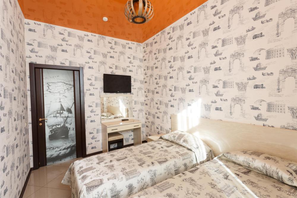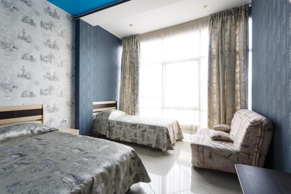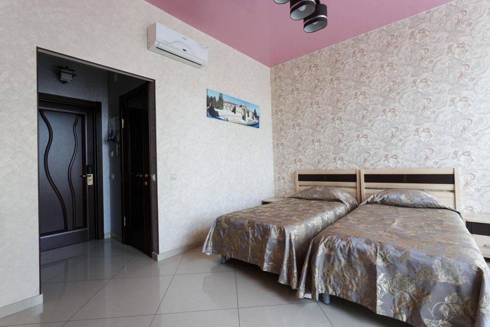 В спальне: две раздельные кровати, диван раскладной, диван, две тумбочки, светильники, ЖК телевизор с USB-накопителем, кондиционер, столик на колесах, столовая принадлежность (пару тарелок, вилок, ножей, чайных ложек), чайник электрический, графин, туалетный столик с пуфиком. В коридоре: телефон внутреннего пользования, шкаф, холодильник. В санузле: душевая кабина, зубной набор, шампунь, мыло, полотенце для ног, рук и тела, фен, туалет, туалетные приспособления, противоскользящий ковер.