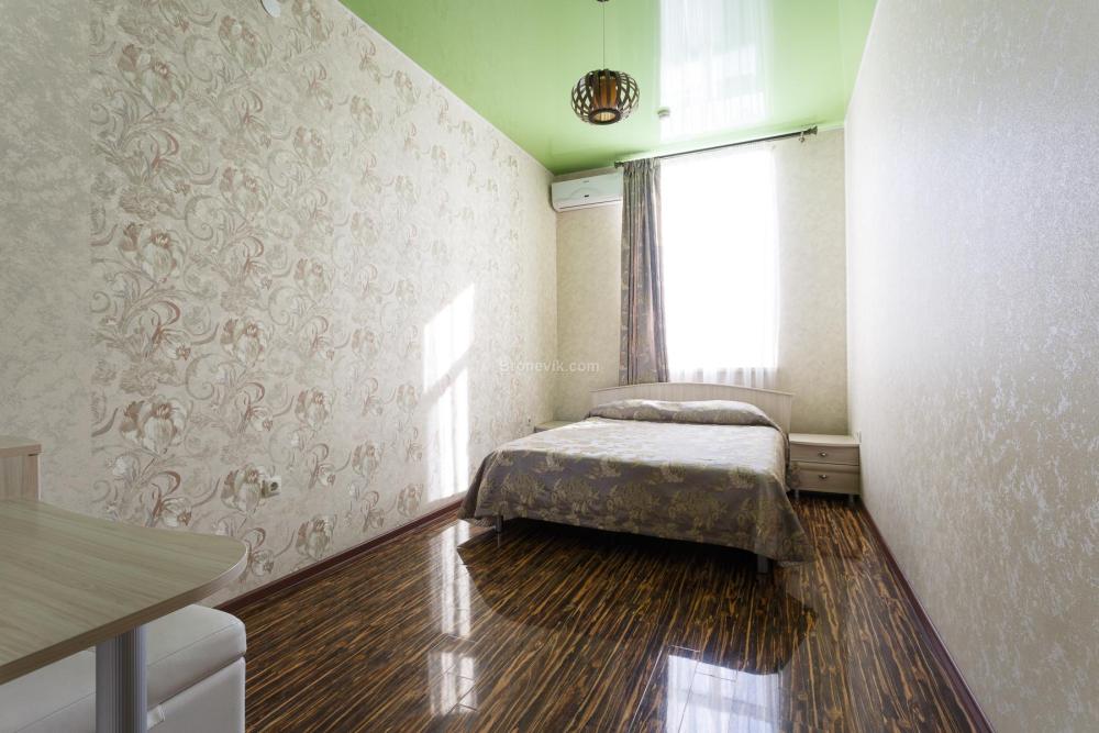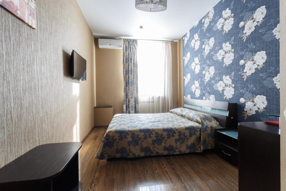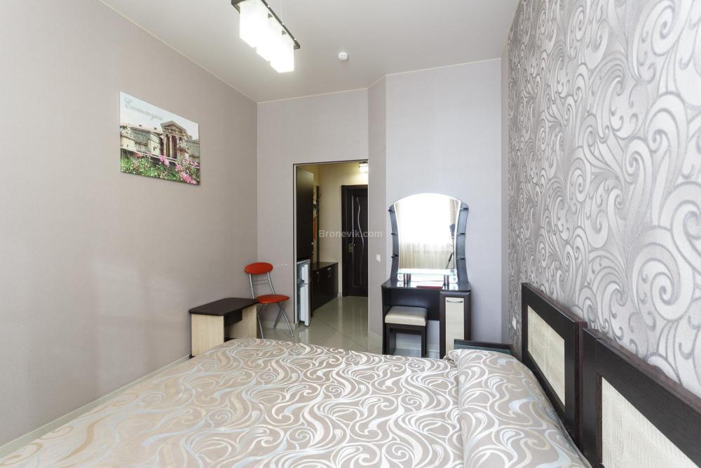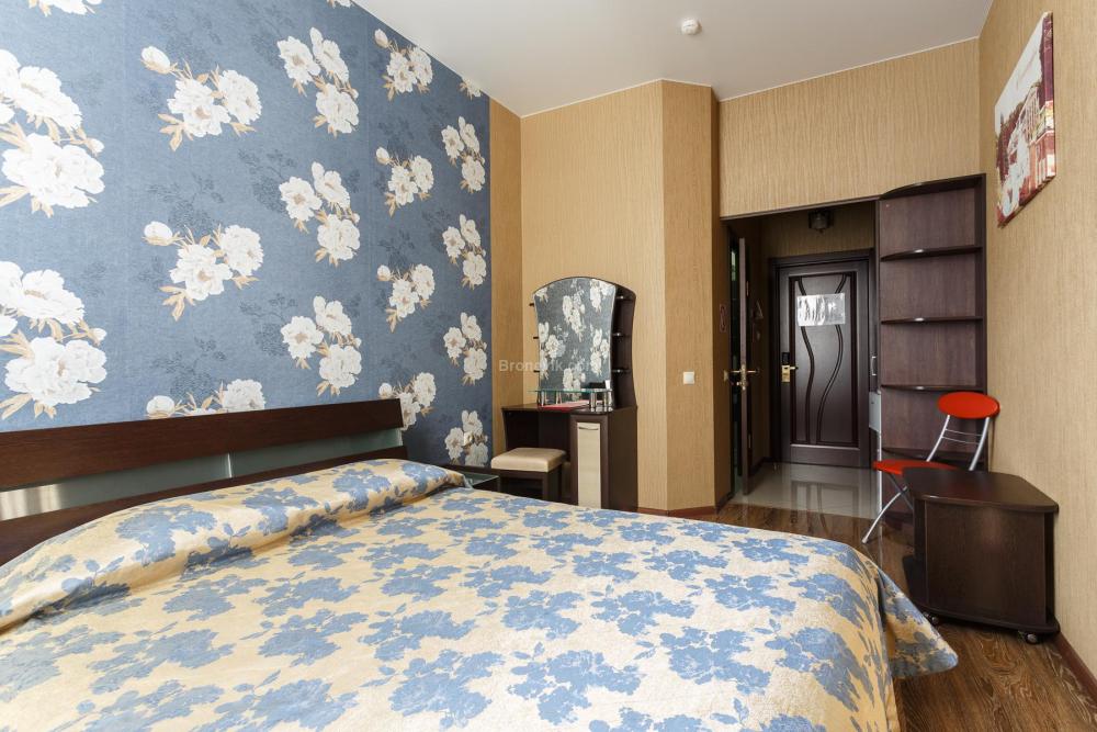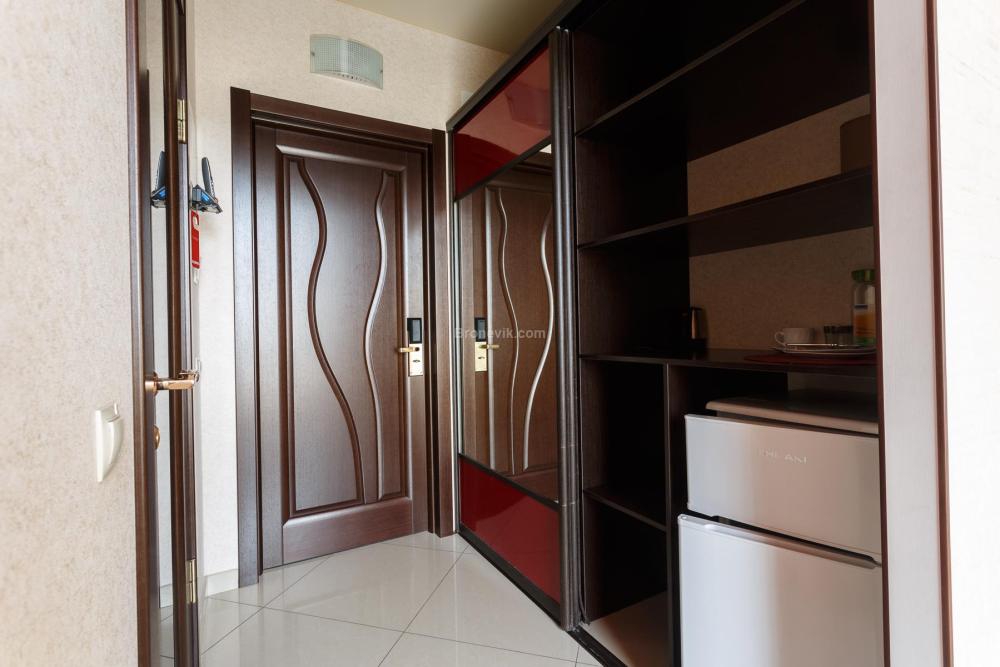 В спальне: двуспальная кровать, две тумбочки, светильники, ЖК телевизор с USB-накопителем, кондиционер, столик на колесах, столовая принадлежность (пару тарелок, вилок, ножей, чайных ложек), чайник электрический, графин, туалетный столик с пуфиком. В коридоре: телефон внутреннего пользования, шкаф, холодильник. В санузле: душевая кабина, зубной набор, шампунь, мыло, полотенце для ног, рук и тела, фен, туалет, туалетные приспособления, противоскользящий ковер.