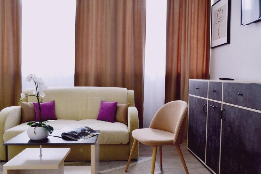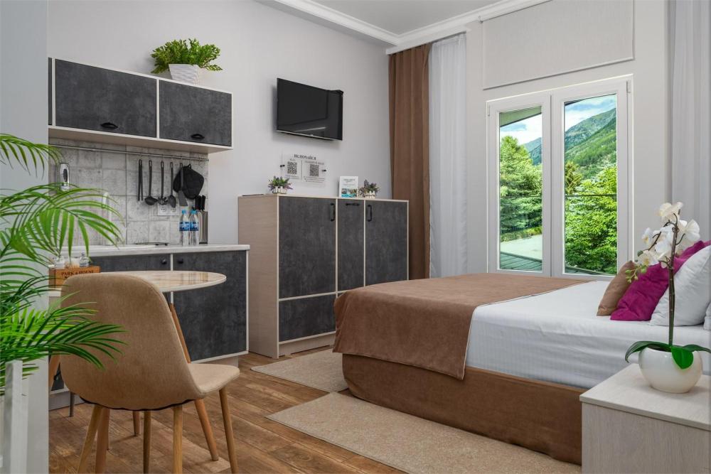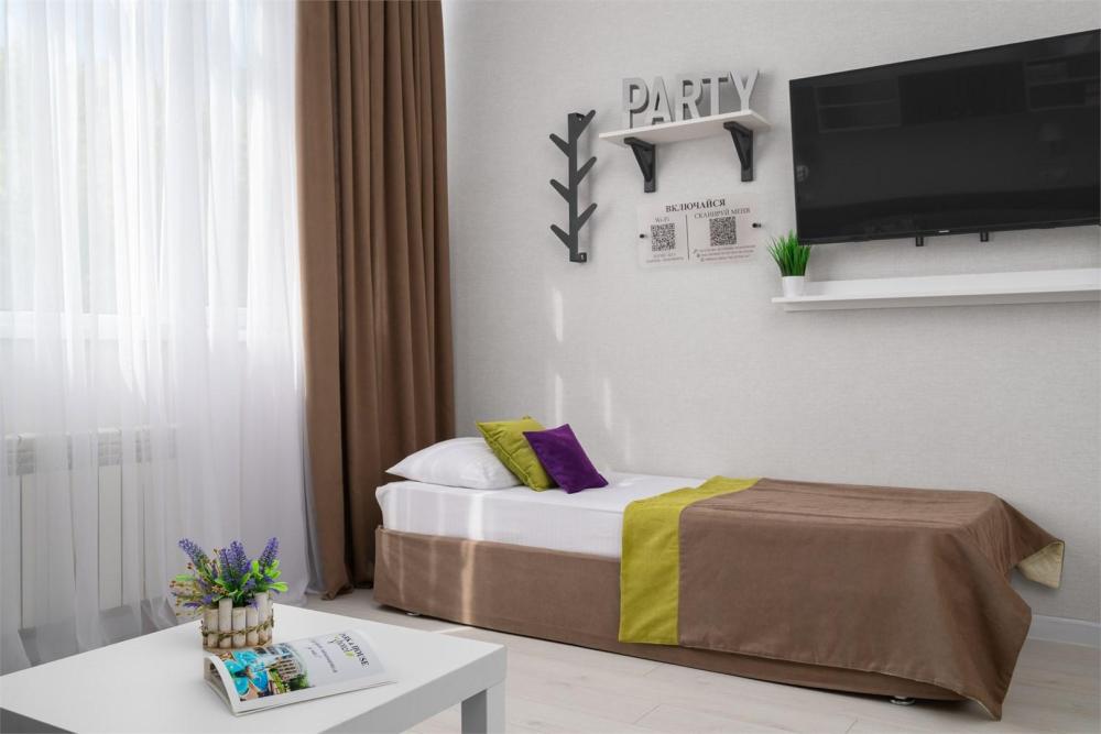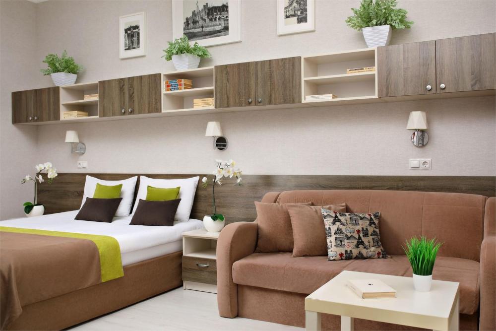 APART + мини кухня- это 2-хместные комфортные номера, площадью 18 м², которые отлично сочетают в себе: спальную, кухонную и гостевую зоны, с двуспальной или двумя раздельными односпальными кроватями на выбор. Дизайнерское оформление номеров, окна с подсветкой, которые выглядят очень реалистично и эффектно, роллеты с автоматическим ручным управлением на проветривание и открывание окна. В комфорте номеров предусмотрено ВСЁ: удобная мебель, телевизор, сейф, теплые полы, обеденная зона, кухня с холодильником и мультиваркой, наборы посуды и столовых приборов, белоснежное постельное белье, махровые полотенца и халаты, душ и санузел в ванной комнате, фен, бутилированная вода, чайная станция, приветственный чай и кофе, а также бесплатный Wi-Fi.