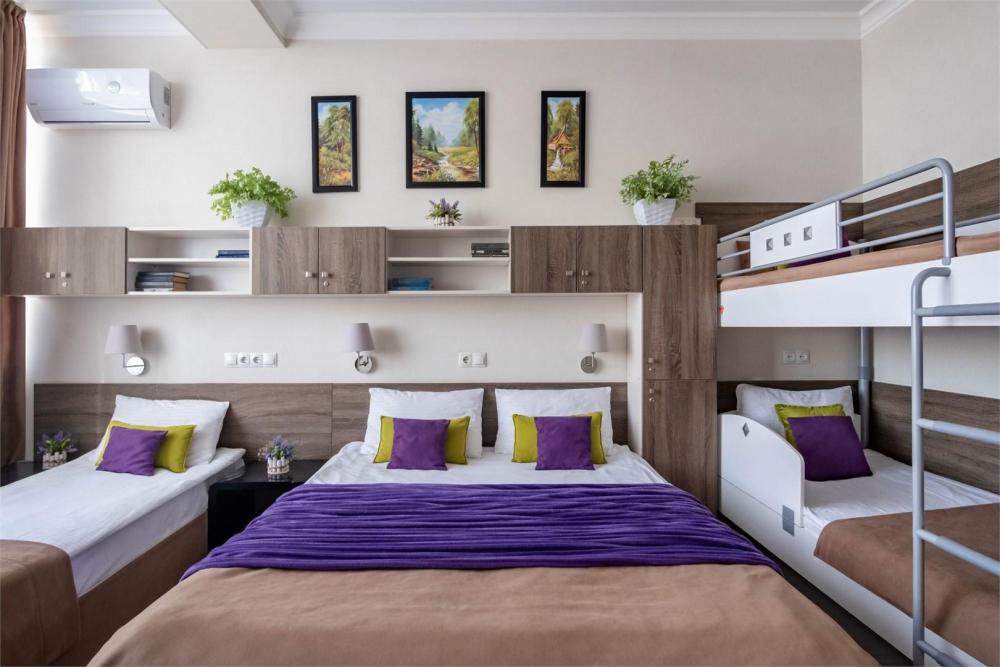 Семейный номер Lux площадью 35 м2 с двуспальной или двумя односпальными кроватями на выбор и раскладным диваном. В номере удобная мебель, кондиционер, телевизор, холодильник, душ в ванной комнате, фен, сейф и бесплатный Wi-Fi. Приветственный чай и кофе, бутилированная вода.