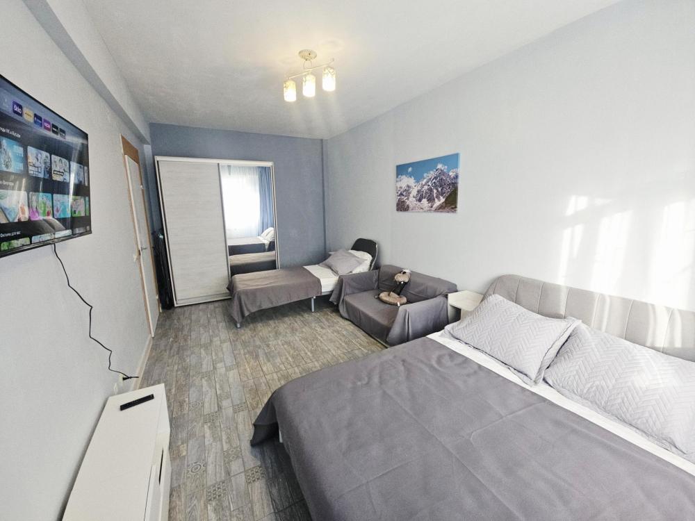 Апартаменты большой площади - 70м2. Расположены на 5 этаже. В них 3 изолированные комнаты , вход в каждую из коридора, и каждая закрывается на дверь. 2 спальни и Кухня-гостиная . В 1 спальне : 2-х спальная и 1 спальная кровати, во 2 спальне : 2 - спальная и две односпальных кровати. , в кухне-гостиной : - 2 спальный диван. По запросу можно добавить детскую кровать или 1 спальные кровати. Комплектация кухни : холодильник , 4 -комфорочная плита с духовкой , микроволновая печь , необходимая посуда. В апартаментах есть стиральная машина , кондиционеры в каждом помещении. Телевизор с подпиской на пакет каналов Кинозал. WiFi - стабильный , скорость 100мБ/с. Горячая вода и отопление - центральные . Туалет и ванная комнаты - раздельные . Балкон полностью открытый с видом на горы. Окна выходят на 2 стороны дома. По запросу предоставляется кофемашина , сушилки для горнолыжных ботинок , детская кровать .