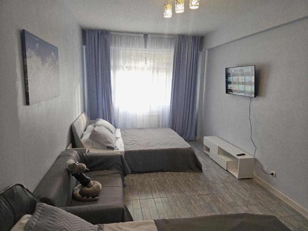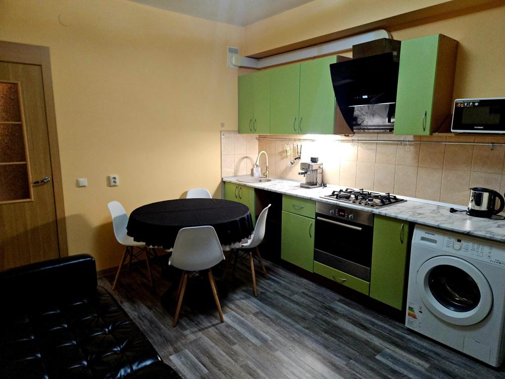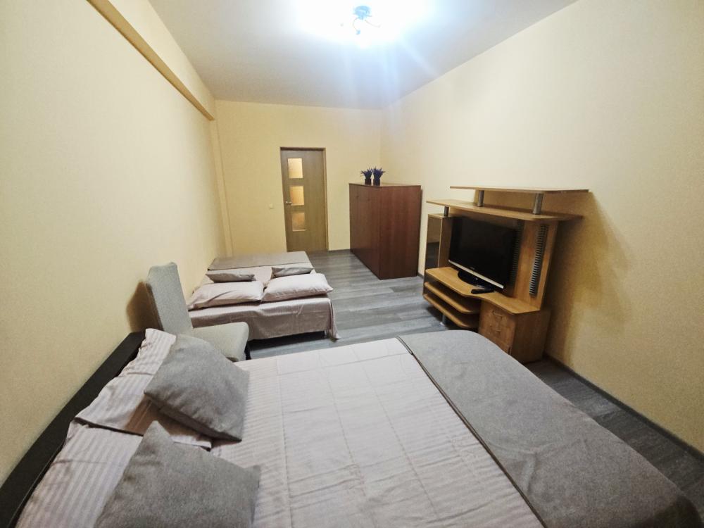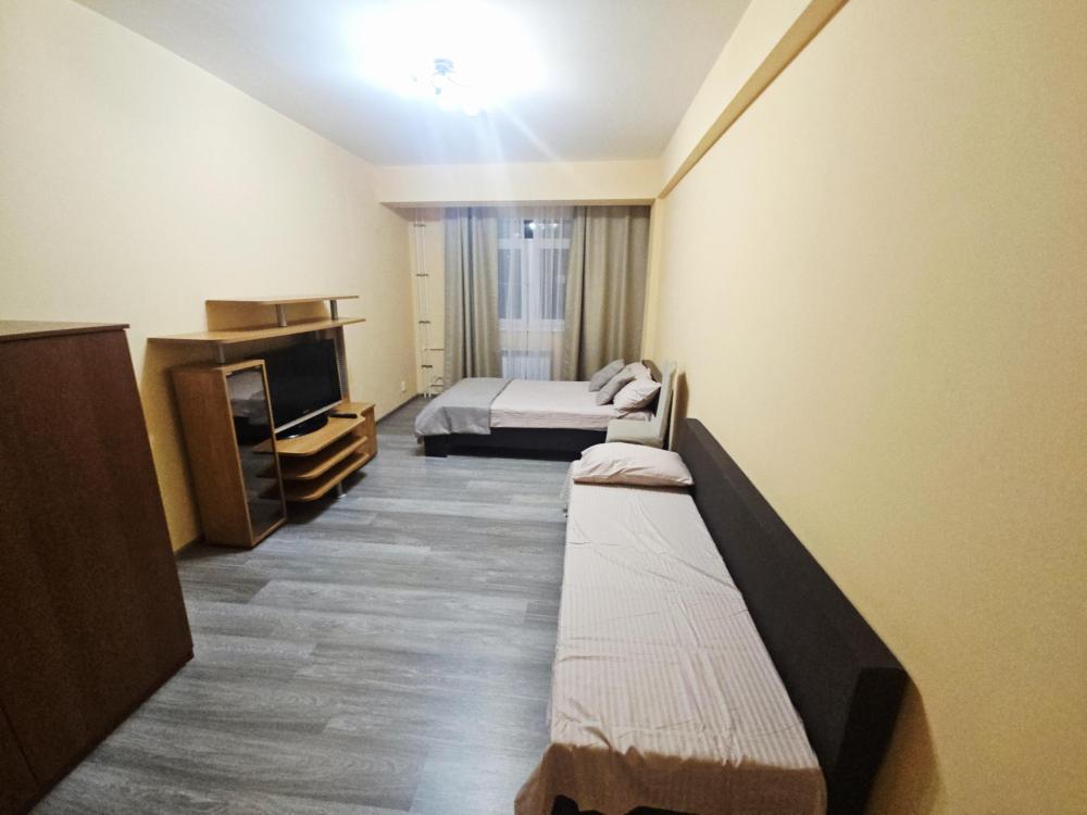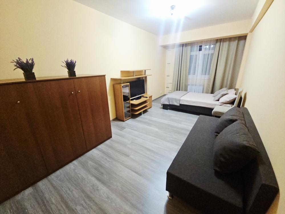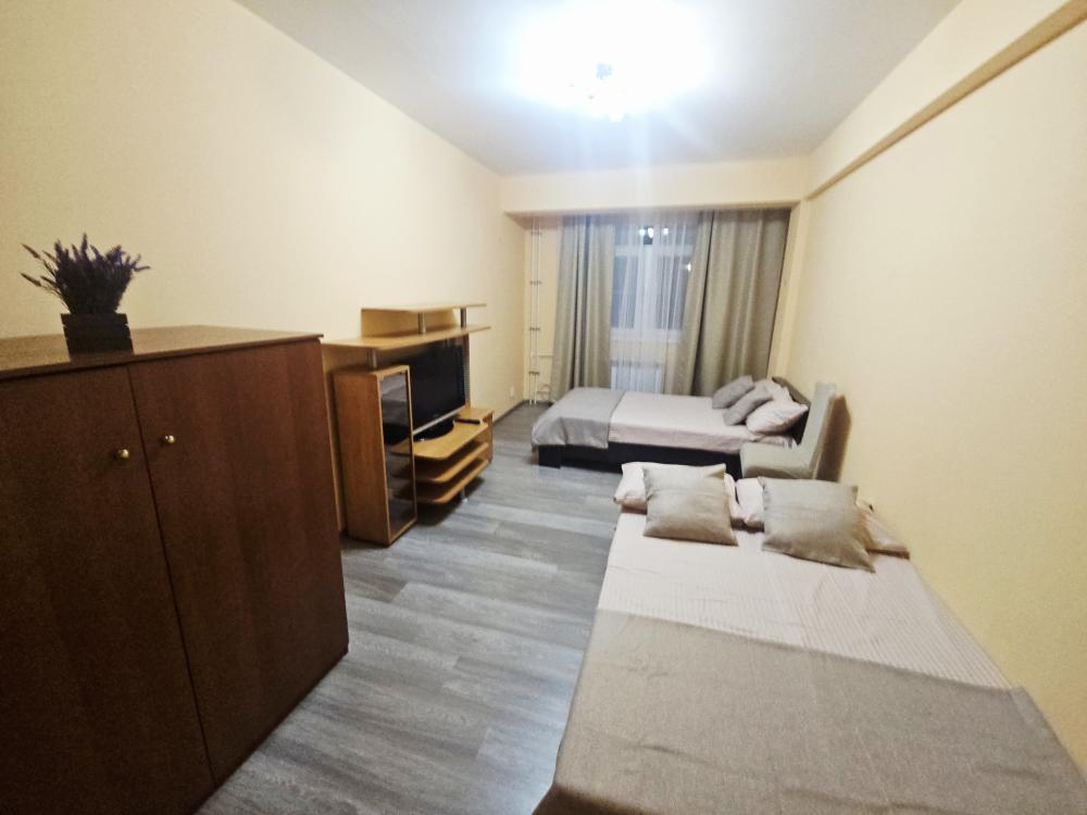 Апартаменты представляют собой большую однокомнатную квартиру улучшенного типа . Находится на 1 этаже, что делает их крайне удобным , если вы катаетесь на лыжах/сноуборде/велосипеде. Спальня и кухня - раздельные помещения с отдельными входами из коридора . В спальне : 2 спальная кровать , 1- спальная кровать, диван, шкаф, телевизор. В кухне- гостиной - 2 спальный диван. Кухня оборудована всем необходимым: плита 2- комфорочная , микроволновая печь, чайник , холодильник, посуда, стол. Санузел- туалет , душ, раковина. В апартаментах есть стиральная машина. Двор оборудован детской площадкой и парковкой для автомобилей( большое количество мест) . В соседнем торговом центра - 2 столовых , магазины Магнит, Пятерочка. Напротив расположены Казино и RED арена . До горнолыжного подъёмника пешком 12 минут или 2 остановки на автобусе.