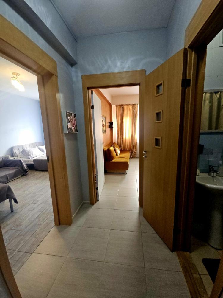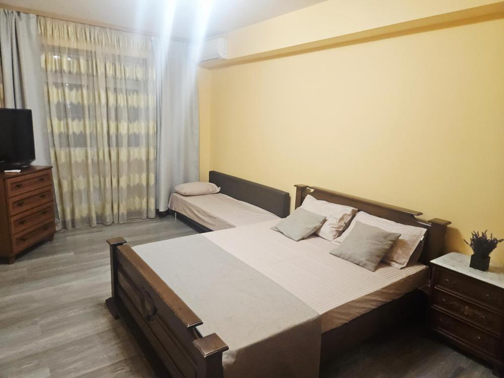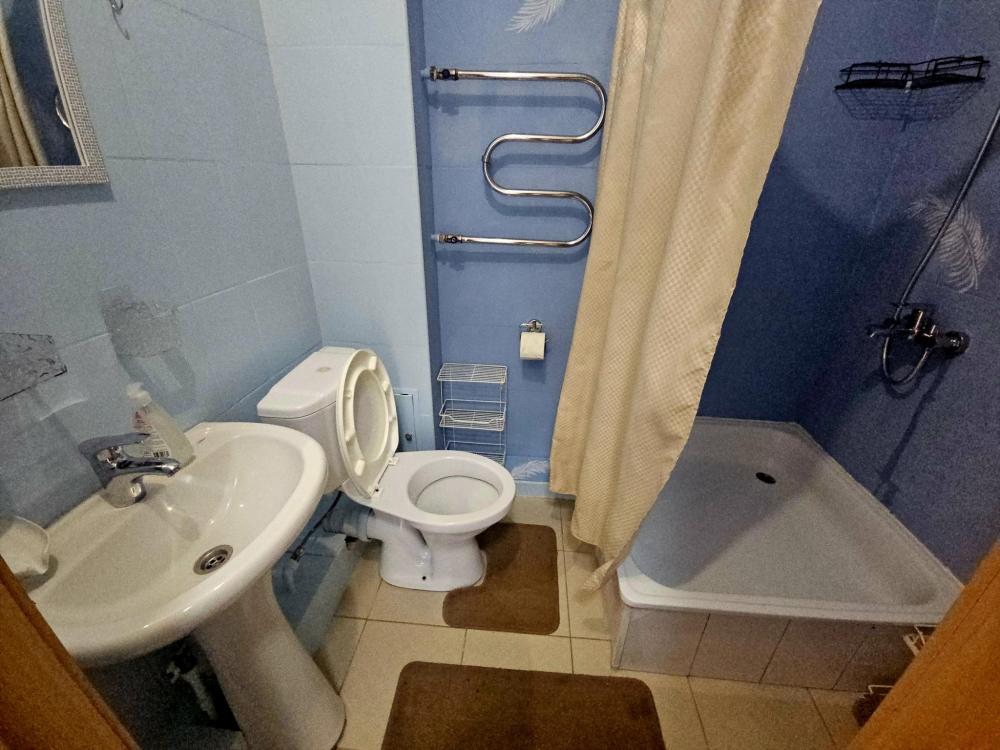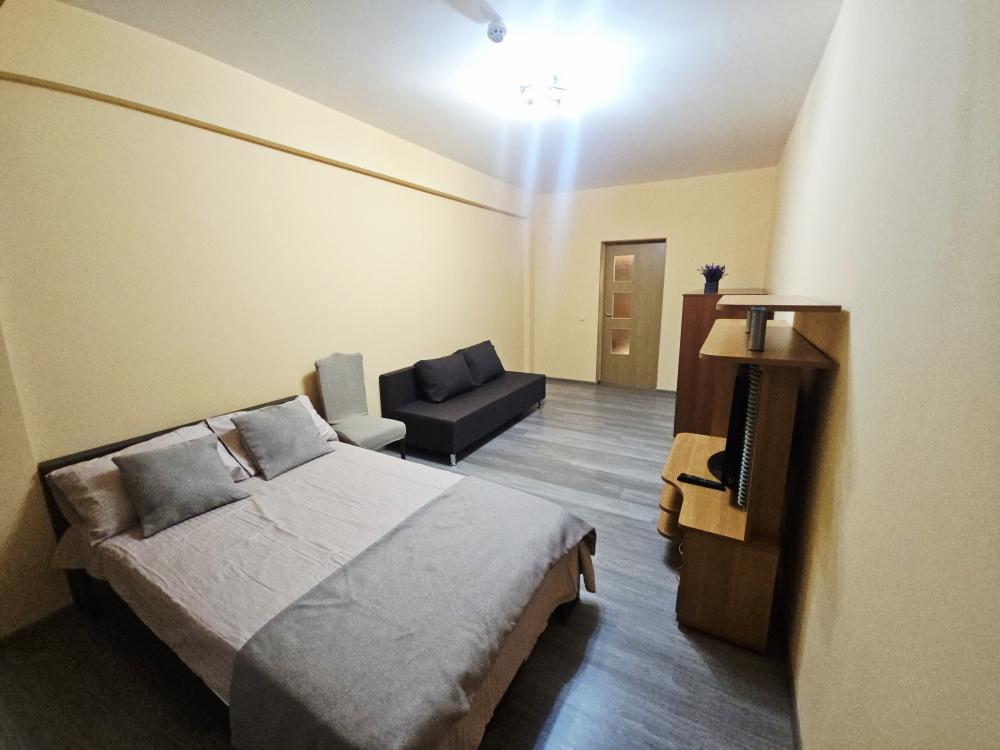 Апартаменты представляют собой большую однокомнатную квартиру улучшенного типа . Находится на 3 этаже. Спальня и кухня - раздельные помещения с отдельными входами из коридора . В спальне : 2 спальная кровать и 1 спальная кровать, шкаф для одежды , письменный стол, телевизор. В кухне -гостиной - 2 спальный диван . Кухня оборудована всем необходимым- плита 3- комфорочная газовая , микроволновая печь, чайник , холодильник, посуда. Балкон полностью открытый , с балкона видны горы. В апартаментах центральное отопление, есть кондиционер. Санузел совмещенный , стиральная машина. В соседнем торговом комплексе - магазины Магнит , Пятерочка , столовая , кафе.