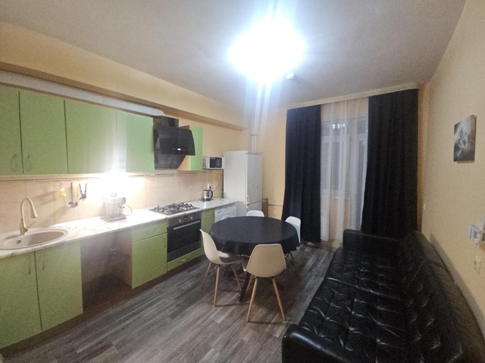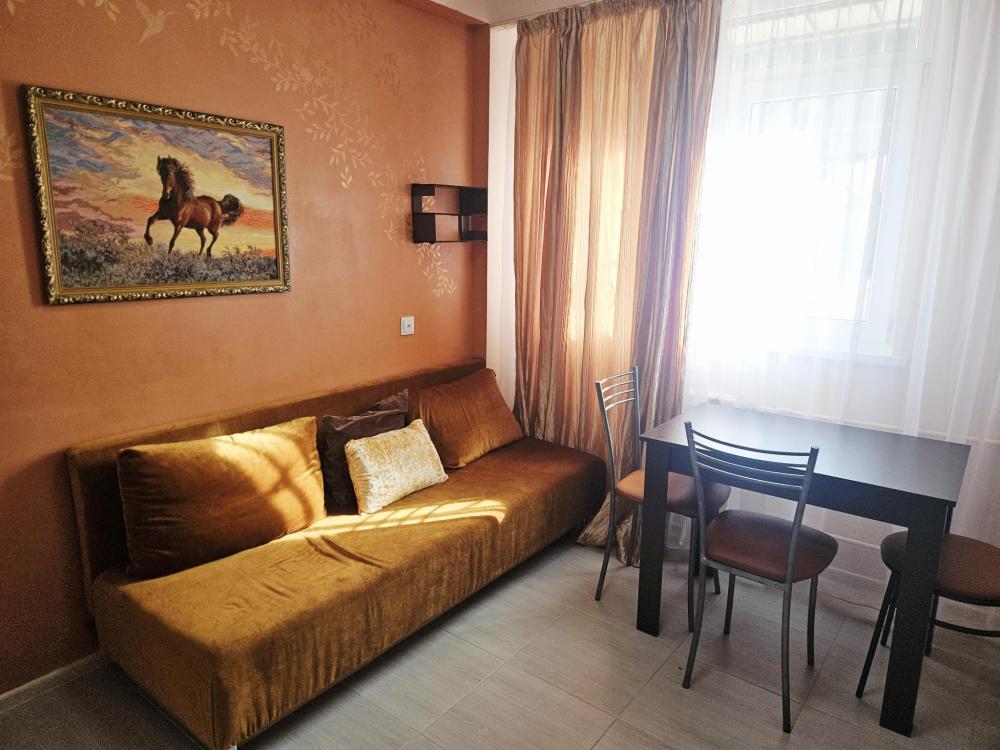 Апартаменты представляют собой большую однокомнатную квартиру улучшенного типа . Находится на 2 этаже. Спальня и кухня - раздельные помещения с отдельными входами из коридора . В спальне : 2 спальная кровать и 1 спальный диван- кровать. На кухне - 2 спальный диван. Кухня оборудована всем необходимым: плита 4- комфорочная с духовкой , микроволновая печь, чайник холодильник, посуда, стол. Балкон полностью открытый , с балкона видны горы. Санузел- туалет , душ, раковина. В апартаментах есть кондиционер и стиральная машина. В соседнем торговом комплексе - магазины Магнит , Пятерочка , столовая , кафе.