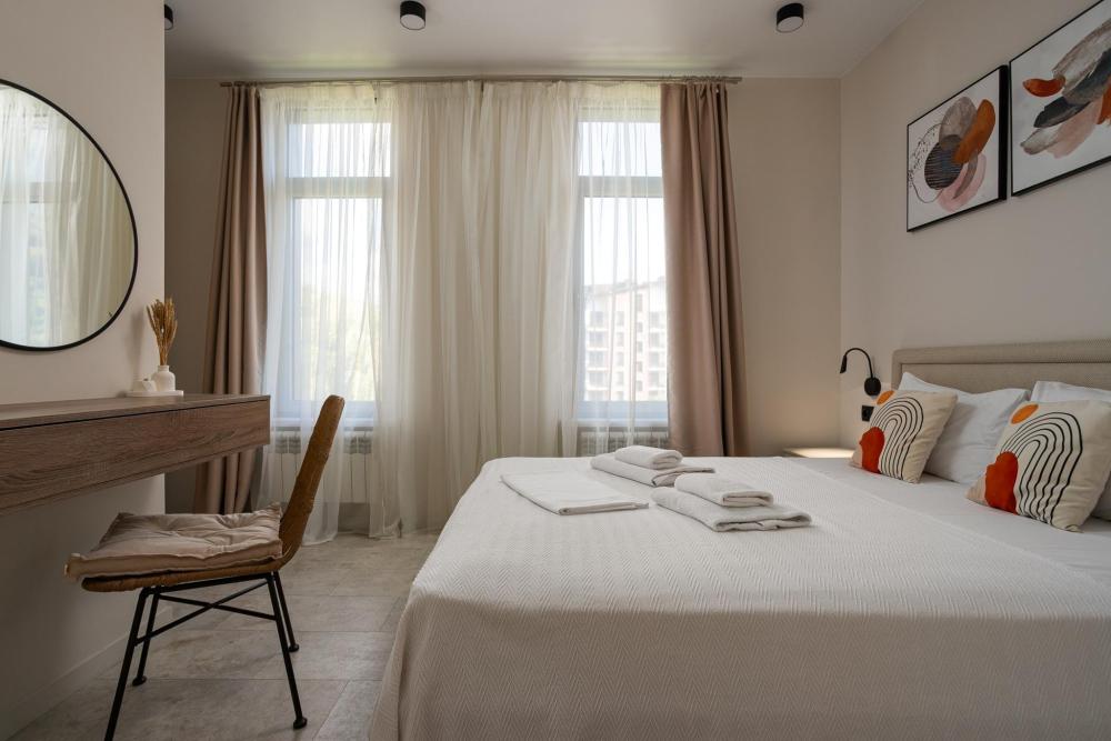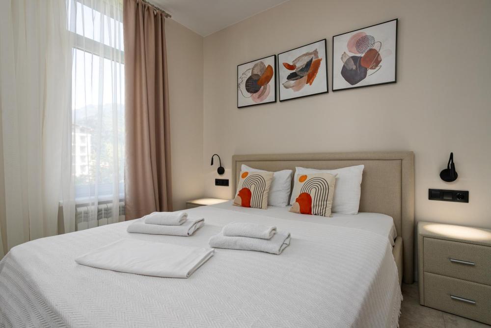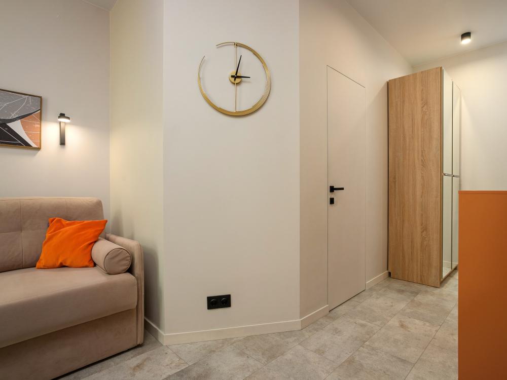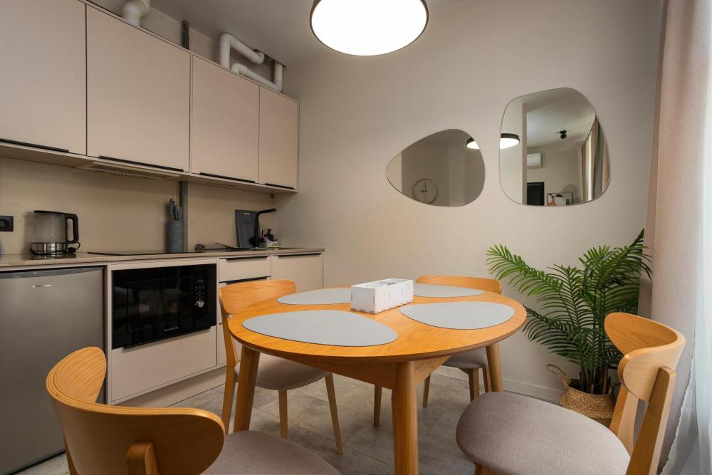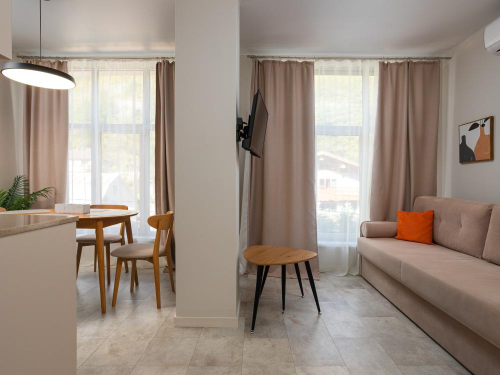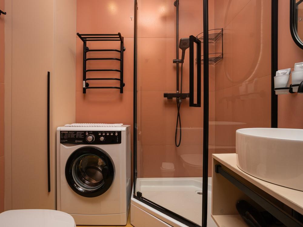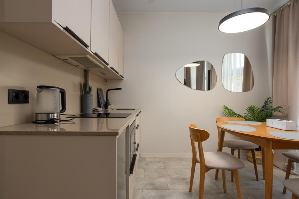 3 этаж Апартаменты вмещают 4 человек. Изолированная спальня с двуспальной кроватью и кухня-гостиная, с раскладным диваном. Есть всё для комфортного проживания: современное кухонное оборудование, набор посуды и столовых приборов, качественная сантехника. Уборка перед Вашим заселением, постельное белье и полотенца уже включены в стоимость проживания. ⏱️ Гибкое время заезда и выезда Размещение с животными