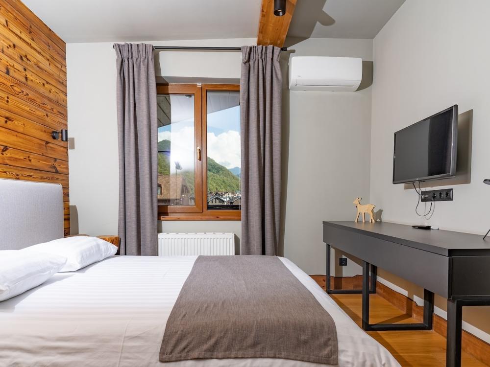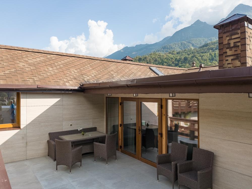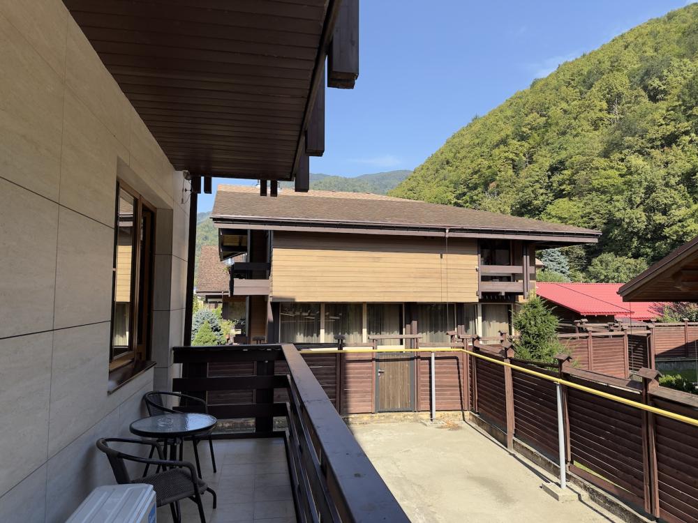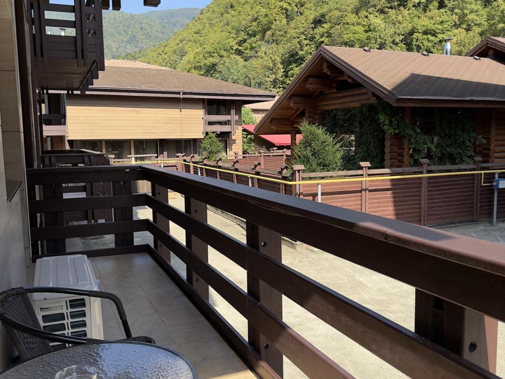 Студия с балконом площадью 27 м2 в комплексе Chalet Terrazza оснащена двуспальной кроватью (160см), имеет платяной шкаф, журнальный стол, уличную мебель, прикроватные тумбочки, кондиционер, телевизор, холидильник и чайник. Для удобства гостей предусмотрены халаты и тапочки. Посещение сауны комплекса Chalet Terrazza входит в стоимость. Комплекс Chalet Terrazza имеет бесплатную парковку. Курение возможно только на балконе.