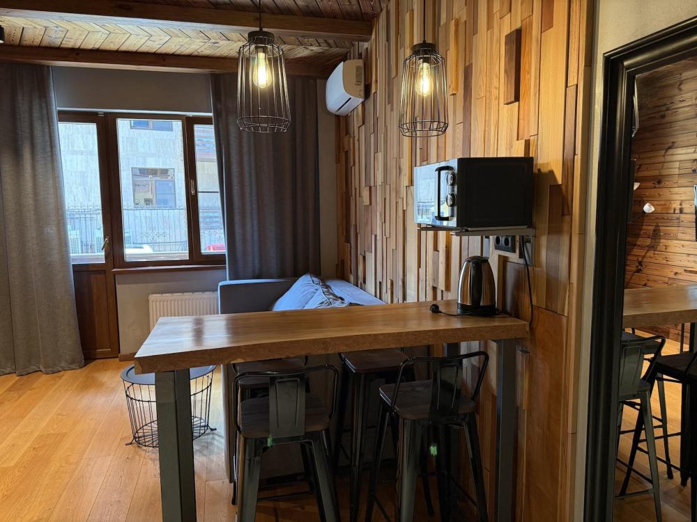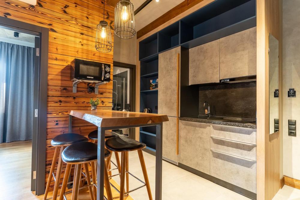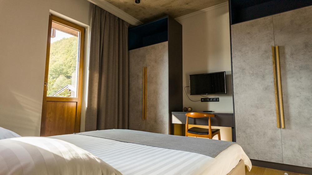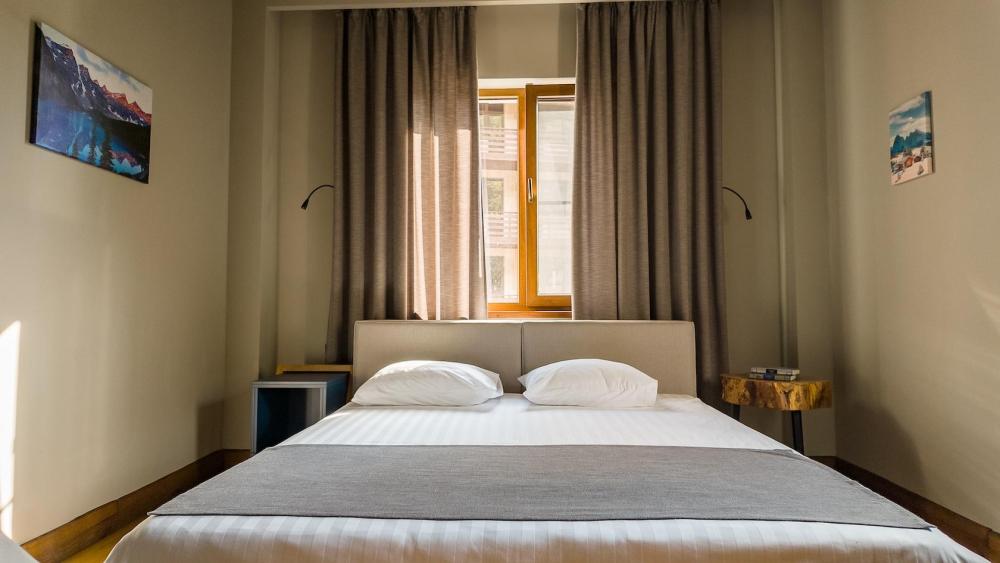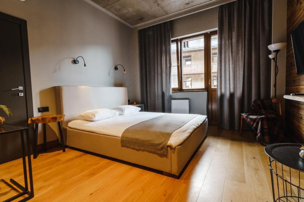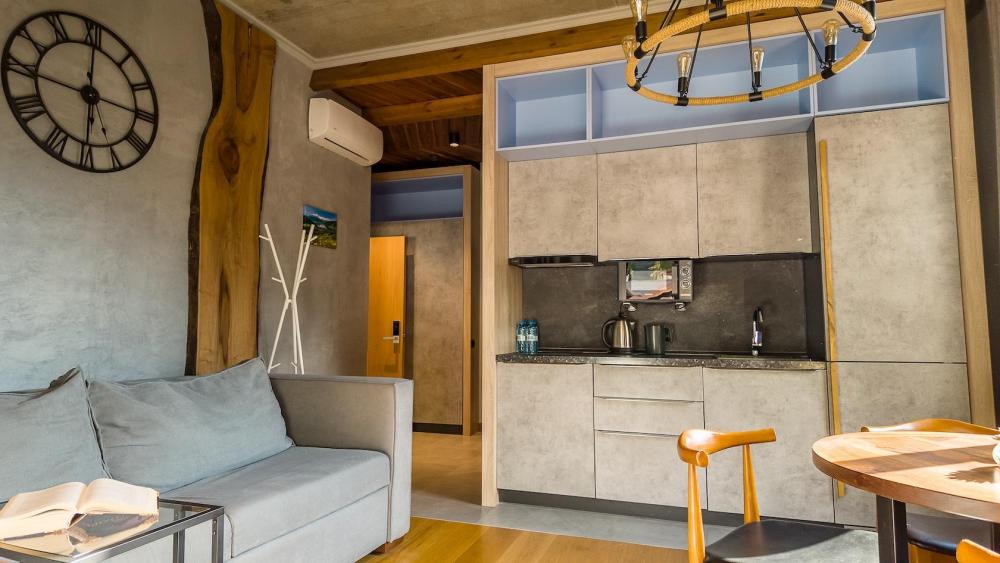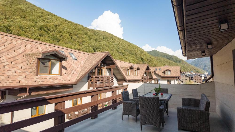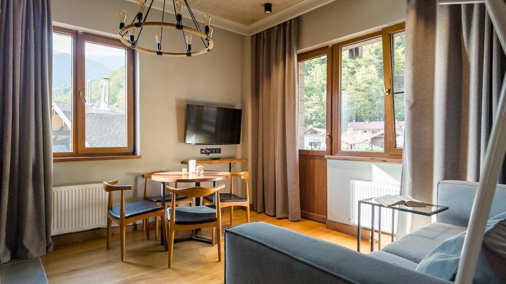 Двухкомнатные апартаменты "АПАРТАМЕНТЫ 47" площадью 47 м2 на 2 и 3 этажах комплекса Chalet Terrazza, включают кухню-гостинную, спальню и балконы. В спальне имеется двуспальная кровать (160см) , шкаф, тумбочки, телевизор и балкон. Кухня оборудована техникой и столовыми принадлежностями. В кухне-гостиной с раскладным диваном расположена обеденная зона и балкон с уличной мебелью. Для удобства гостей предусмотрены халаты и тапочки. Посещение сауны комплекса Chalet Terrazza входит в стоимость. Комплекс Chalet Terrazza имеет бесплатную парковку. 2-3 ЭТАЖ Максимальная вместимость апартамента - 4 гостей. Курение возможно только на балконах.