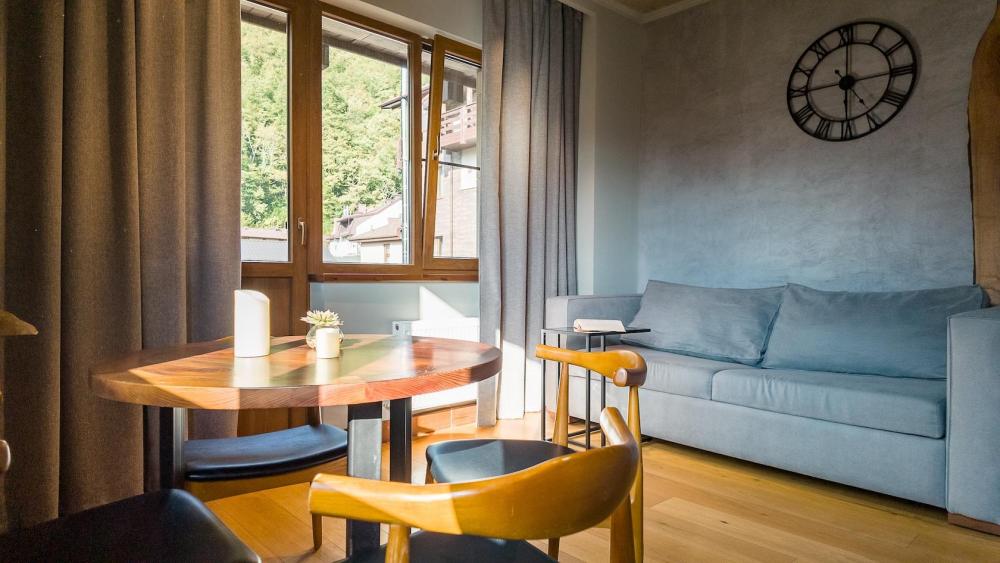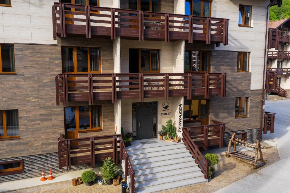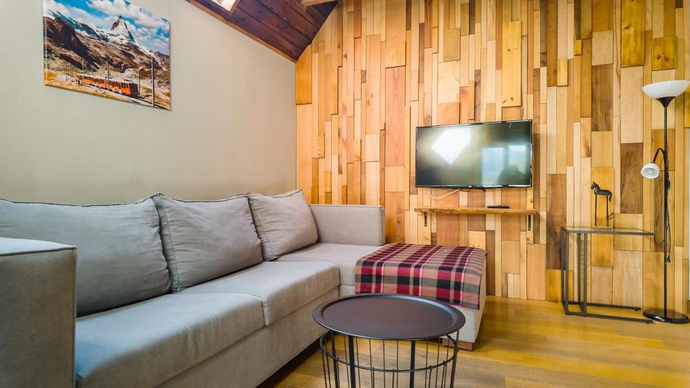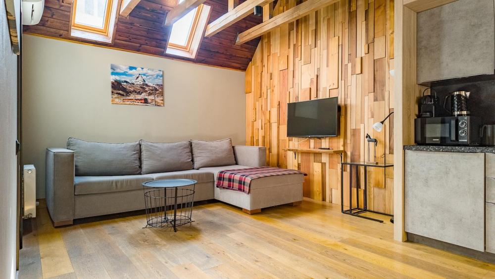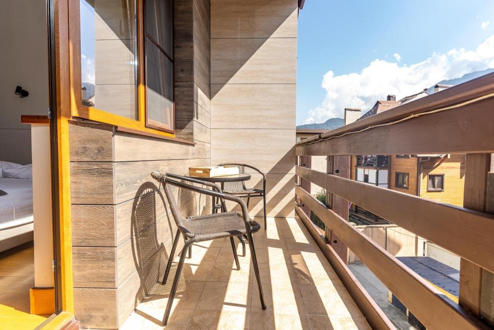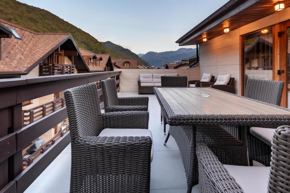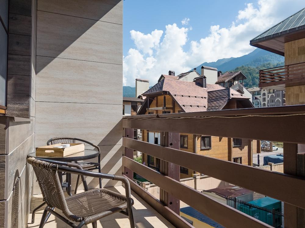Двухкомнатные "АПАРТАМЕНТЫ 1эт" на 1 этаже комплекса Chalet Terrazza, включает кухню-гостиную, спальню и балконы. Спальня оснащена двуспальной кроватью , имеет собственный телевизор, платяной шкаф и прикроватные тумбочки. Кухня оборудована техникой и столовыми принадлежностями. В кухне-гостиной с раскладным диваном расположена обеденная зона и балкон с уличной мебелью. Для удобства гостей предусмотрены халаты и тапочки. Посещение сауны комплекса Chalet Terrazza входит в стоимость. Комплекс Chalet Terrazza имеет бесплатную парковку. --- 1 ЭТАЖ Максимальная вместимость апартамента - 4 гостей. Курение возможно только на балконах.