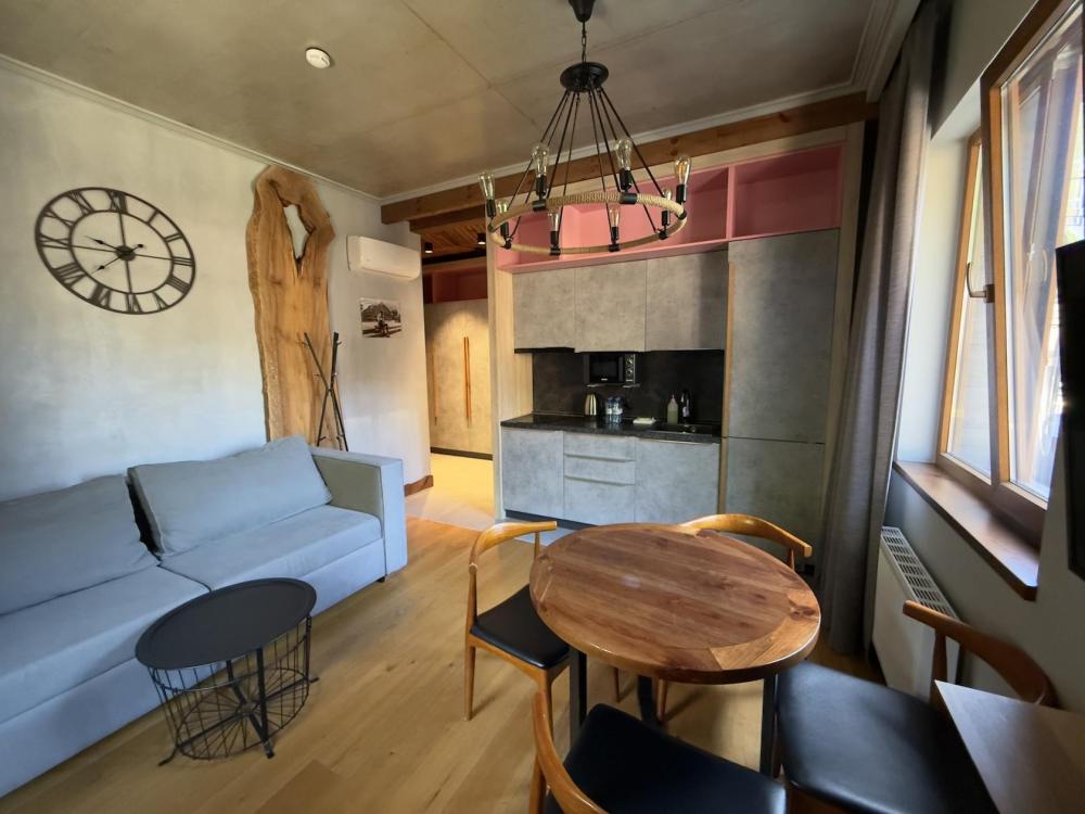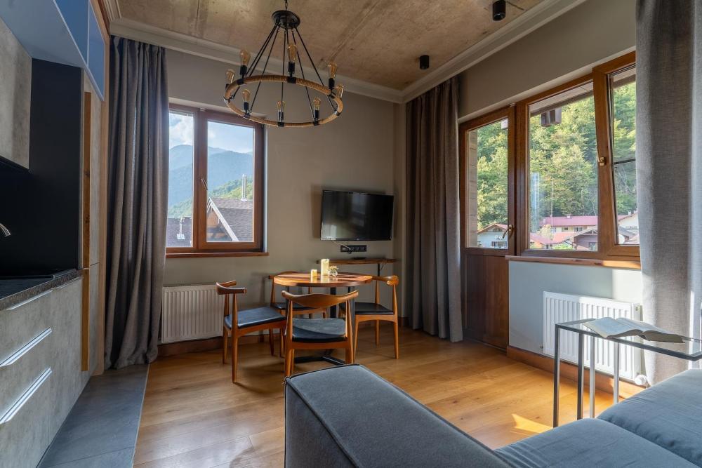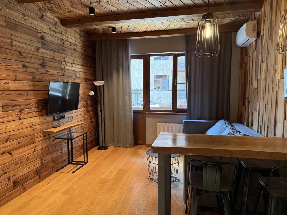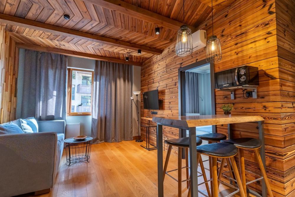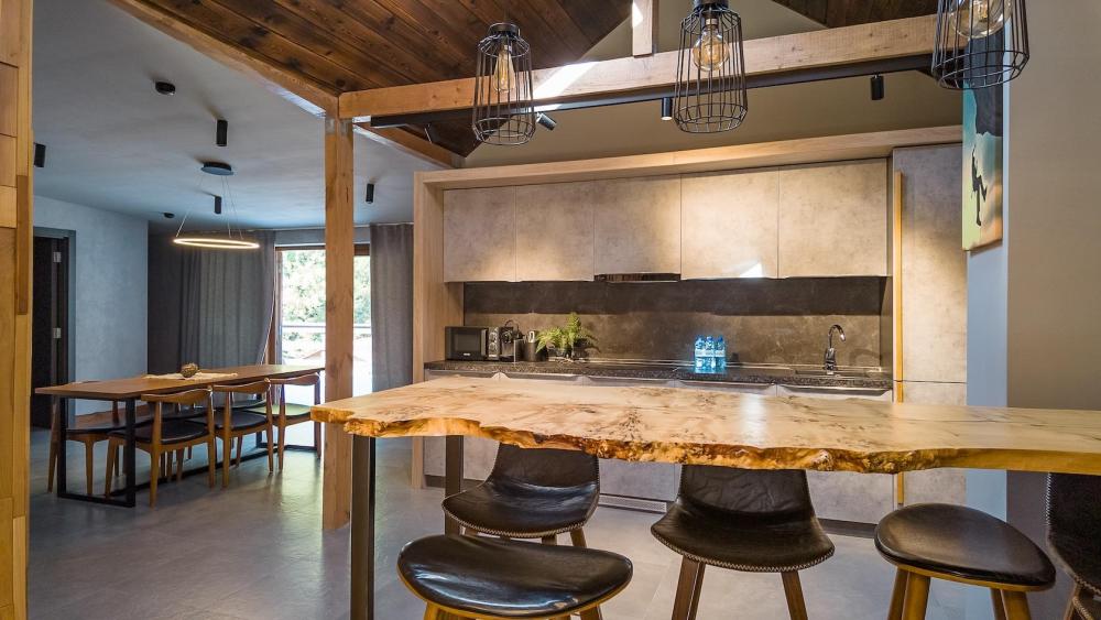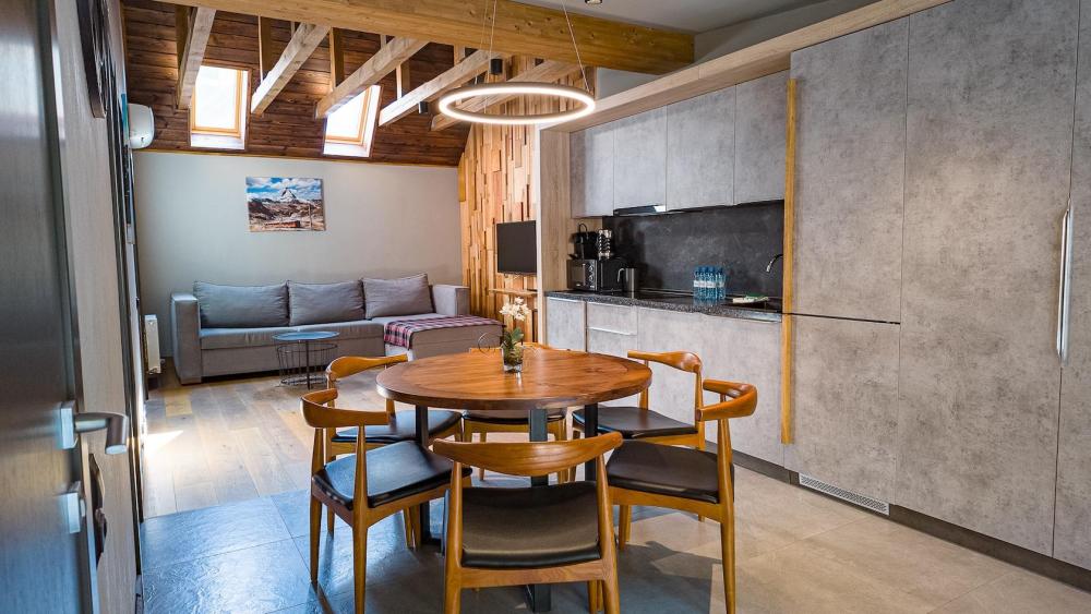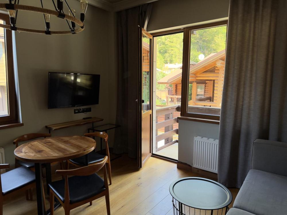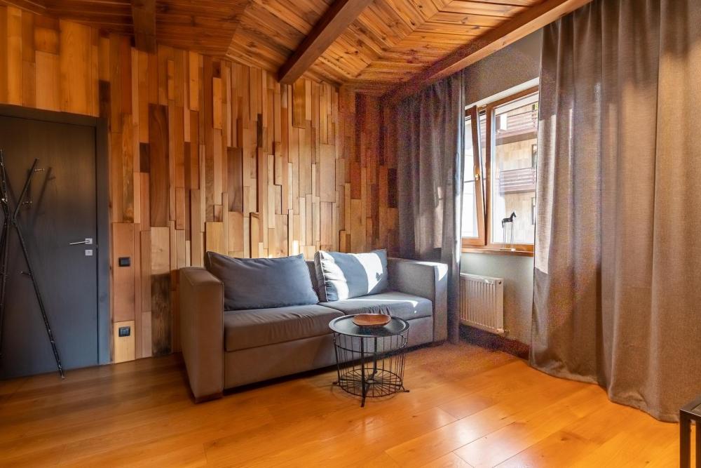 Двухкомнатные "АПАРТАМЕНТЫ 1эт" на 1 этаже комплекса Chalet Terrazza, включает кухню-гостиную, спальню и балконы. Спальня оснащена двуспальной кроватью , имеет собственный телевизор, платяной шкаф и прикроватные тумбочки. Кухня оборудована техникой и столовыми принадлежностями. В кухне-гостиной с раскладным диваном расположена обеденная зона и балкон с уличной мебелью. Для удобства гостей предусмотрены халаты и тапочки. Посещение сауны комплекса Chalet Terrazza входит в стоимость. Комплекс Chalet Terrazza имеет бесплатную парковку. --- 1 ЭТАЖ Максимальная вместимость апартамента - 4 гостей. Курение возможно только на балконах.