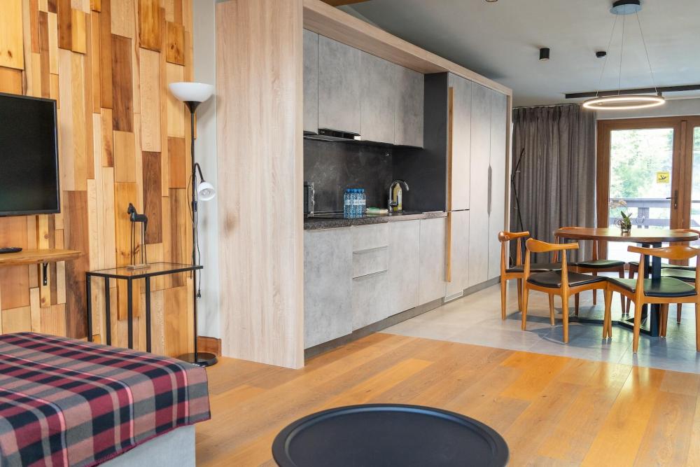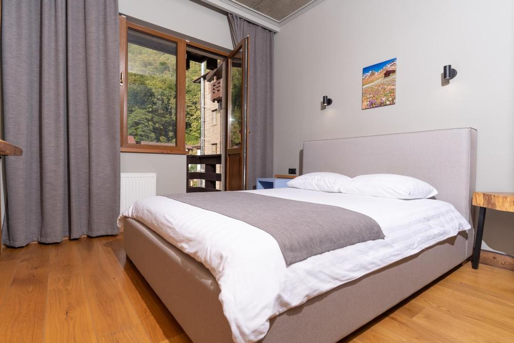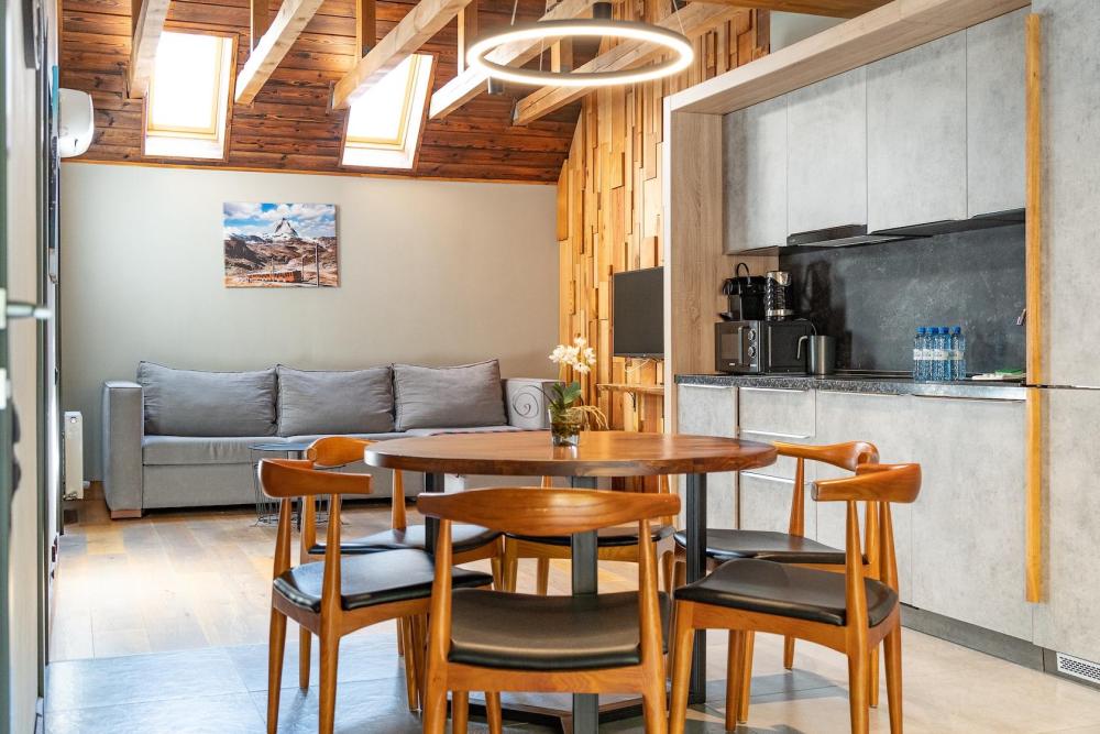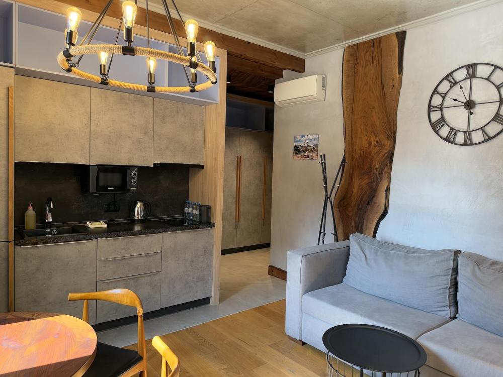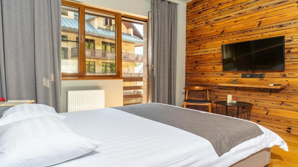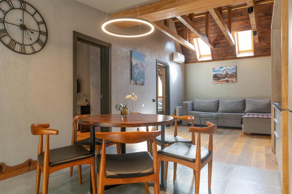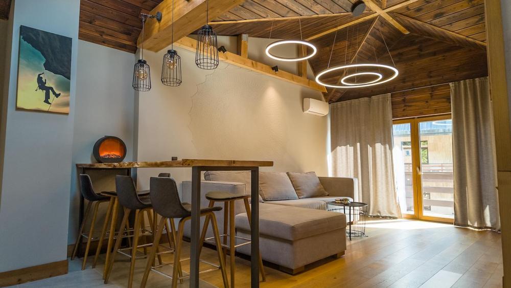 Двухкомнатные "АПАРТАМЕНТЫ 1эт" на 1 этаже комплекса Chalet Terrazza, включает кухню-гостиную, спальню и балконы. Спальня оснащена двуспальной кроватью , имеет собственный телевизор, платяной шкаф и прикроватные тумбочки. Кухня оборудована техникой и столовыми принадлежностями. В кухне-гостиной с раскладным диваном расположена обеденная зона и балкон с уличной мебелью. Для удобства гостей предусмотрены халаты и тапочки. Посещение сауны комплекса Chalet Terrazza входит в стоимость. Комплекс Chalet Terrazza имеет бесплатную парковку. --- 1 ЭТАЖ Максимальная вместимость апартамента - 4 гостей. Курение возможно только на балконах.