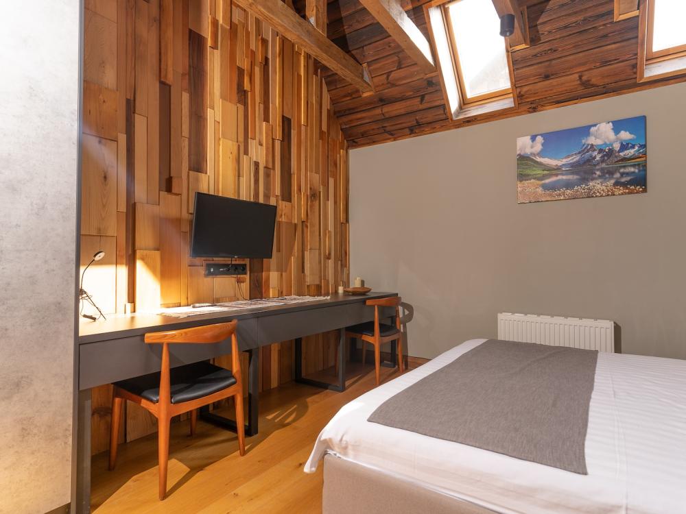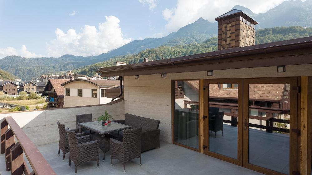 Трехкомнатный пентхаус ПЕНТХАУС 110 площадью 110 кв. метров на 4 этаже комплекса Chalet Terrazza, включает гостиную, две спальни, балконы и просторную уличную террасу. В каждой из двух спален имеется двуспальная кровать (160см) , шкаф, письменный стол телевизор. Кухня полностью оборудована техникой и столовыми принадлежностями. В кухне-гостиной с раскладным диваном расположена обеденная зона. Пентхаус имеет собственную уличную террасу с мебелью. Он подойдет семье с детьми или большой компании друзей. Для удобства гостей предусмотрены халаты и тапочки. Посещение сауны комплекса Chalet Terrazza входит в стоимость. Комплекс Chalet Terrazza имеет бесплатную парковку. 4 ЭТАЖ Максимальная вместимость апартамента - 6 гостей. Курение возможно только на террасе и балконах.