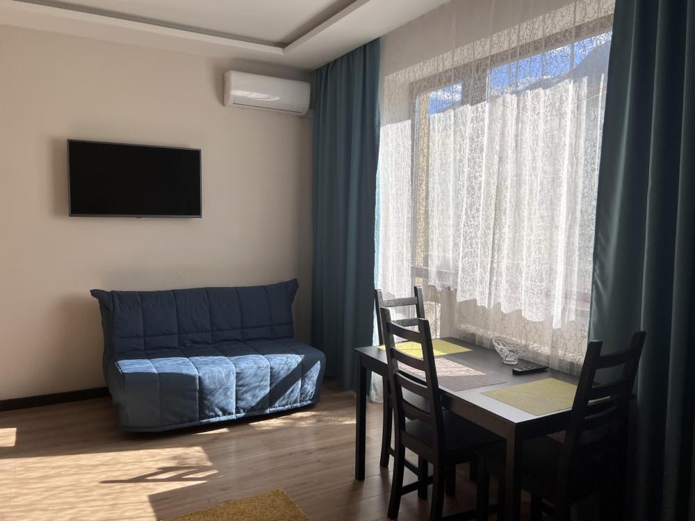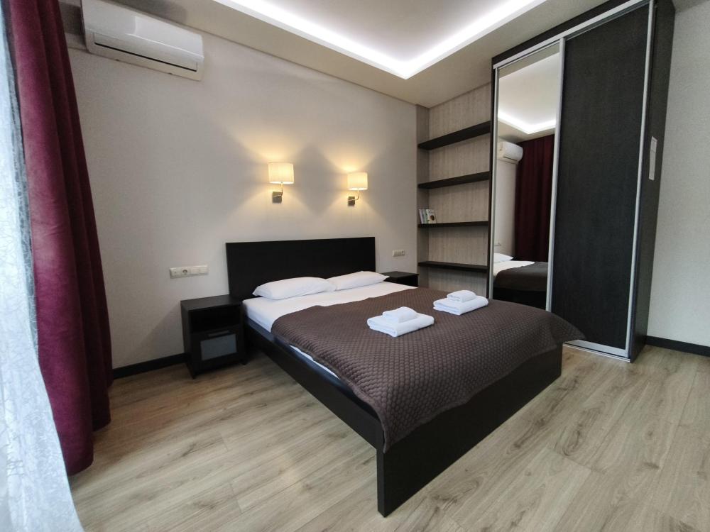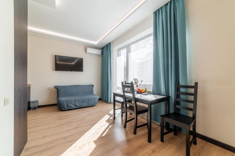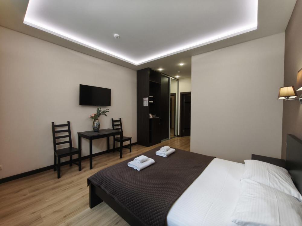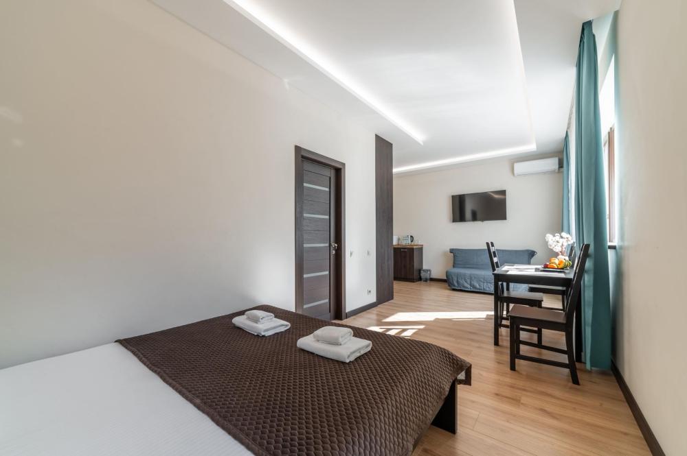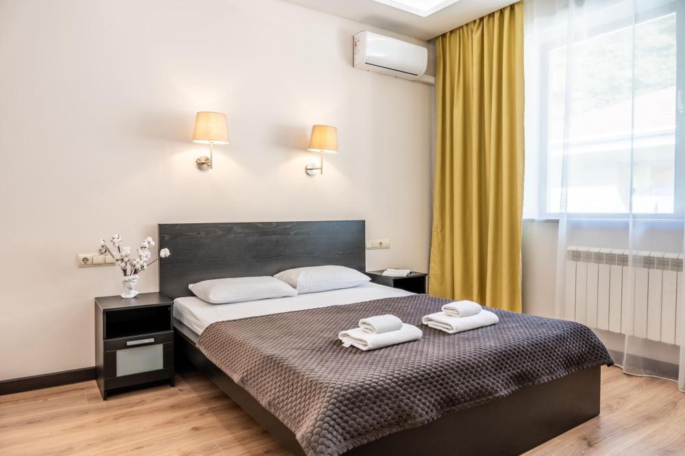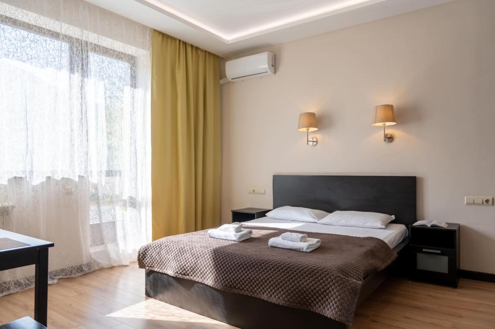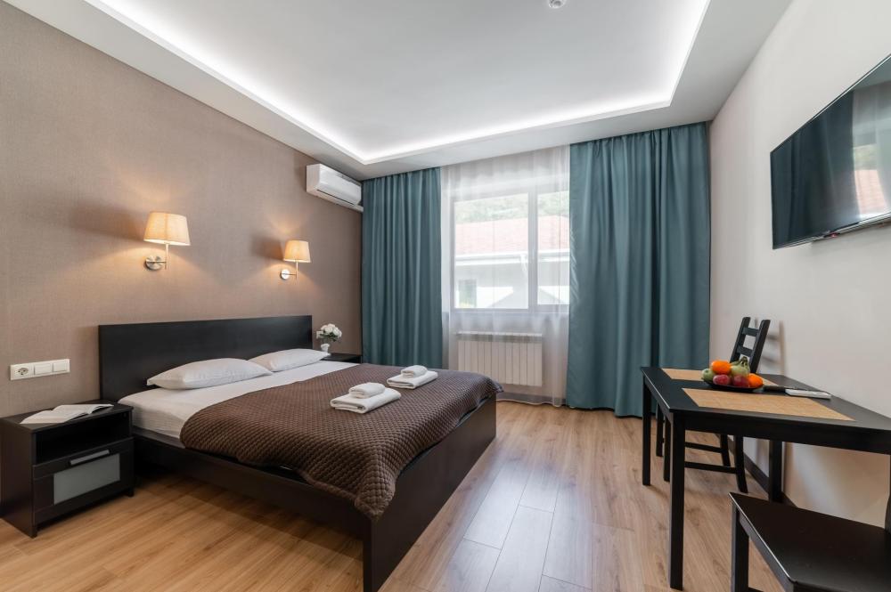 Двухместная комфортабельный номер, оснащен: двуспальная кровать с удобным матрасом, кондиционер, плоский телевизор, обеденный стол, холодильник, кухонная зона, чайник, микроволновка, столовая посуда, душ, туалет.
