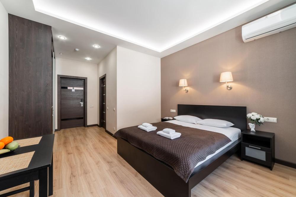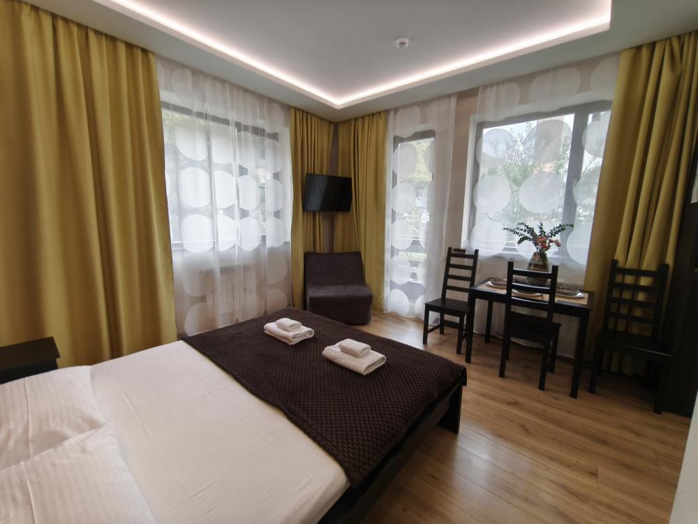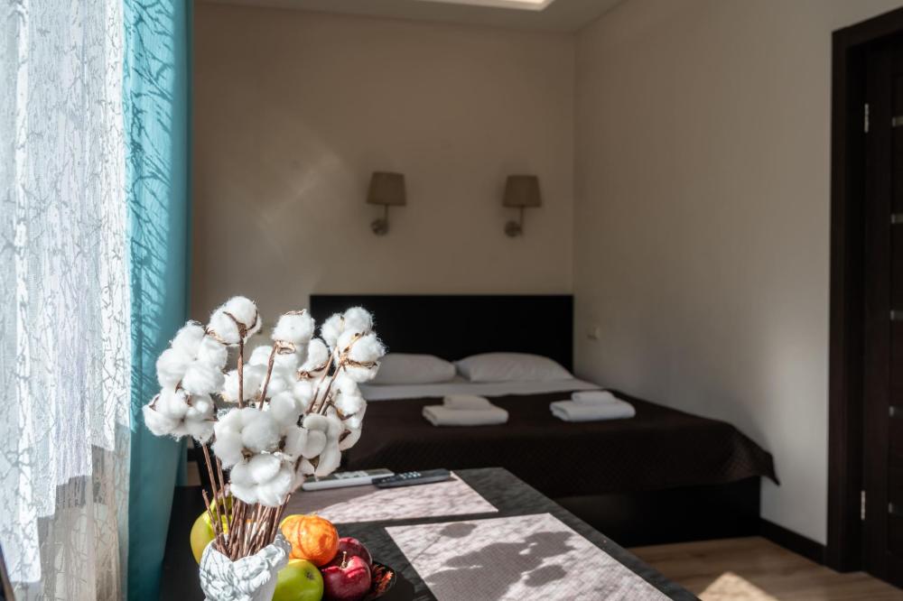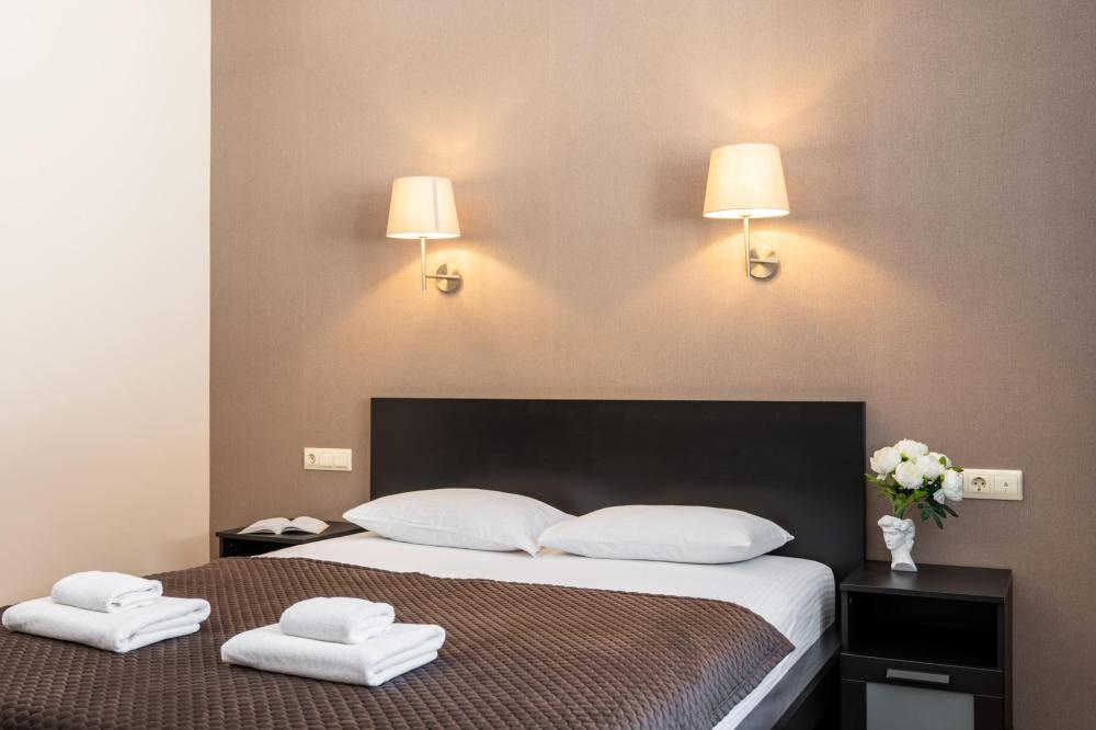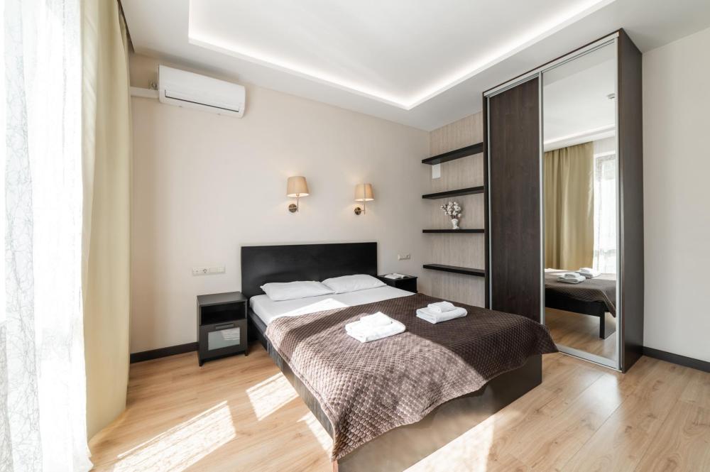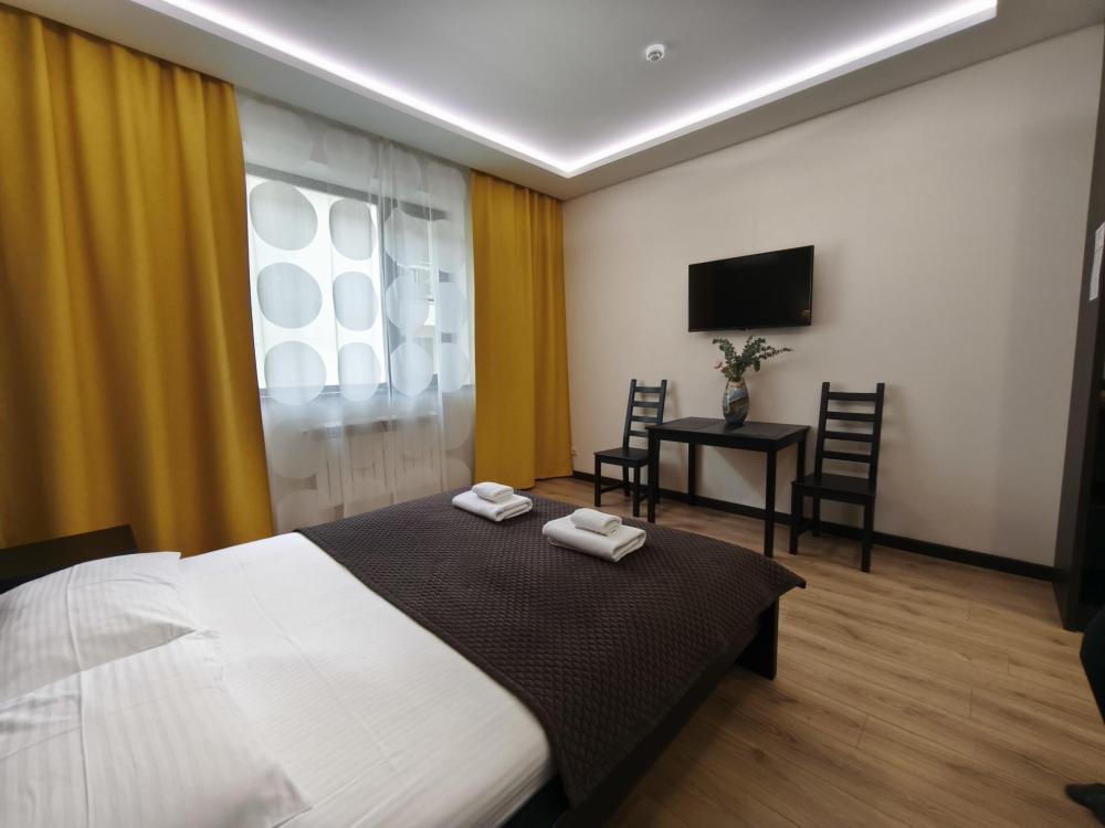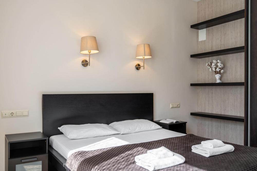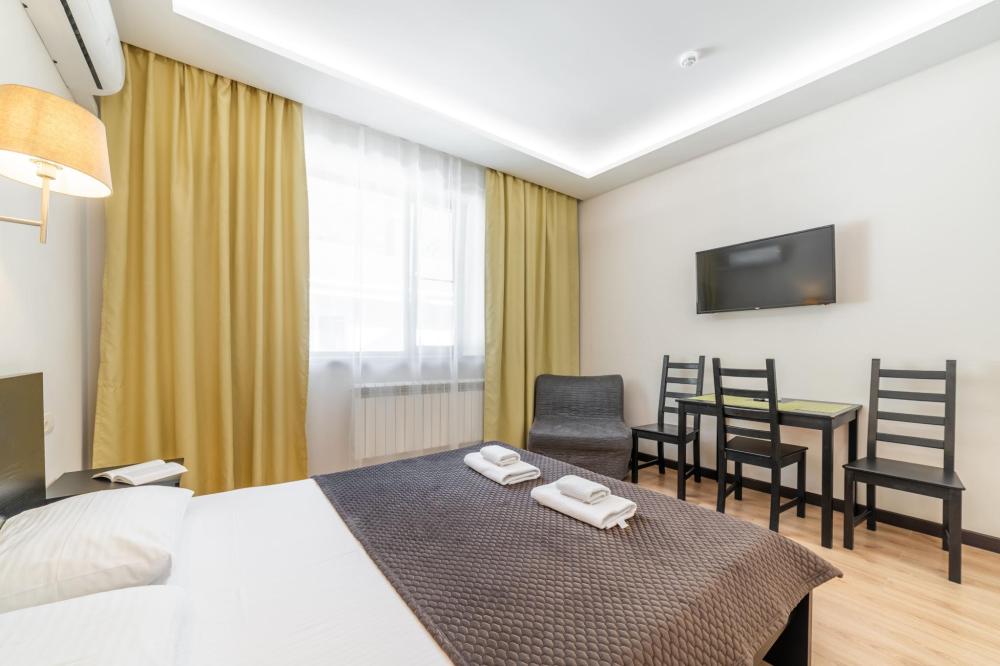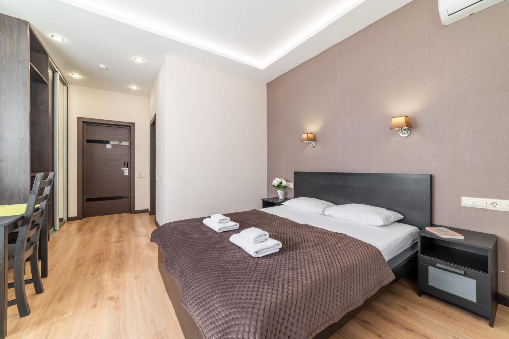 Двухместная комфортабельный номер, оснащен: двуспальная кровать с удобным матрасом, кондиционер, плоский телевизор, обеденный стол, холодильник, кухонная зона, чайник, микроволновка, столовая посуда, душ, туалет.