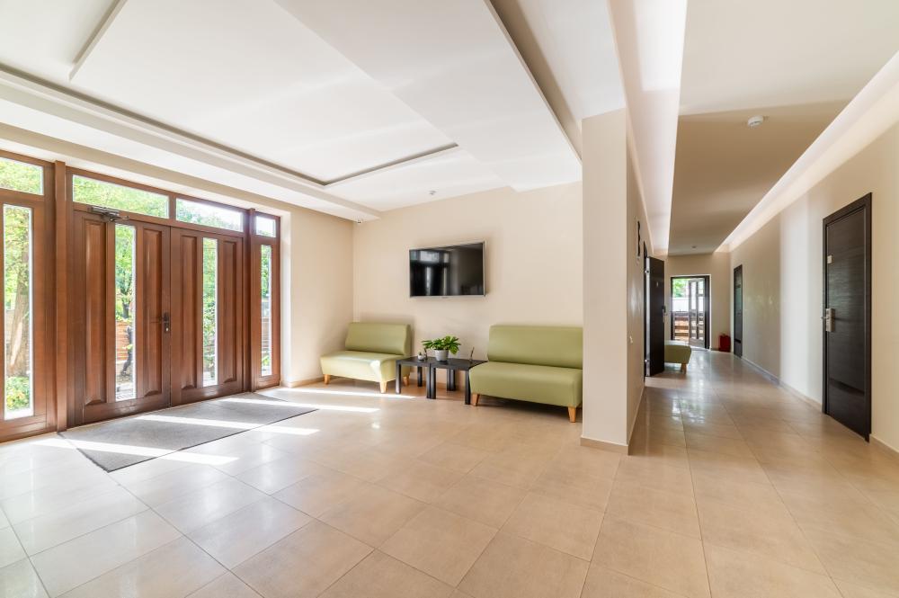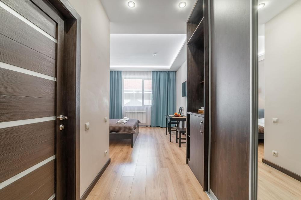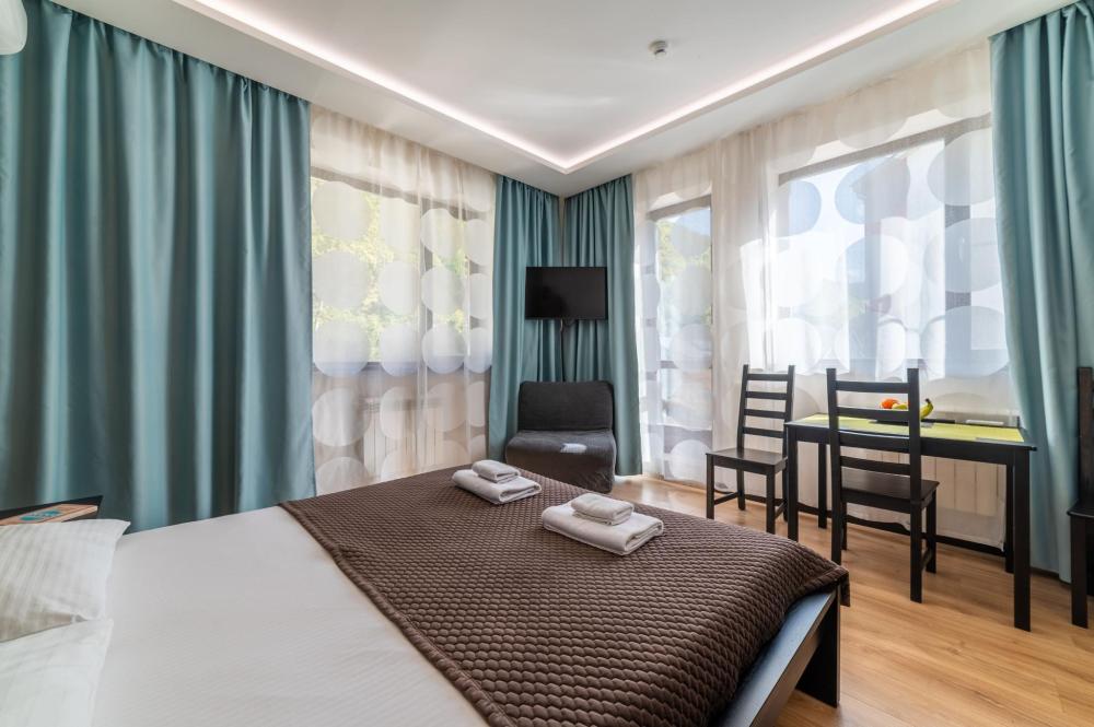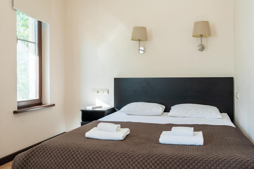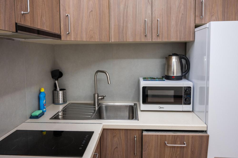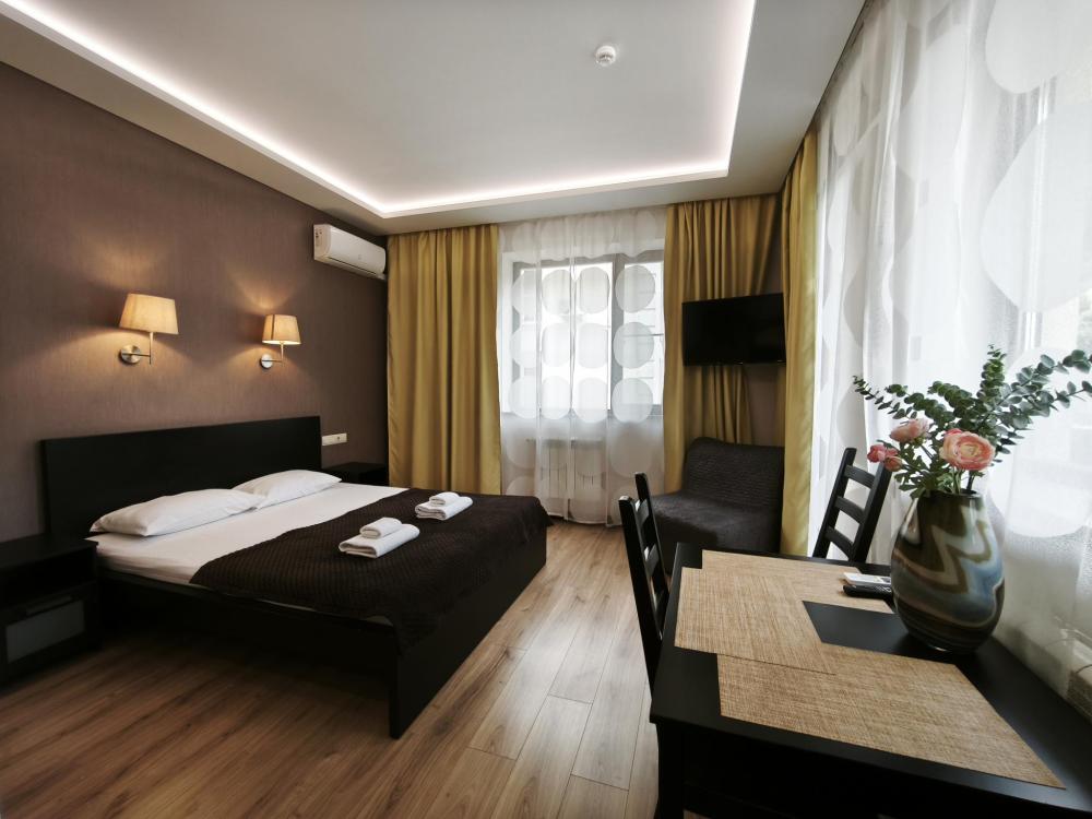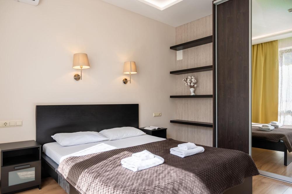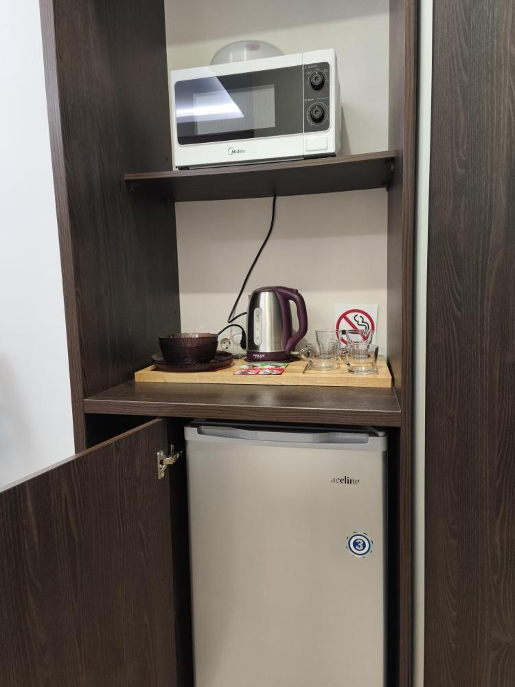 Двухместная комфортабельный номер, оснащен: двуспальная кровать с удобным матрасом, кондиционер, плоский телевизор, обеденный стол, холодильник, кухонная зона, чайник, микроволновка, столовая посуда, душ, туалет.