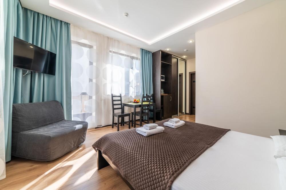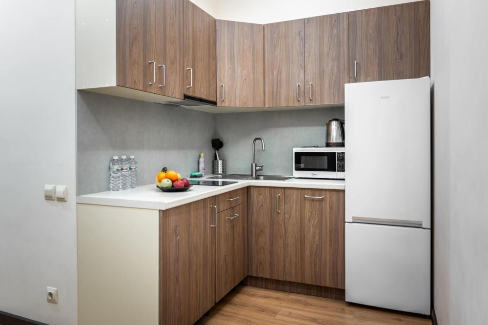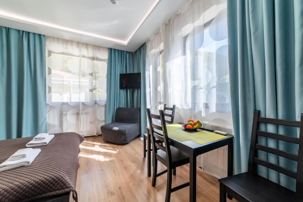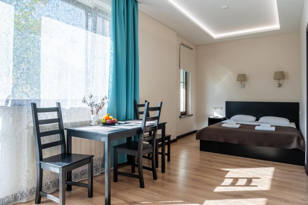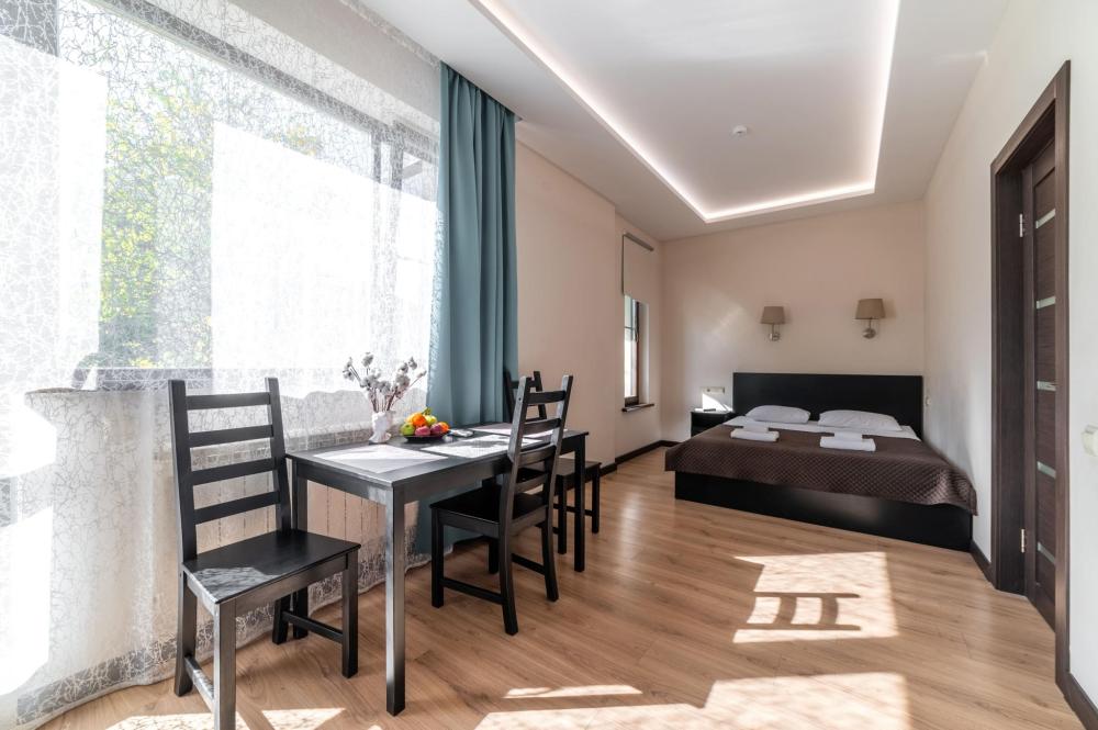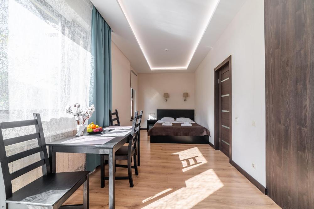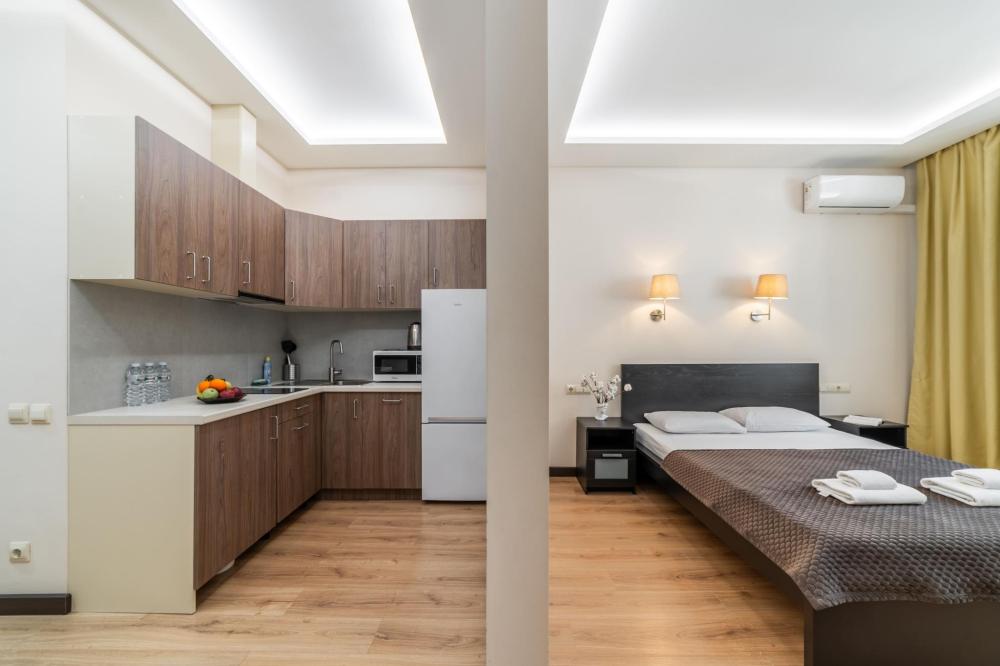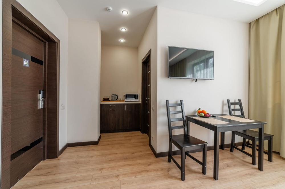 Апартаменты с кухней, в которых предусмотрено всё необходимое для проживания: двуспальная кровать, телевизор, обеденный стол, кухонный гарнитур, столовые принадлежности, СВЧ-печь, чайник, холодильник, посудомоечная машина, индукционная печь, фен. Прочувствовать особую атмосферу дома позволяет оборудованная кухня с обеденной зоной, где приятно приготовить завтрак или заварить кофе. Кроме того, есть возможность дополнительного спального места (кресло-кровать), что позволяет комфортно разместиться семьей.