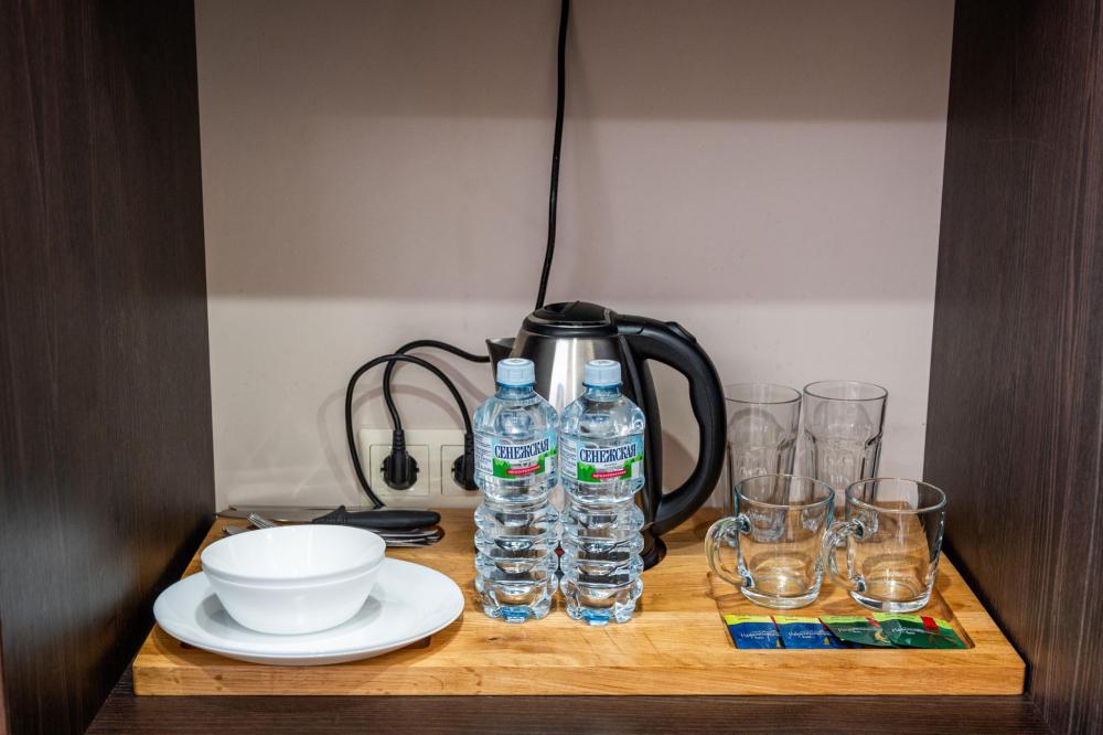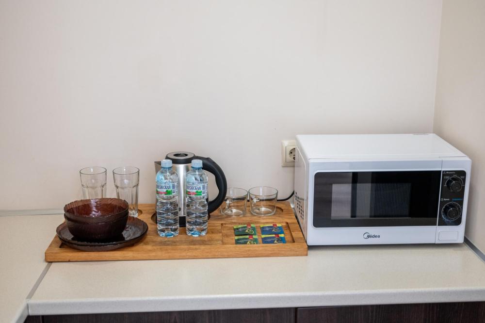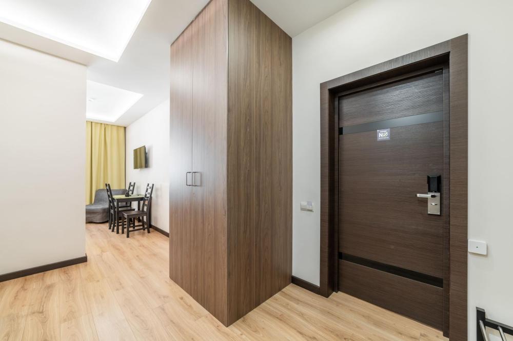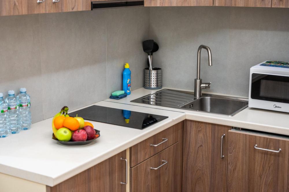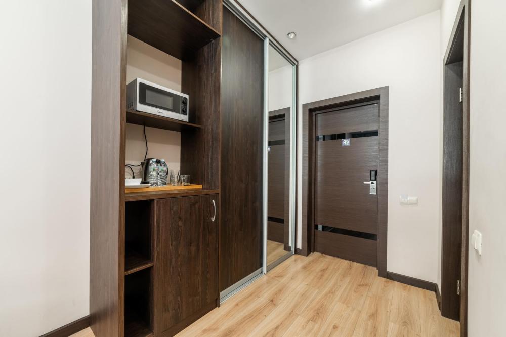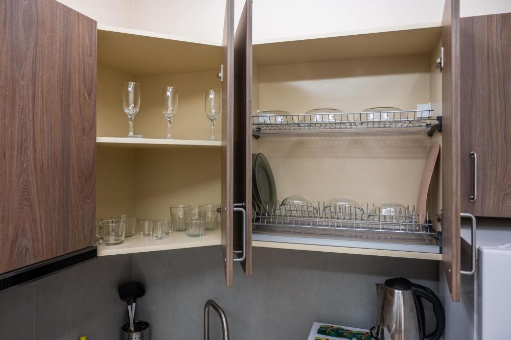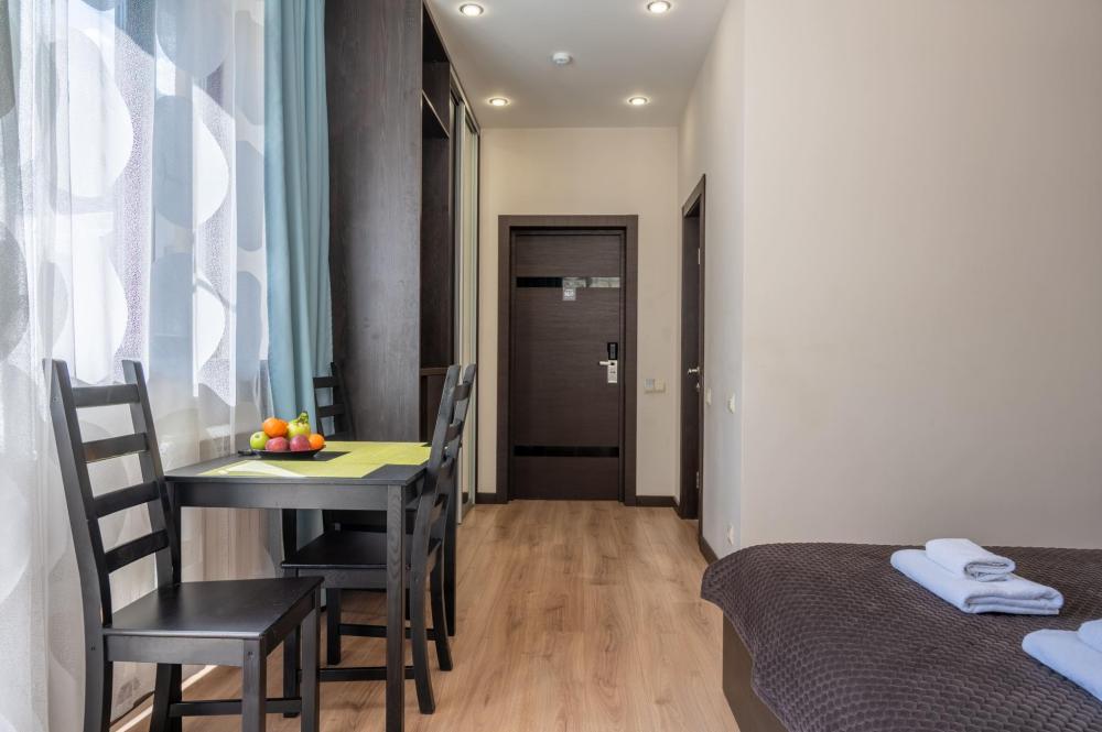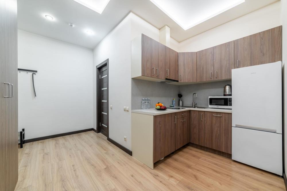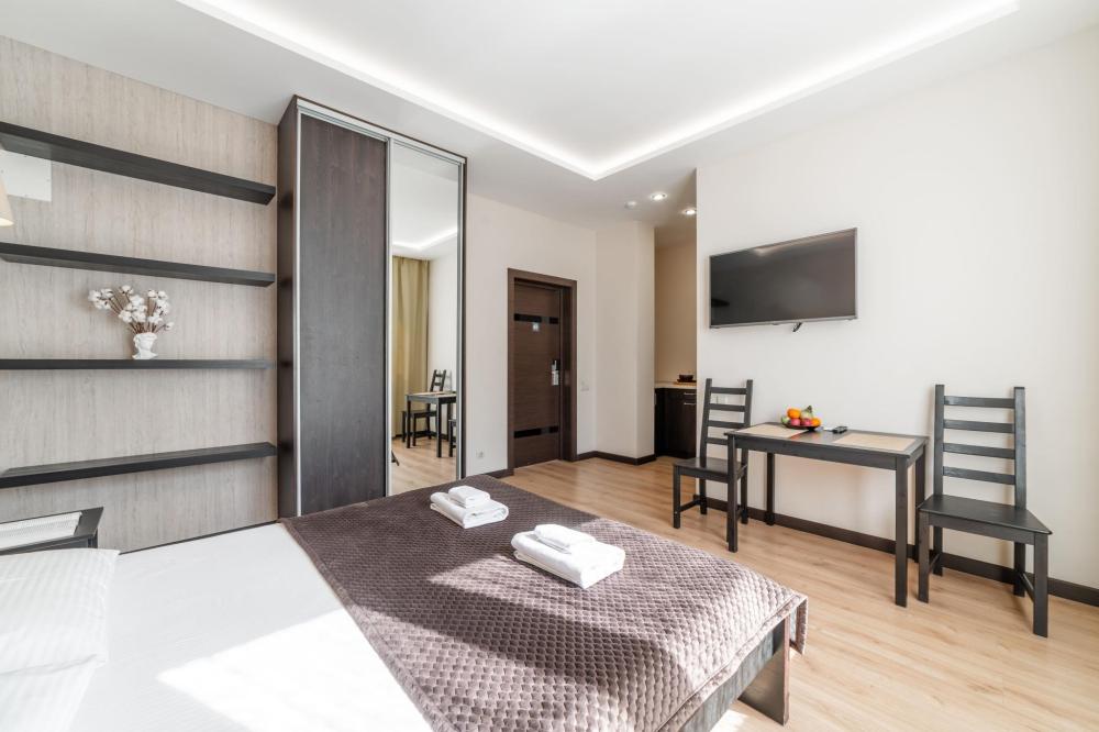 Апартаменты с кухней, в которых предусмотрено всё необходимое для проживания: двуспальная кровать, телевизор, обеденный стол, кухонный гарнитур, столовые принадлежности, СВЧ-печь, чайник, холодильник, посудомоечная машина, индукционная печь, фен. Прочувствовать особую атмосферу дома позволяет оборудованная кухня с обеденной зоной, где приятно приготовить завтрак или заварить кофе. Кроме того, есть возможность дополнительного спального места (кресло-кровать), что позволяет комфортно разместиться семьей.