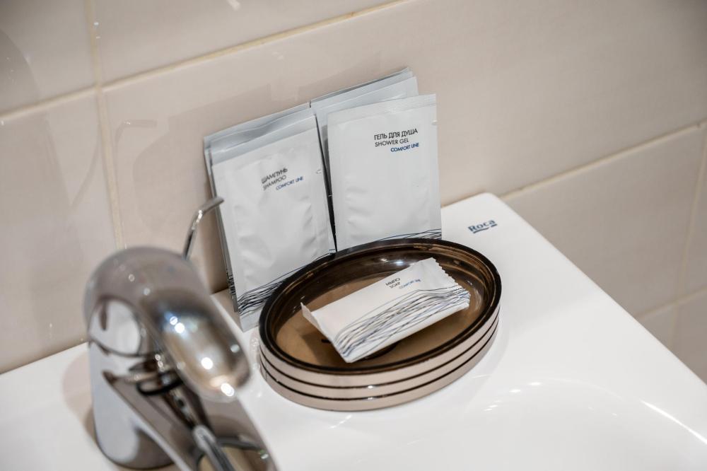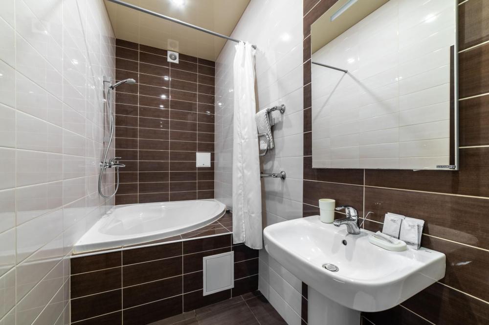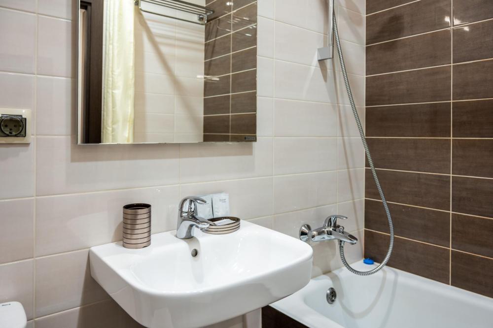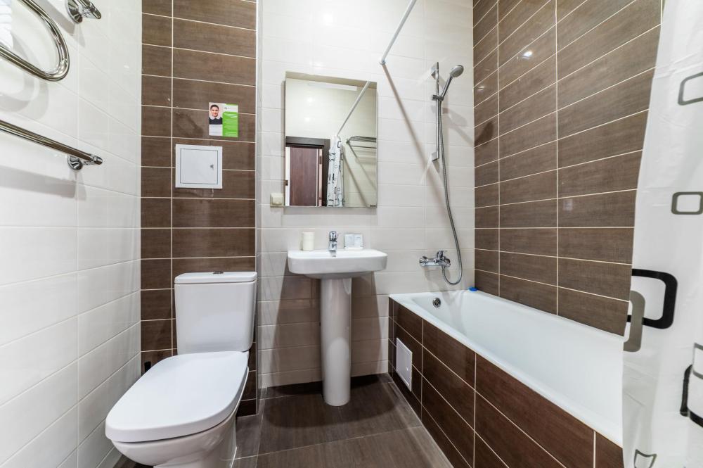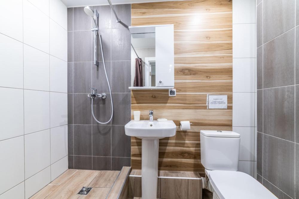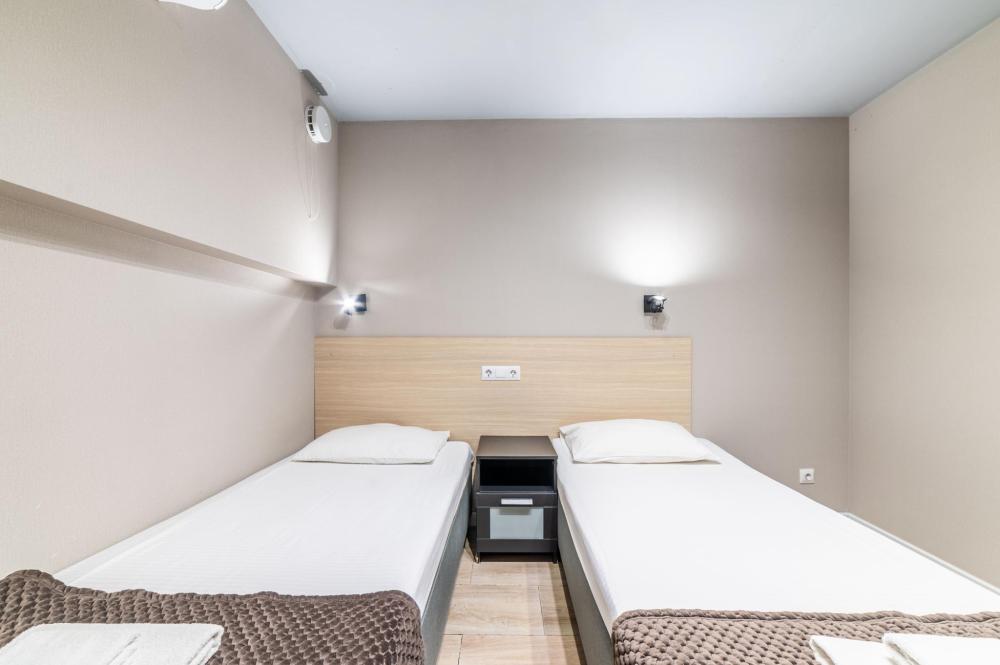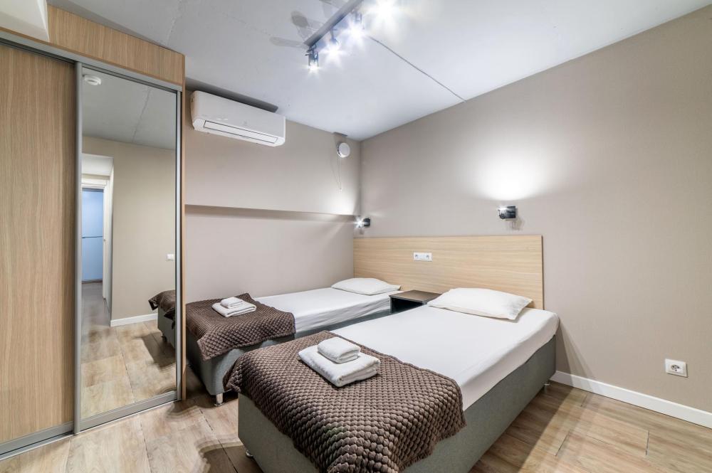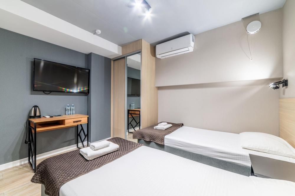 Стандарт без окна находится на цокольном этаже. В комнате есть всё необходимое для комфортного проживания: 2 односпальные кровати, телевизор, кондиционер, шкаф, стол, чайник и тапочки. В ванной: душ, туалет, фен и гигиенические принадлежности. Комната оснащена тёплыми полами, чтобы было комфортно и тепло.