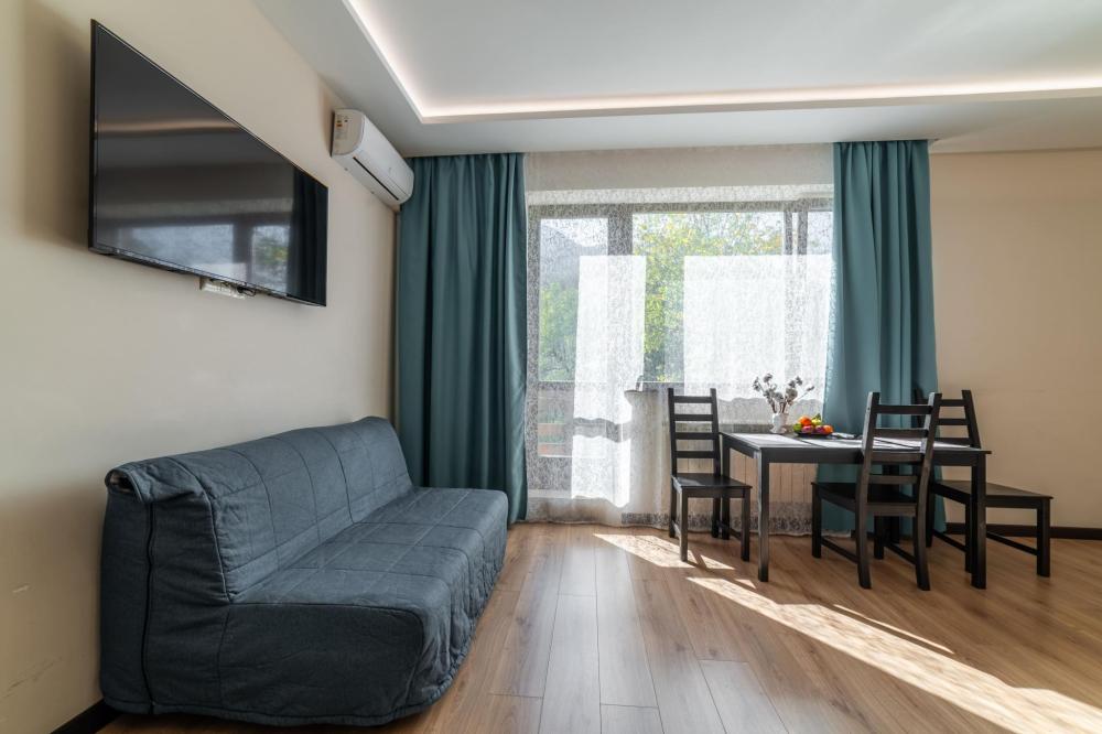 Роскошный номер с видом на горы, комната подходит для размещения от одного до четырёх гостей. В комнате: двуспальная кровать с удобным матрасом, комфортный для сна диван, холодильник, плоский телевизор, wi-fi, кондиционер, обеденная зона, чайник, микроволновка, посуда. В ванной комнате: угловая ванна, туалет, фен, шампунь, гель для душа, мыло.