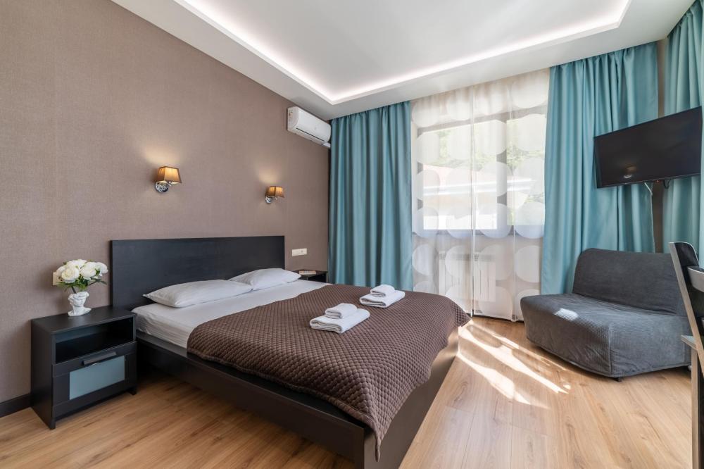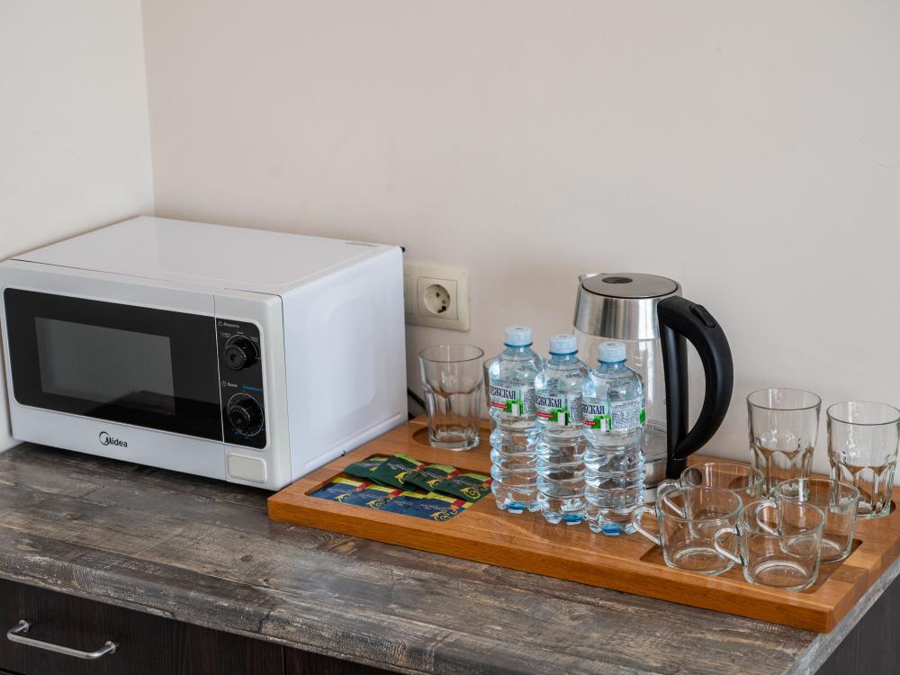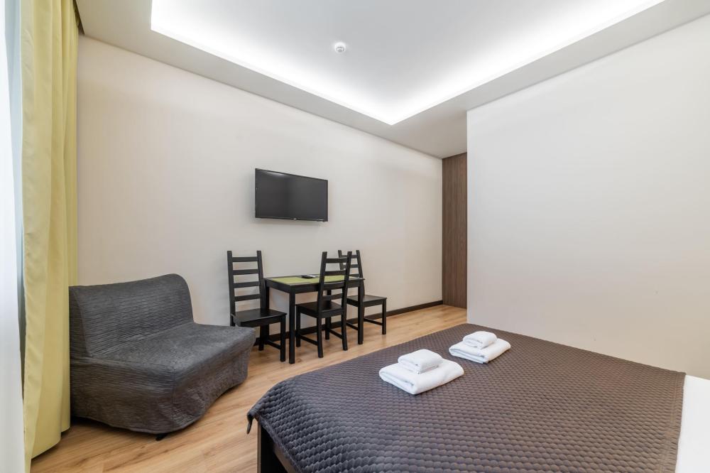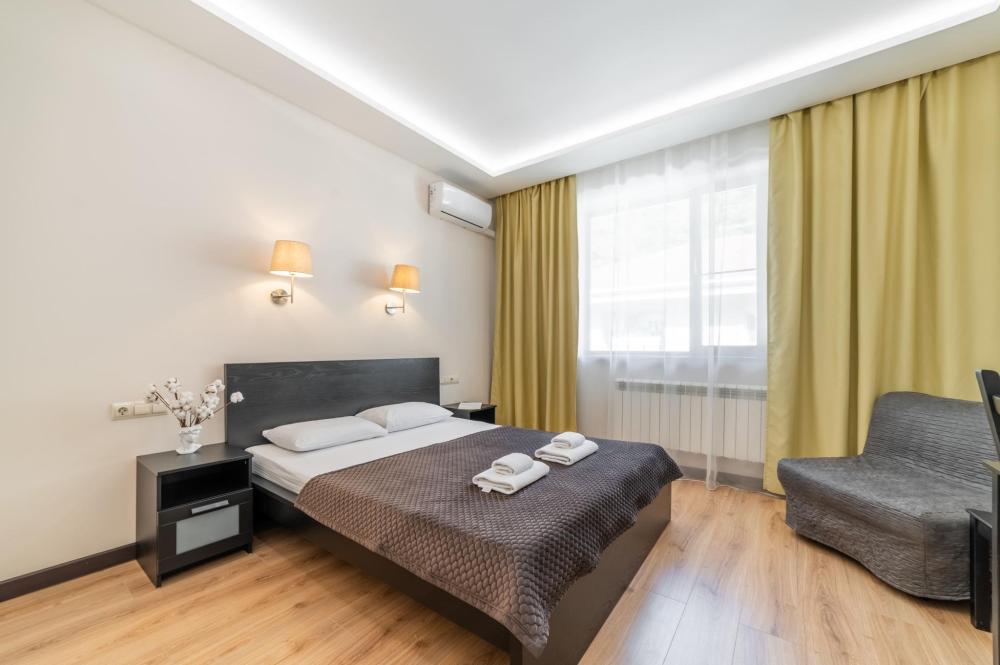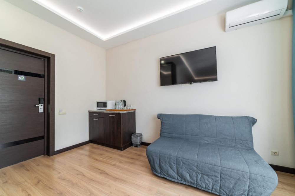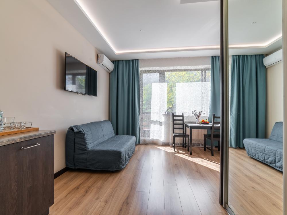 Уютный улучшенный номер, оснащен: двуспальная кровать с удобным матрасом, кресло, холодильник, плоский телевизор, кондиционер, обеденная зона, чайник, микроволновка, посуда. Также в комнате есть фен, косметические принадлежности и полотенца на каждую персону.