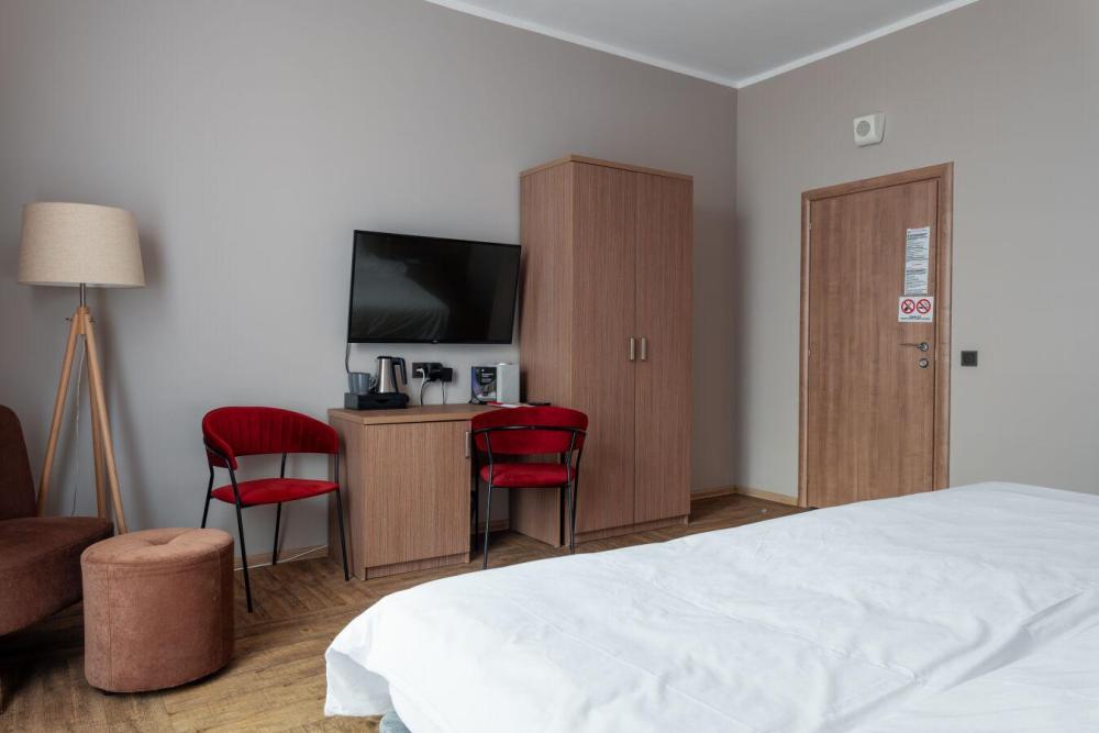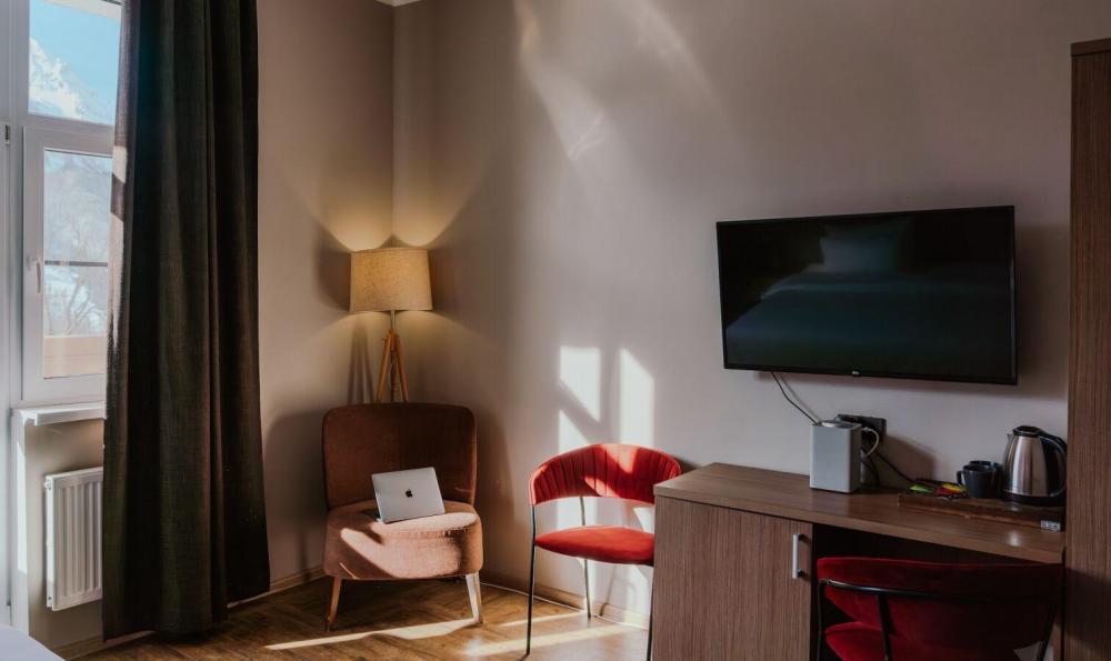 В номере: Телевизор, минихолодильник, зеркало, шкаф, 2 прикроватные тумбочки, стол, стул, лопатка для обуви. Чайник, 2 чайные пары, чайный набор: пакетированный чай, сахар, 2 Стакана, 2 бутылки воды. Совмещенный санузел в номере: Душ, туалет. Комплект полотенец для лица и тела, тапочки, косметический набор по запросу на ресепшн, мыло жидкое, фен. Уборка в номере: Влажная уборка - ежедневно. Смена полотенец и постельного белья - каждые 3-е суток.