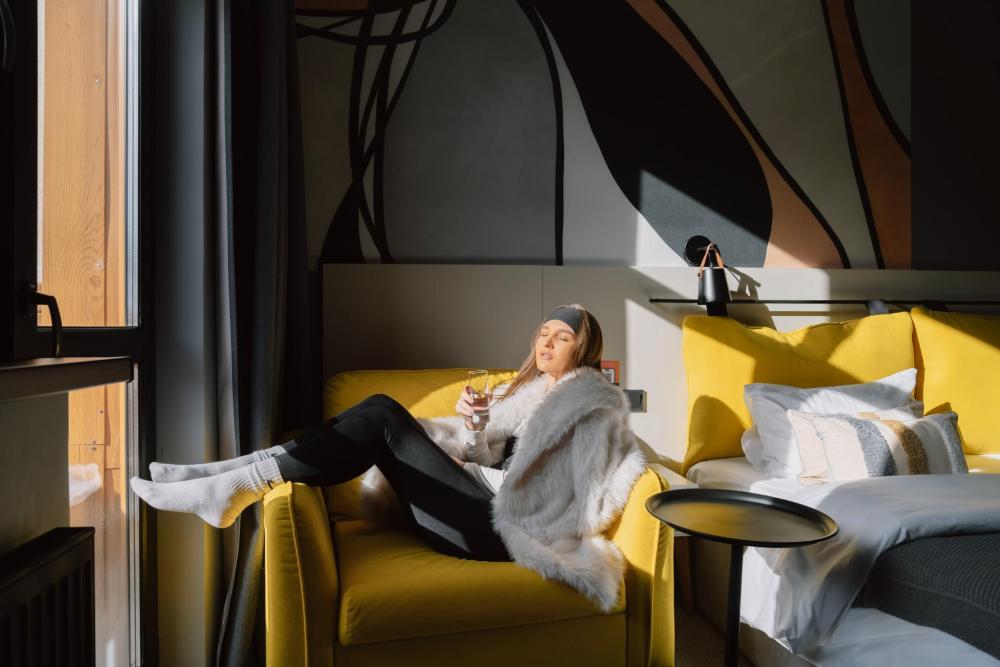 2 основных места и 1 дополнительное (за отдельную плату) Основные места: Двуспальная кровать шириной 180x200 Дополнительные места: Кресло кровать 80x200 Жилая зона: Двуспальная кровать Яндекс станция с Алисой Кресло кровать, стол, минибар Плазменным телевизором, кабельное ТВ 2 прикроватные тумбочки, пуф, щкаф для одежды Кондиционер Wi-Fi Чайный набор: две чайные пары, пакетированный чай, сахар Чайник, капсульная кофе машина с пополняемыми капсулами 2 бутылки воды 0.5 л Прихожая: Зеркало, крем для рук, шкаф для одежды , полка Совмещенный санузел в номере: Душ, туалет Комплект полотенец на каждого гостя, тапочки, халат Шампунь, кондиционер, гель для душа, мыло в дозаторе Фен По запросу на ресепшн: Набор для полости рта Влажная уборка - ежедневно Замена полотенец - ежедневно Смена постельного белья - каждые 3-е суток В отеле: Круглосуточный Room Service Кулер на каждом этаже Бесплатный Wi-Fi Лыжная комната на 1 этаже Меню подушек Прачечная самообслуживания Массажный клуб Ресторан
