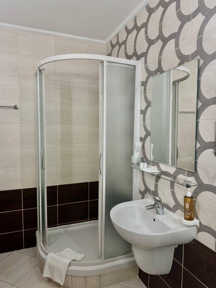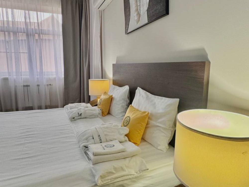 Апартаменты улучшенные 55 кв.м., с балконом. Номер состоит из прихожей, двух комнат и санузла. Одна комната, оснащена одной двуспальной кроватью. Вторая комната - это кухня, оснащенная мебелью, электроплитой и необходимым комплектом посуды.