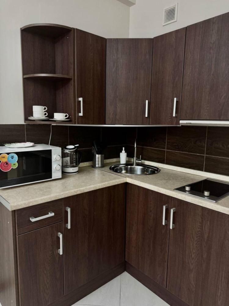 Комфортабельные номера идеально подходят для людей приехавших на долгий срок с деловым визитом или семейной пары приехавшей отдохнуть. Номер оснащен двуспальной кроватью, кухонной зоной, всей необходимой мебелью для уютного отдыха .