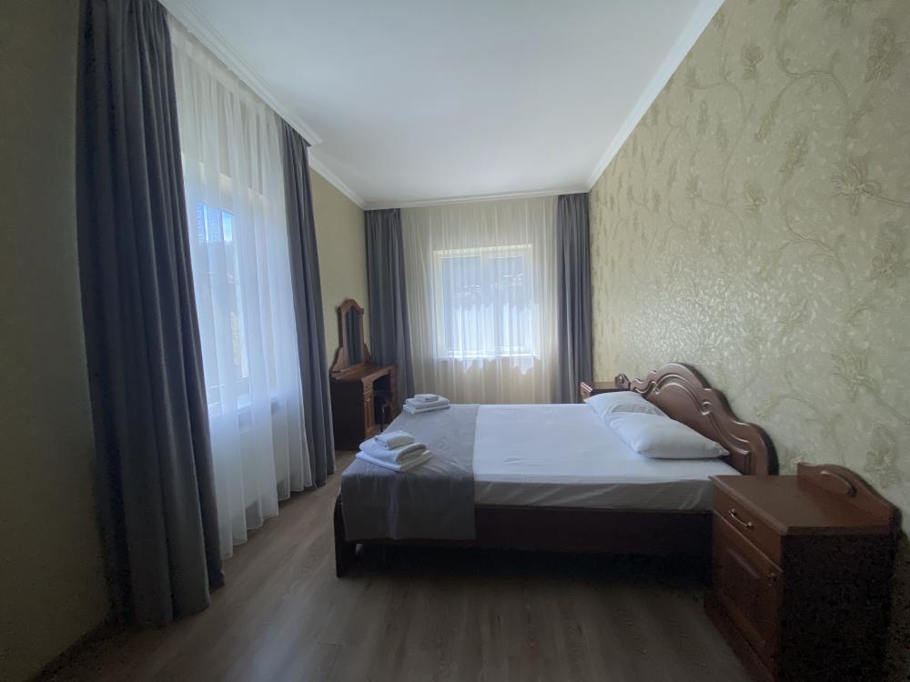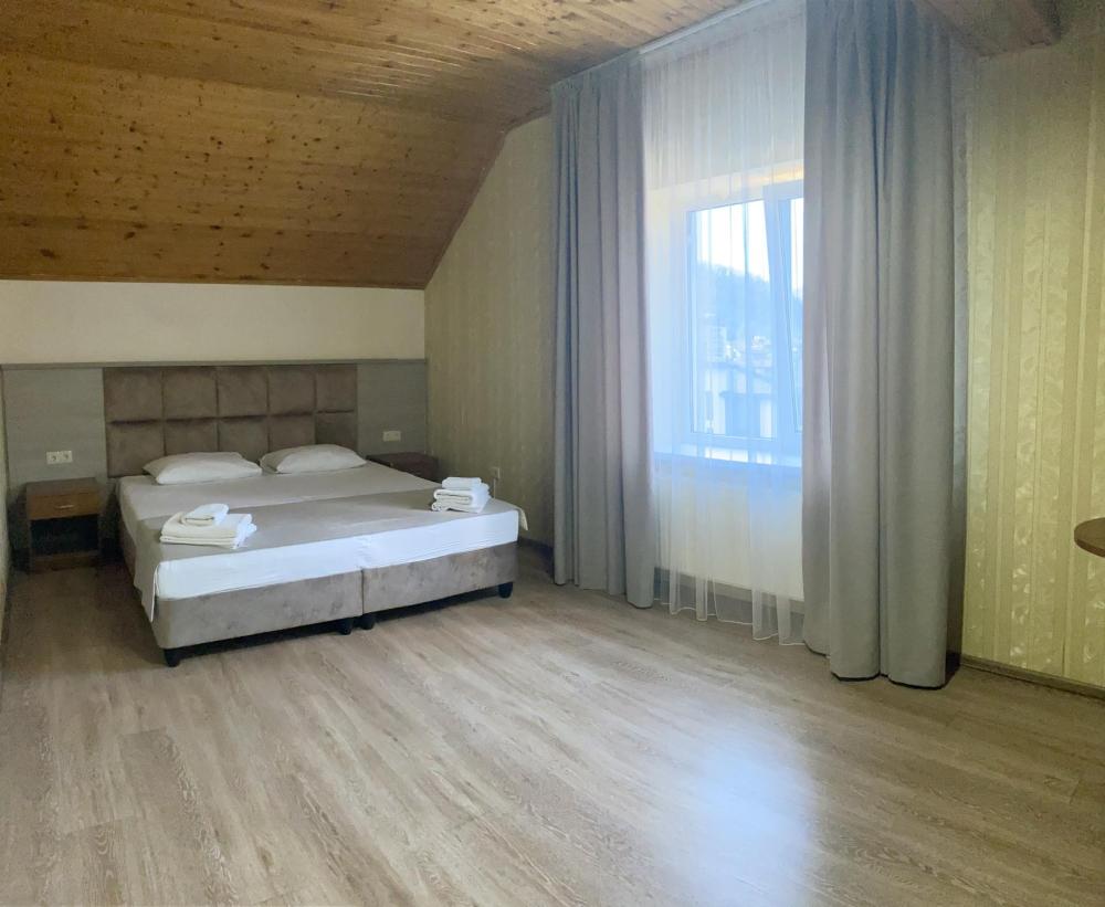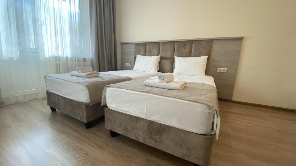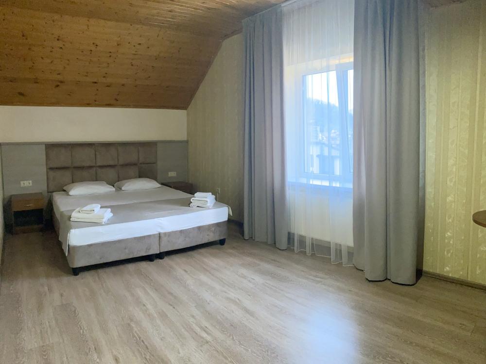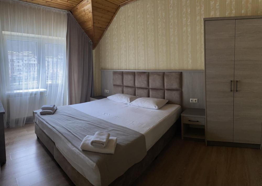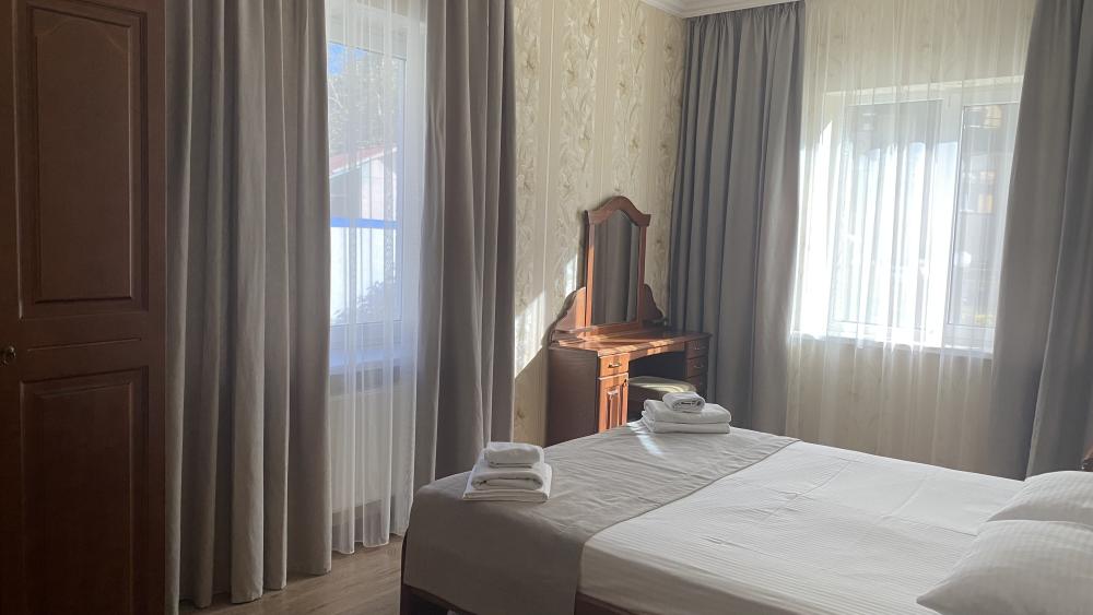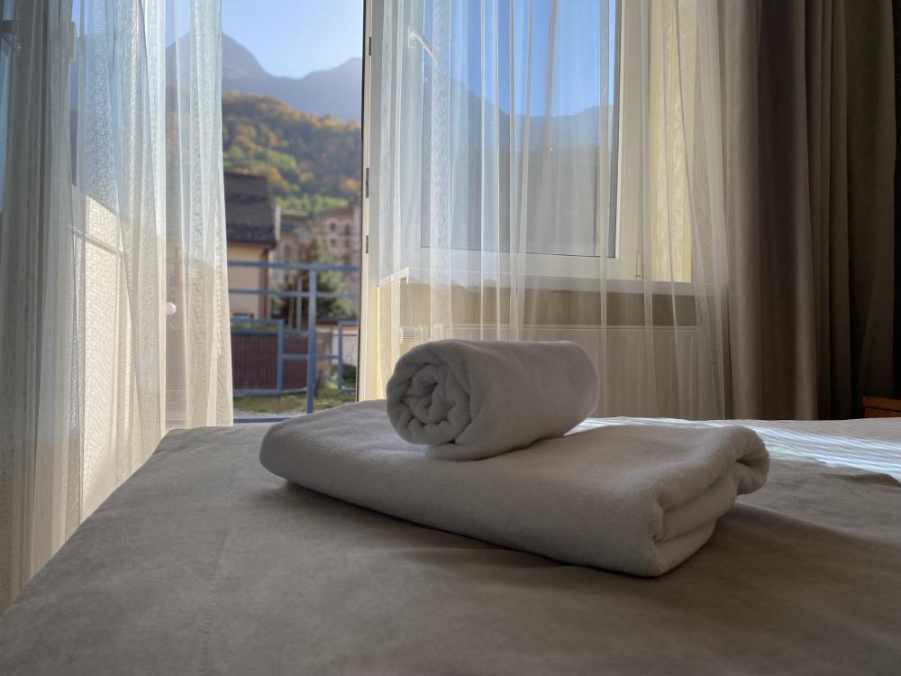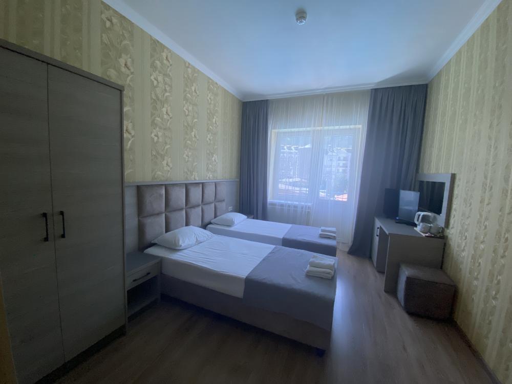 Двухкомнатный номер стандарт семейный общей площадью 50 кв.м с просторными спальнями с балконом и видом на горы, для размещения до 4-х гостей. В номере: двуспальная кровать и две односпальные с ортопедическими матрасами, ванная комната туалет с биде, комплект полотенец, набор принадлежностей для ванных комнат, фен, чайник, холодильник, обеденный стол, телевизор.