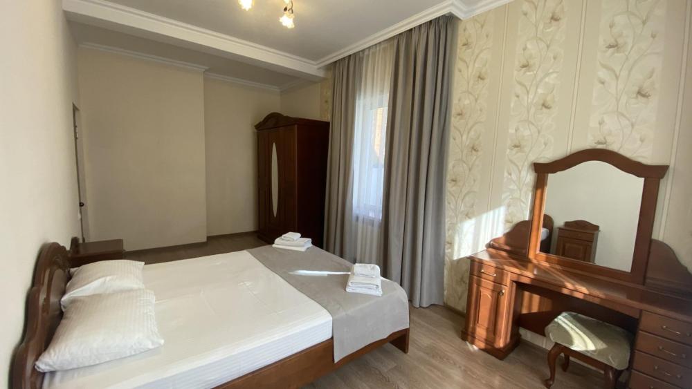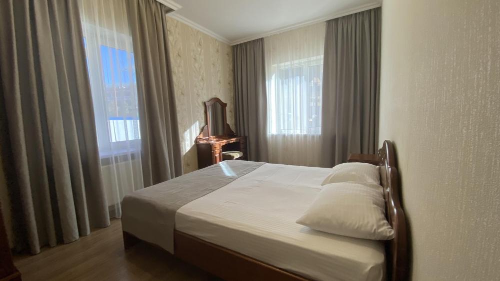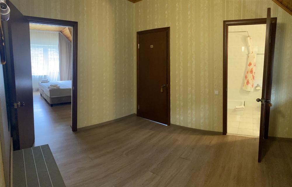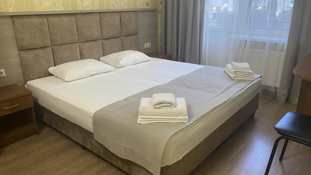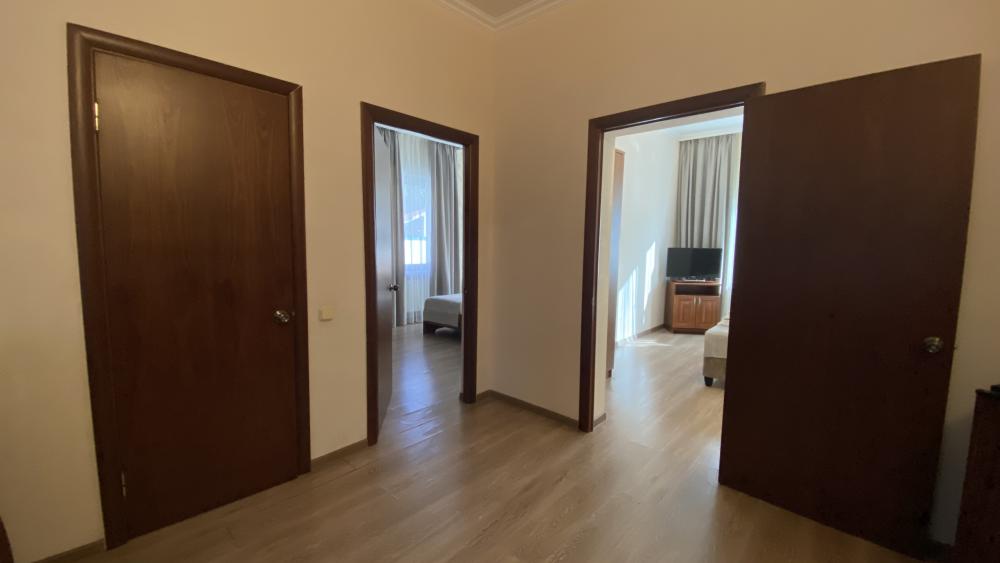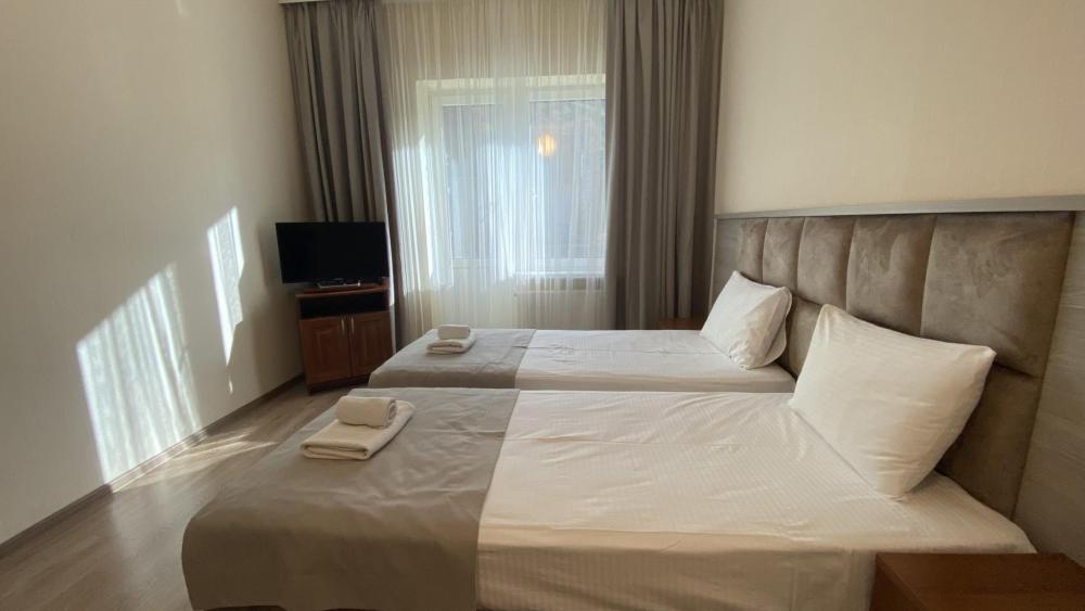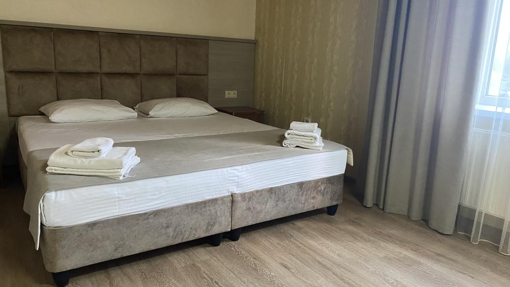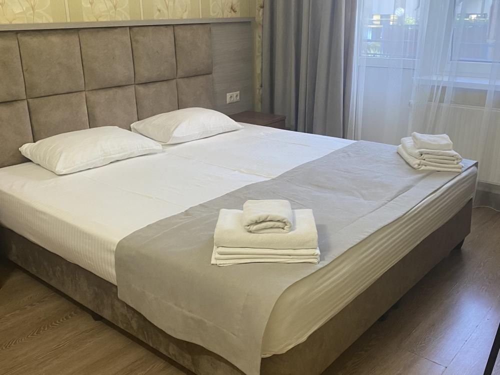 Двухкомнатный номер стандарт семейный общей площадью 50 кв.м с просторными спальнями с балконом и видом на горы, для размещения до 4-х гостей. В номере: двуспальная кровать и две односпальные с ортопедическими матрасами, ванная комната туалет с биде, комплект полотенец, набор принадлежностей для ванных комнат, фен, чайник, холодильник, обеденный стол, телевизор.