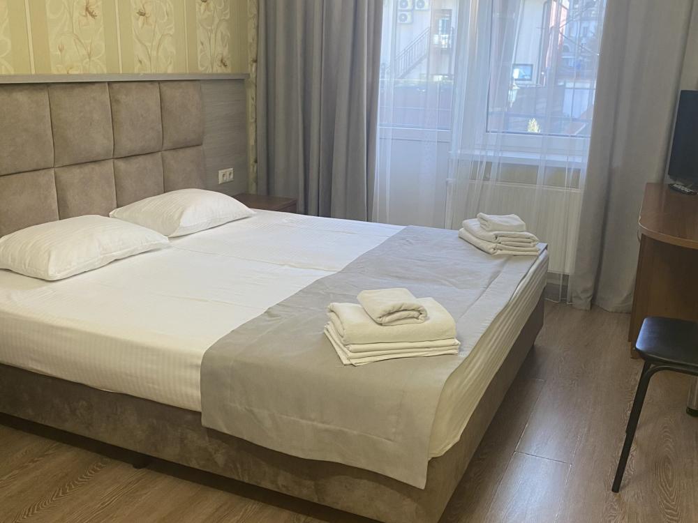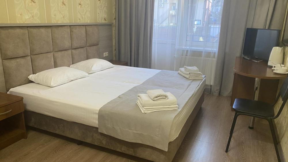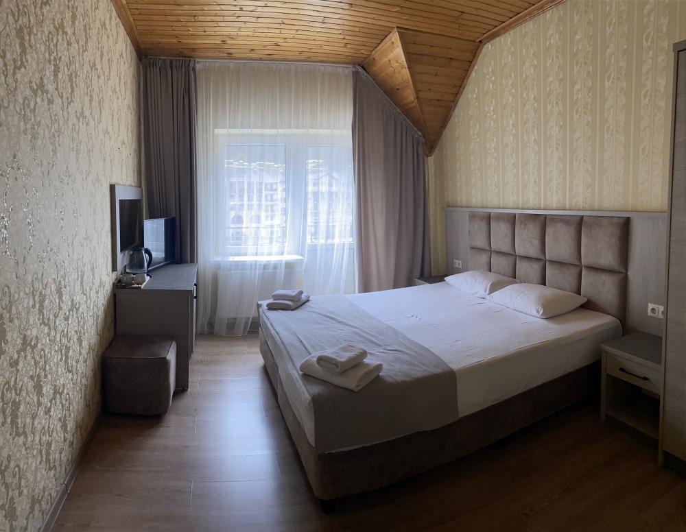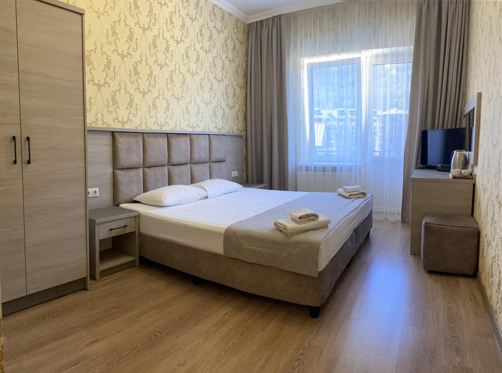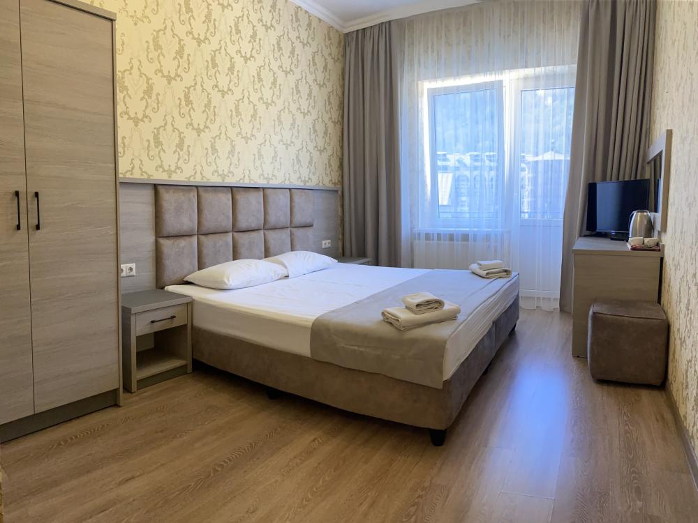 Однокомнатный номер стандарт с балконом и видом на горы 20 кв.м. для размещения до 2-х гостей. В номере: двуспальная кровать, ванная комната душ, комплект полотенец, набор принадлежностей для ванных комнат, фен, чайник, холодильник, шкаф платяной, набор посуды, телевизор. Номера расположены с 1 по 4 этажи.
