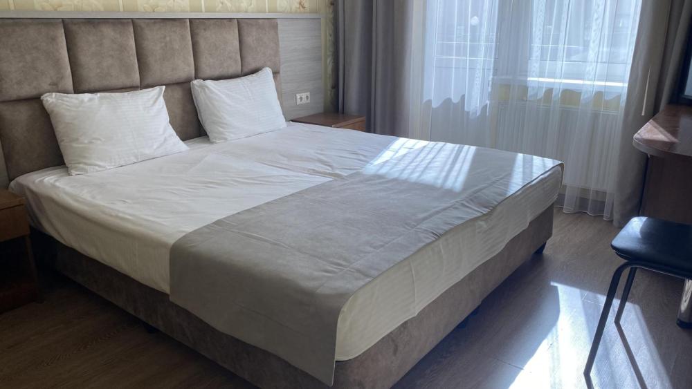 Номер стандарт (без балкона) площадью 20 кв.м. для размещения до 2-х гостей, находится на 4 этаже. Оснащение номера: двухспальная кровать, комплект полотенец, набор принадлежностей для ванных комнат, фен, чайник, холодильник, шкаф платяной, набор посуды, телевизор, ванная комната, душ.