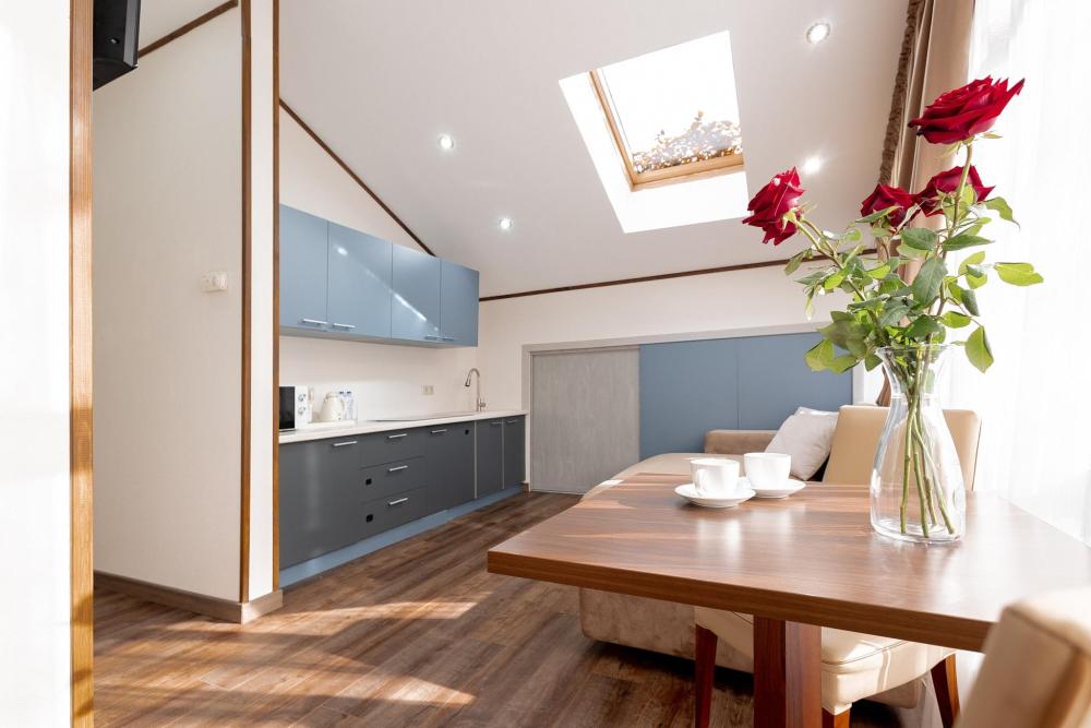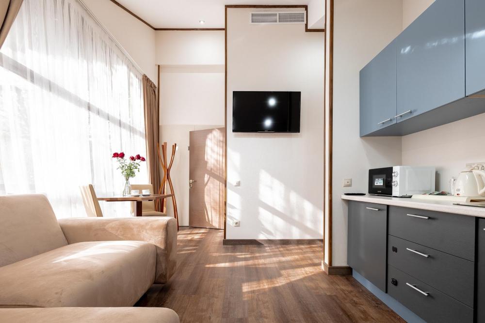 Апартаменты семейные 38 м² — Villa Ariana Просторные апартаменты с кухней-гостиной, гардеробной и санузлом. Включены завтраки, СПА, уборка каждые 3 дня. Подходит для отдыха и долгосрочного проживания в Красной Поляне.